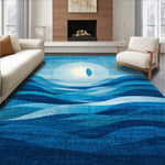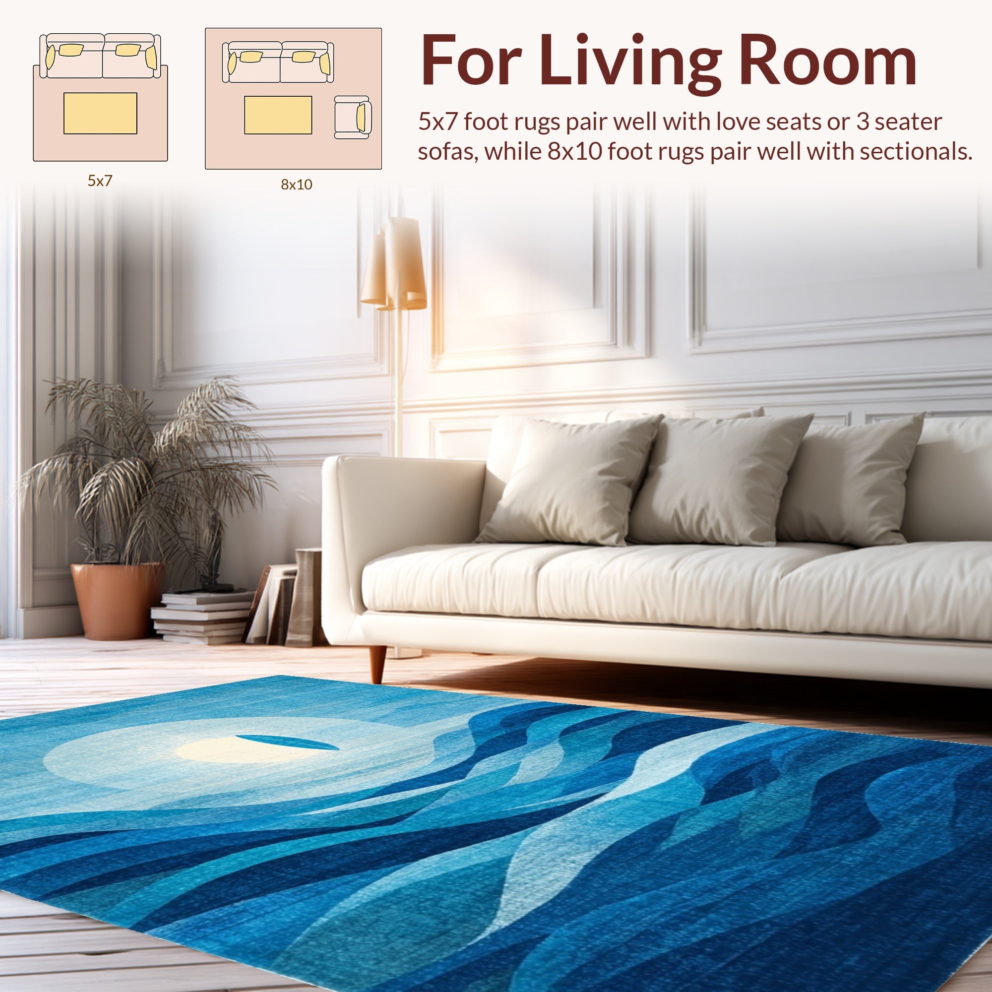 Ultra Soft Area Rug, Non Slip, Stain Resistant, Washable Area Rugs for Living Room, Bedroom, Beachy Crest Surfboard Rug With Undulating Wave Lines And Subtle Sun Motif(Blue) Overview: