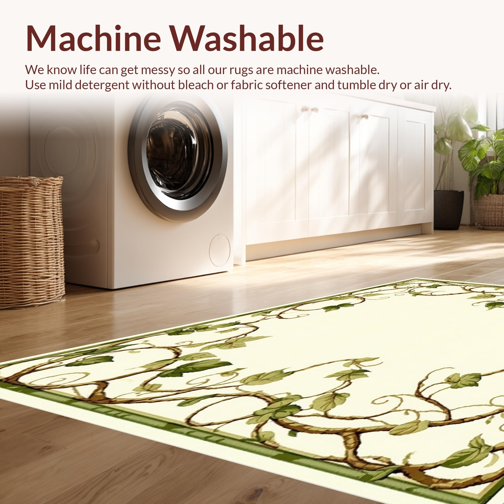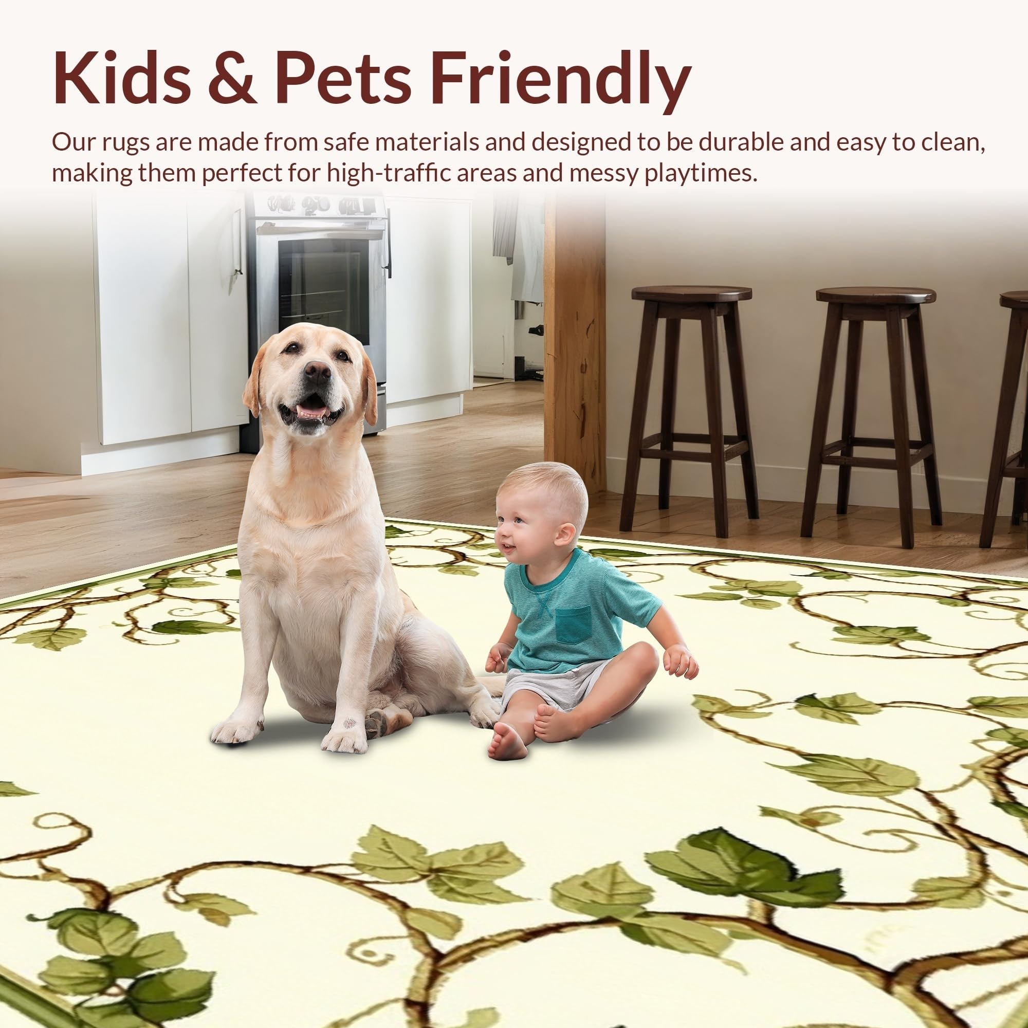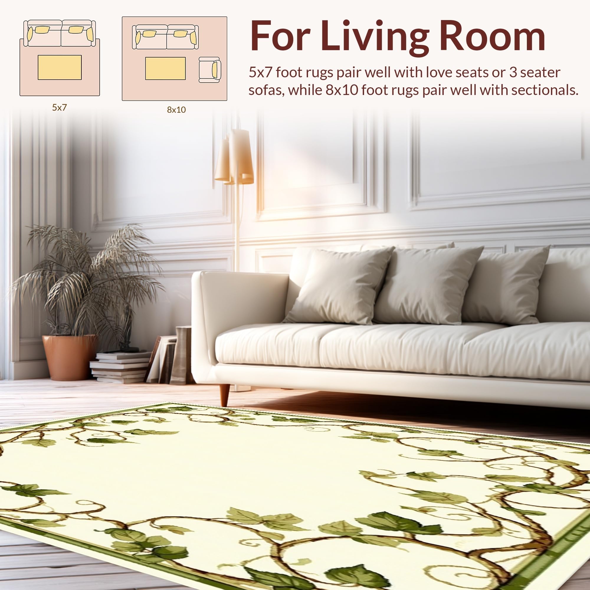 Ultra Soft Area Rug, Non Slip, Stain Resistant, Washable Area Rugs for Living Room, Bedroom, Beige Green Botanical Scrollwork Easy Clean Medium Pile(Beige) Overview: