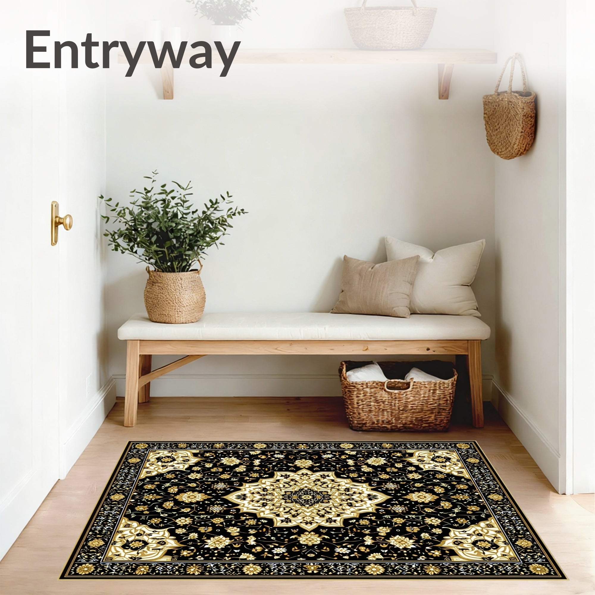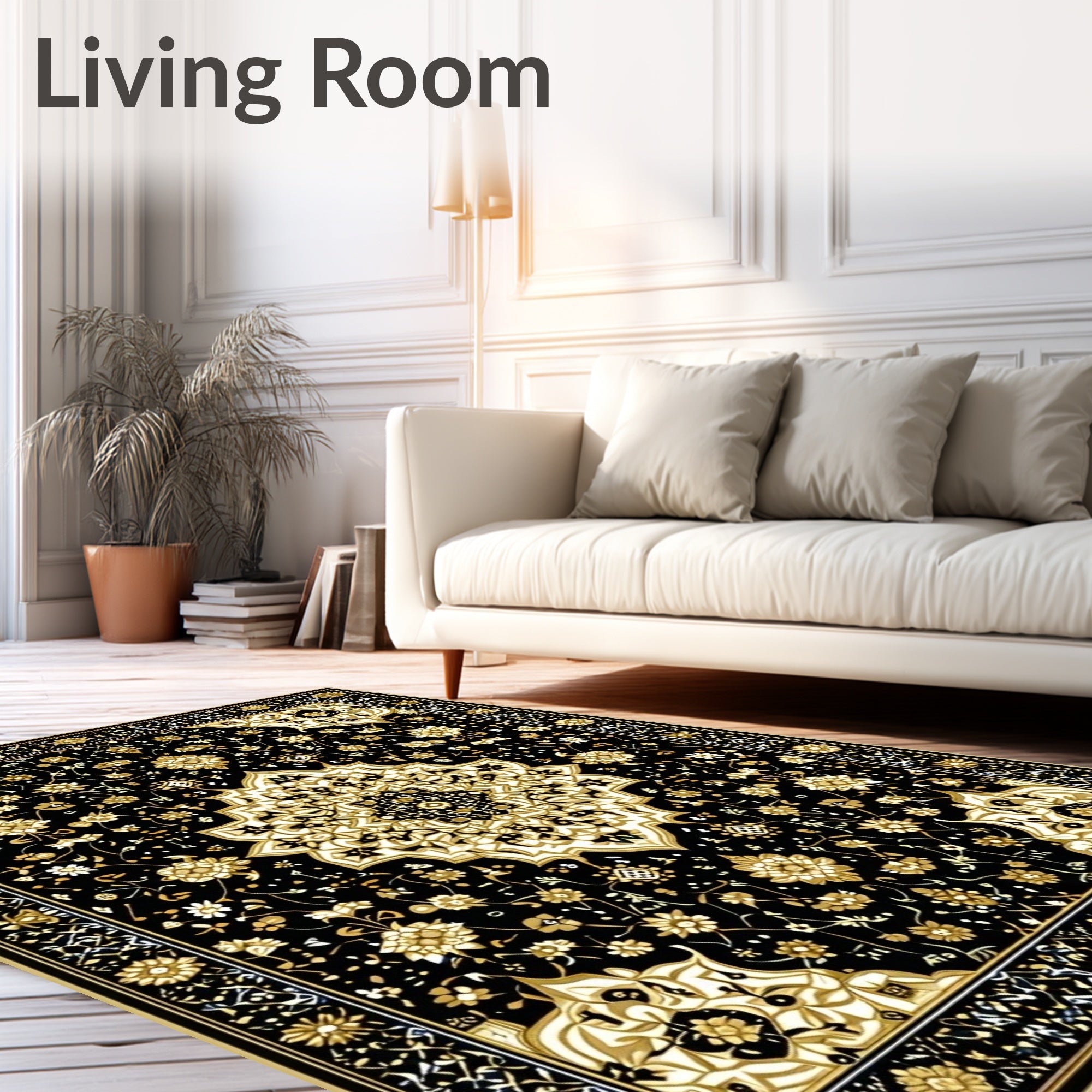 Flatwoven High Traffic Area Rug, Black Gold Flannel for Comfort, Non Slip, Stain Resistant, Washable Area Rugs for Living Room, Bedroom (Black) Overview: