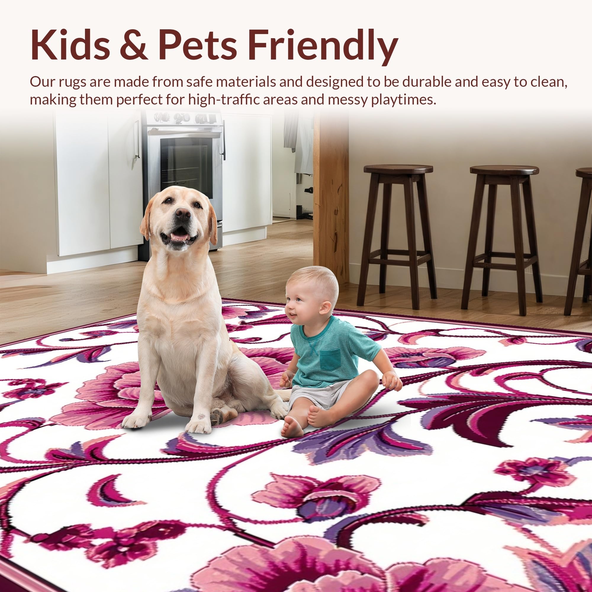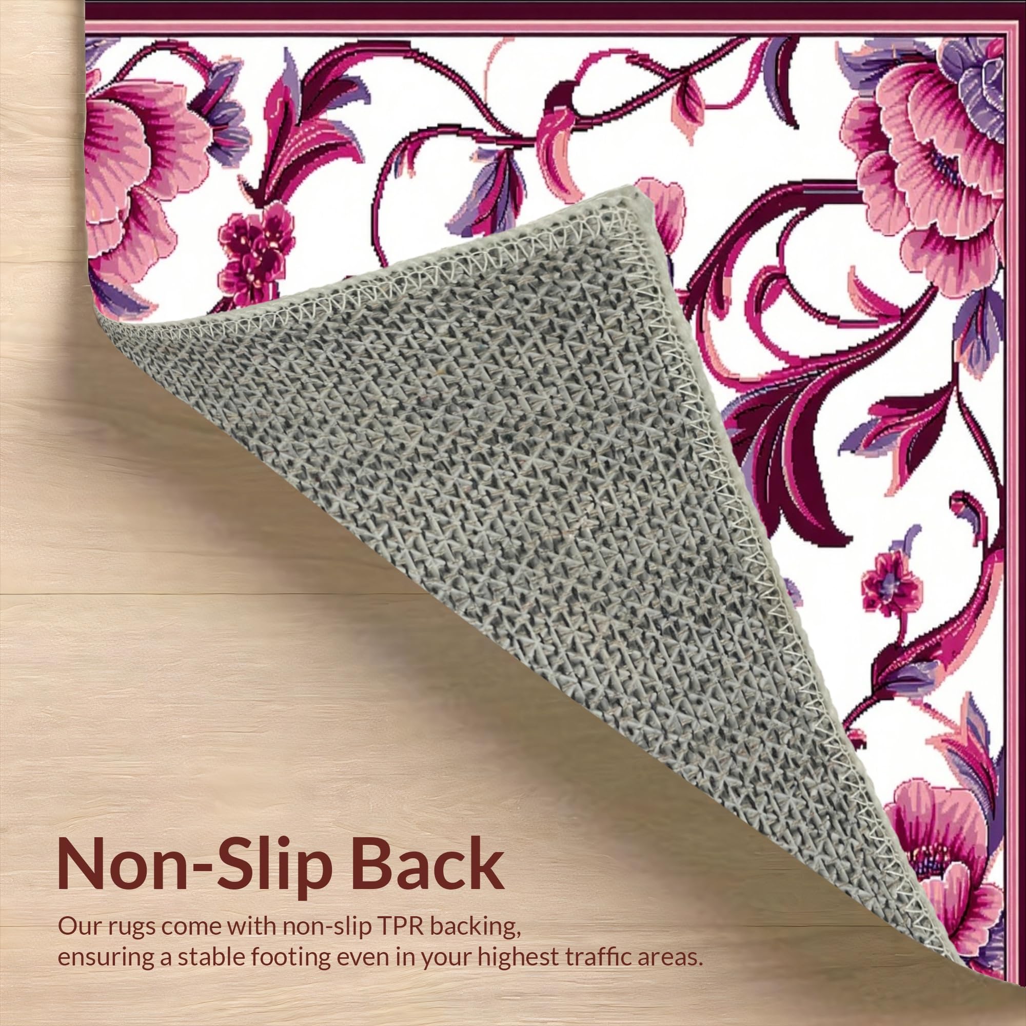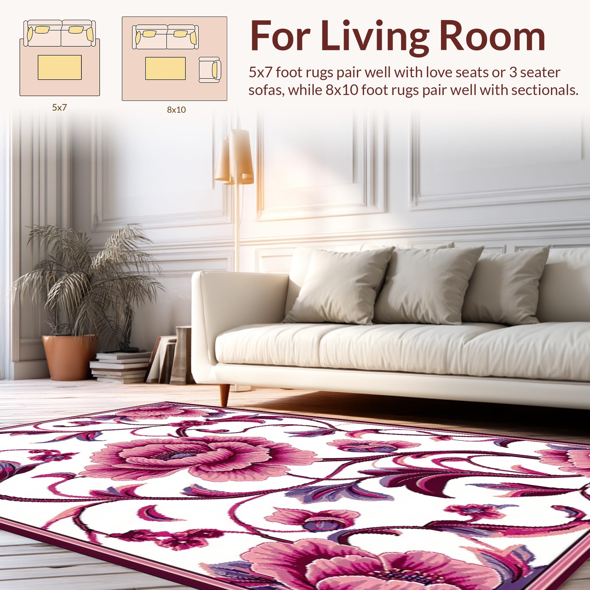Ultra Soft Area Rug, Non Slip, Stain Resistant, Washable Area Rugs for Living Room, Bedroom, Blooming Carnation Scroll with Layered Petal Motifs and Flourishing Vines(Mauve) Overview: