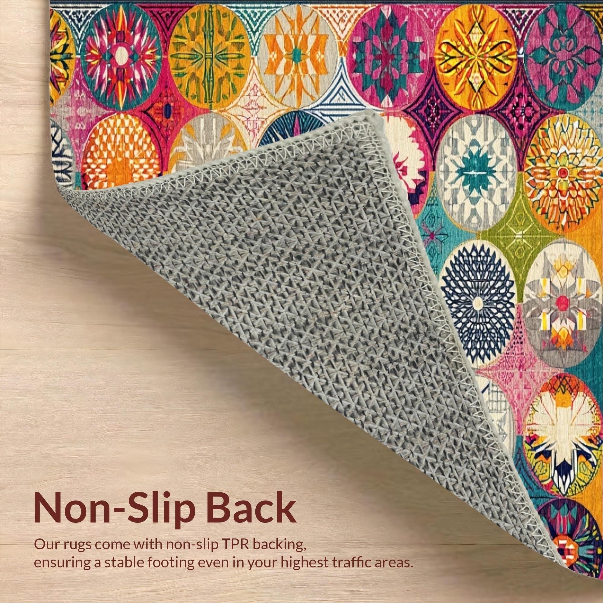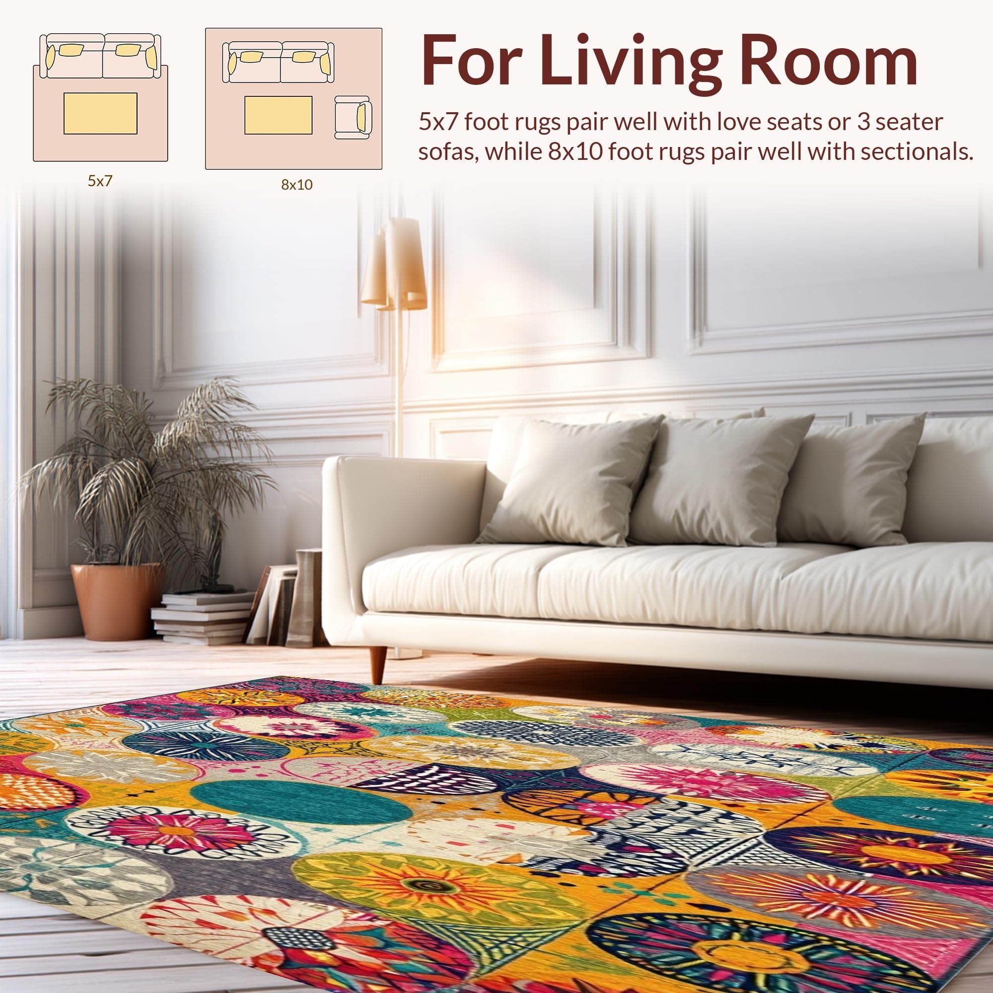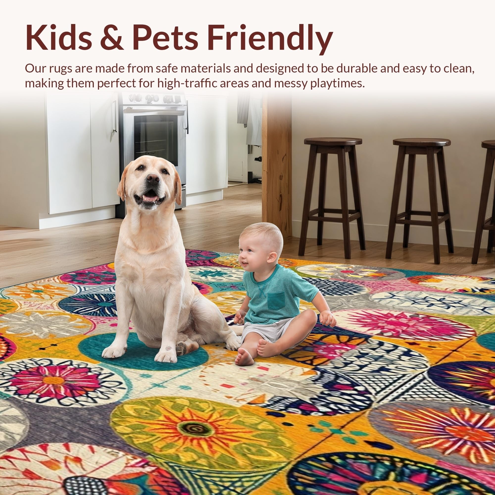 Ultra Soft Area Rug, Non Slip, Stain Resistant, Washable Area Rugs for Living Room, Bedroom, Bohemian Style Round Colorful Circle Design(Yellow) Overview: