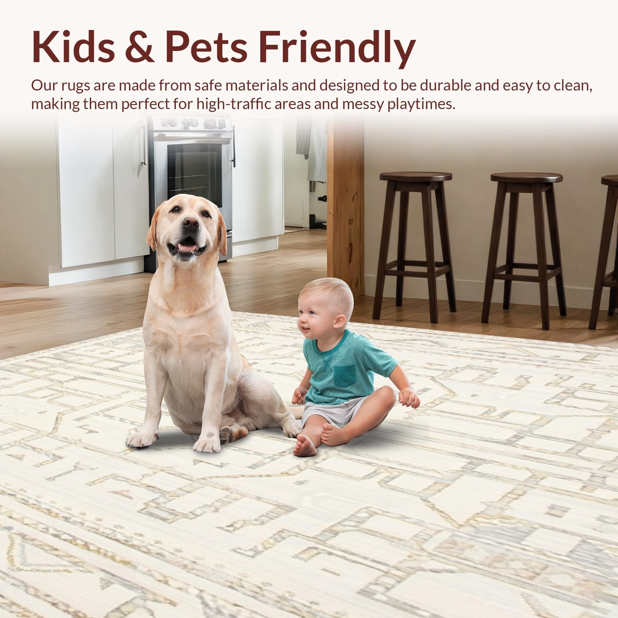 Ultra Soft Area Rug, Non Slip, Stain Resistant, Washable Area Rugs for Living Room, Bedroom, Boho Chic Area Featuring Abstract Ivory Geometric Shapes(Beige) Overview: