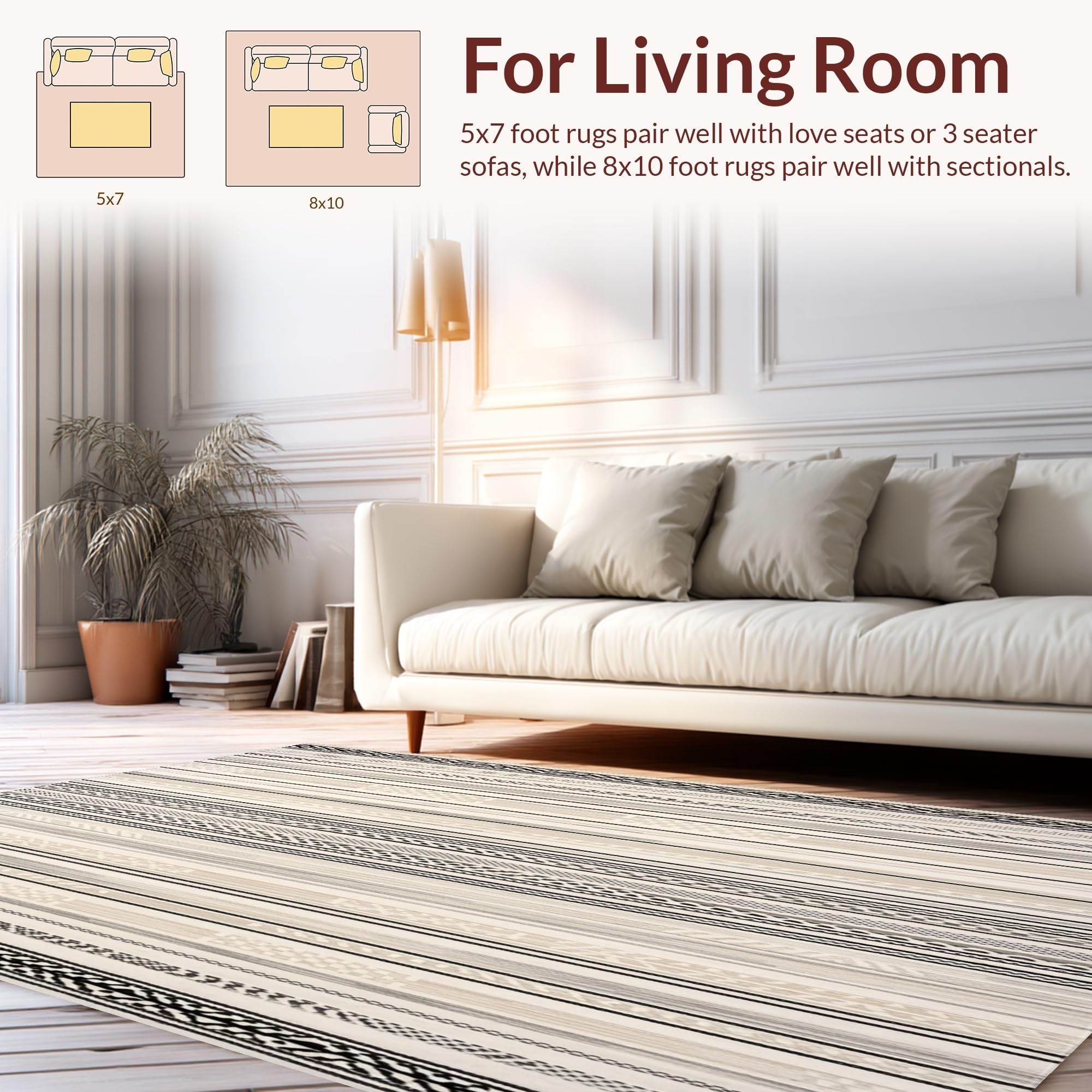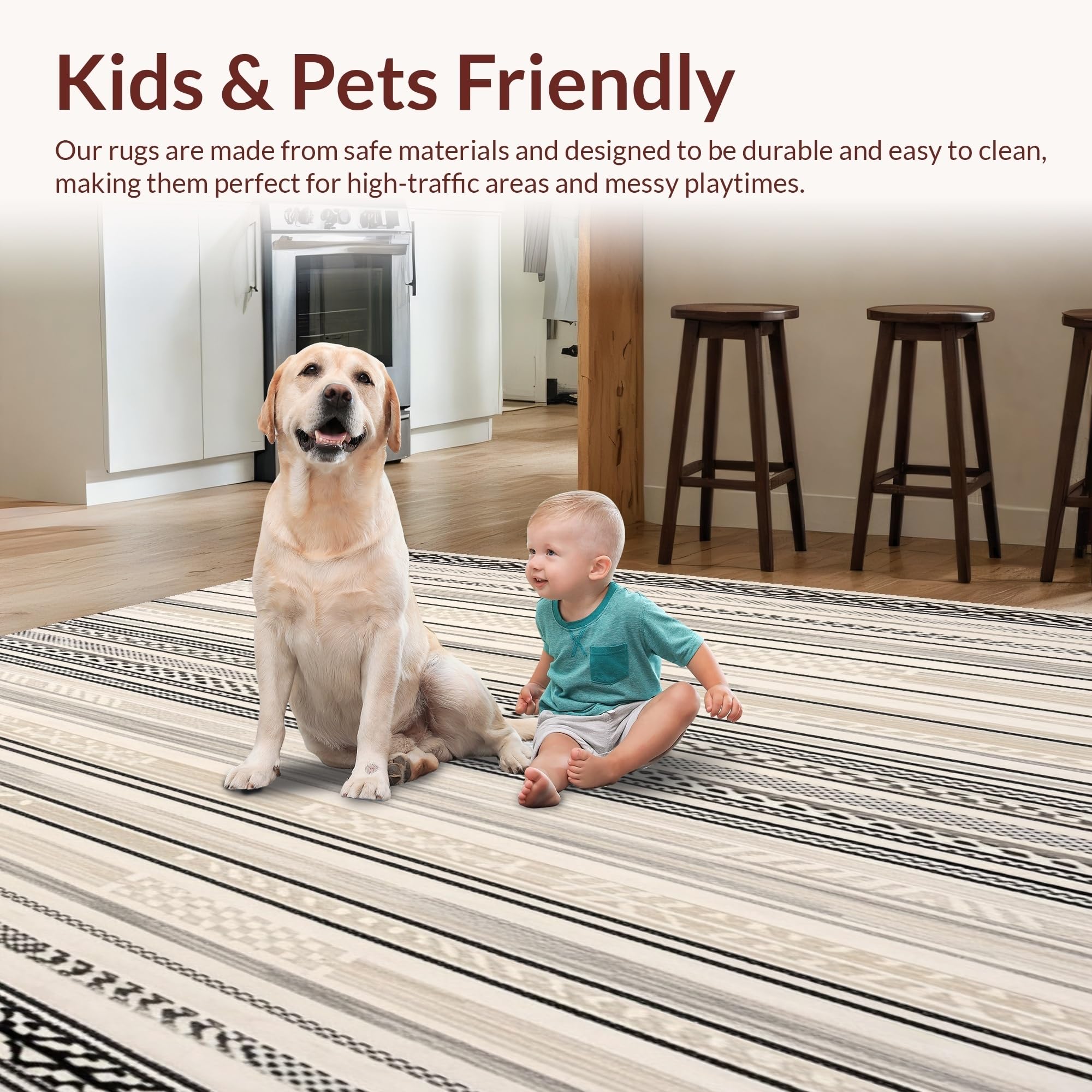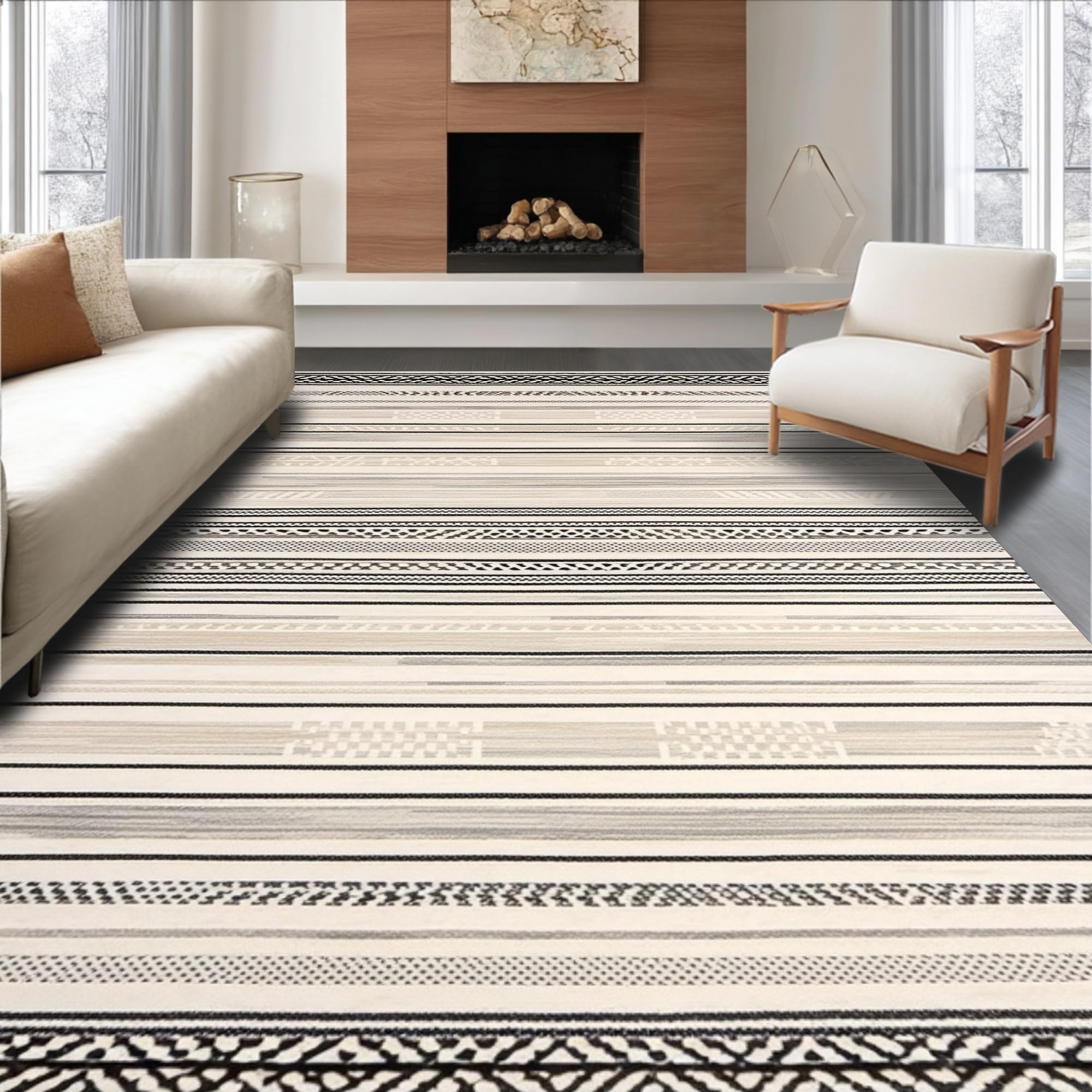 Ultra Soft Area Rug, Non Slip, Stain Resistant, Washable Area Rugs for Living Room, Bedroom, Boho Chic Area with Tribal Inspired Stripes and Muted Sand Accents(Gray) Overview:
