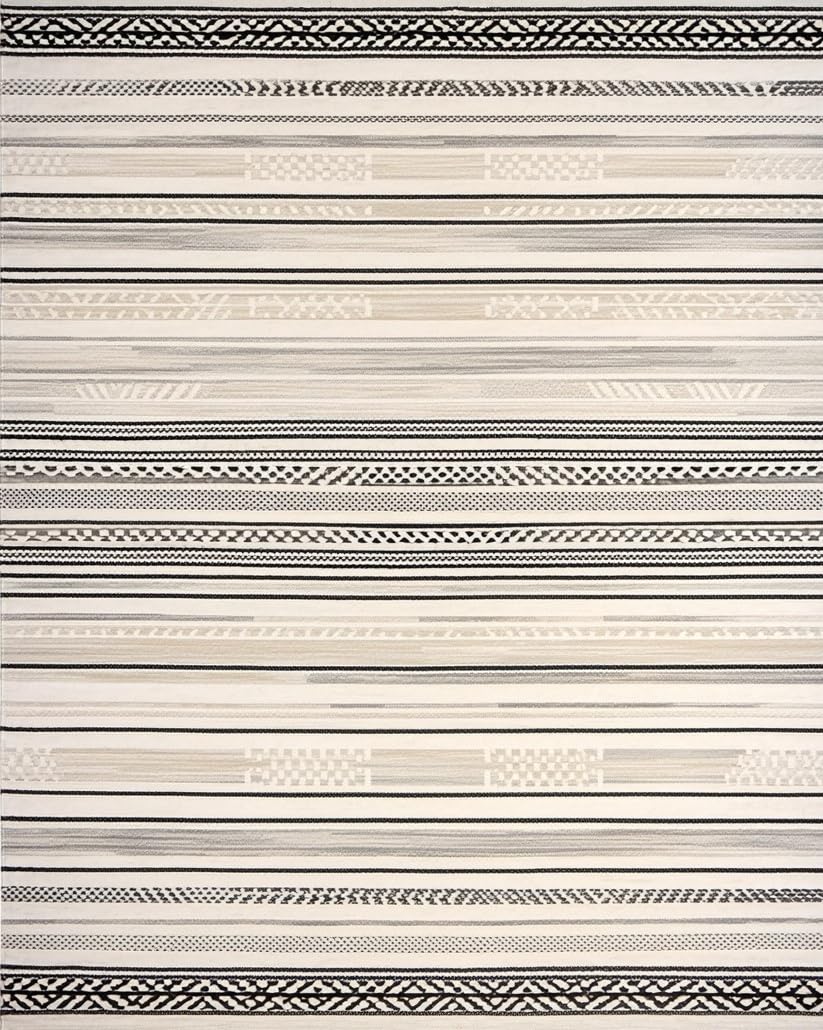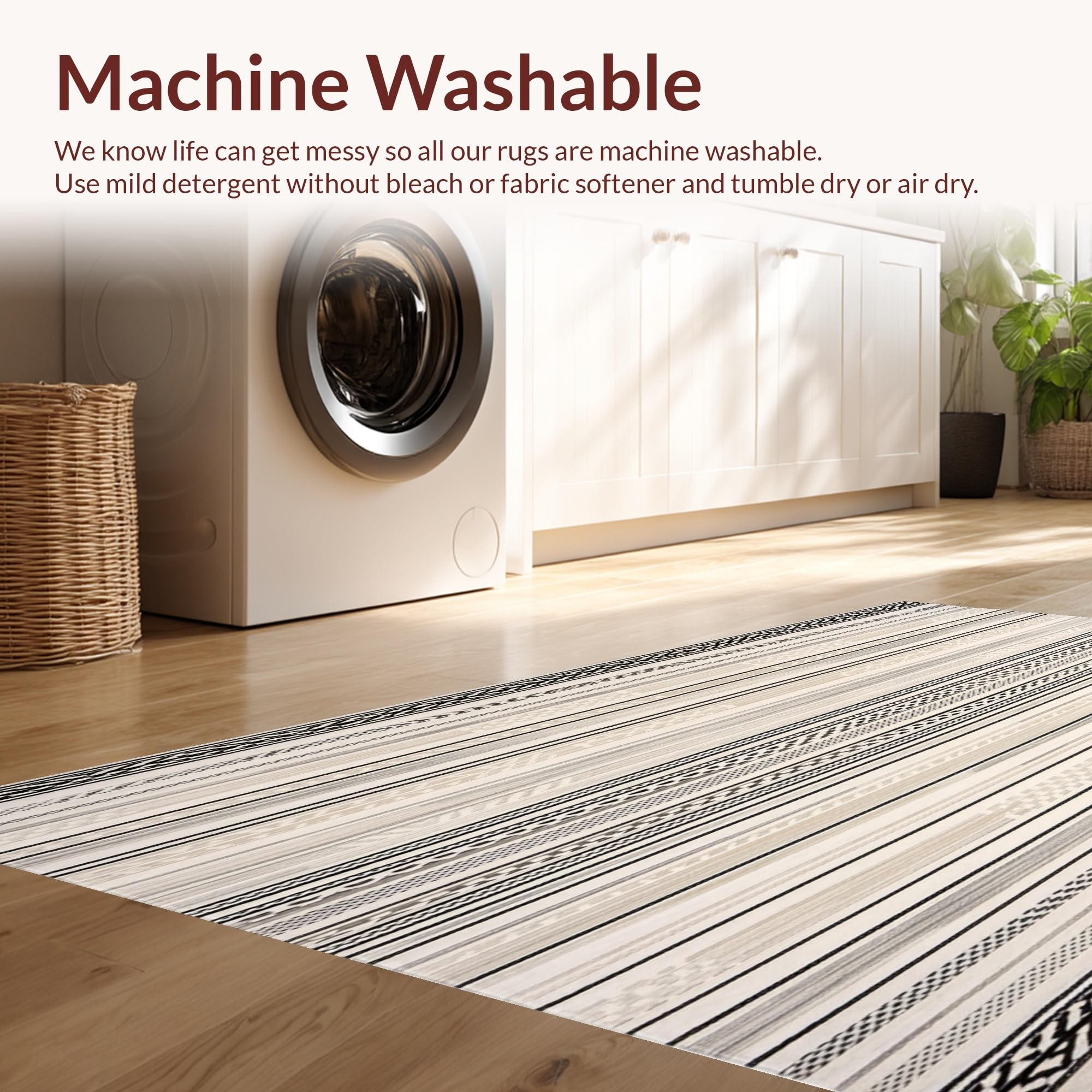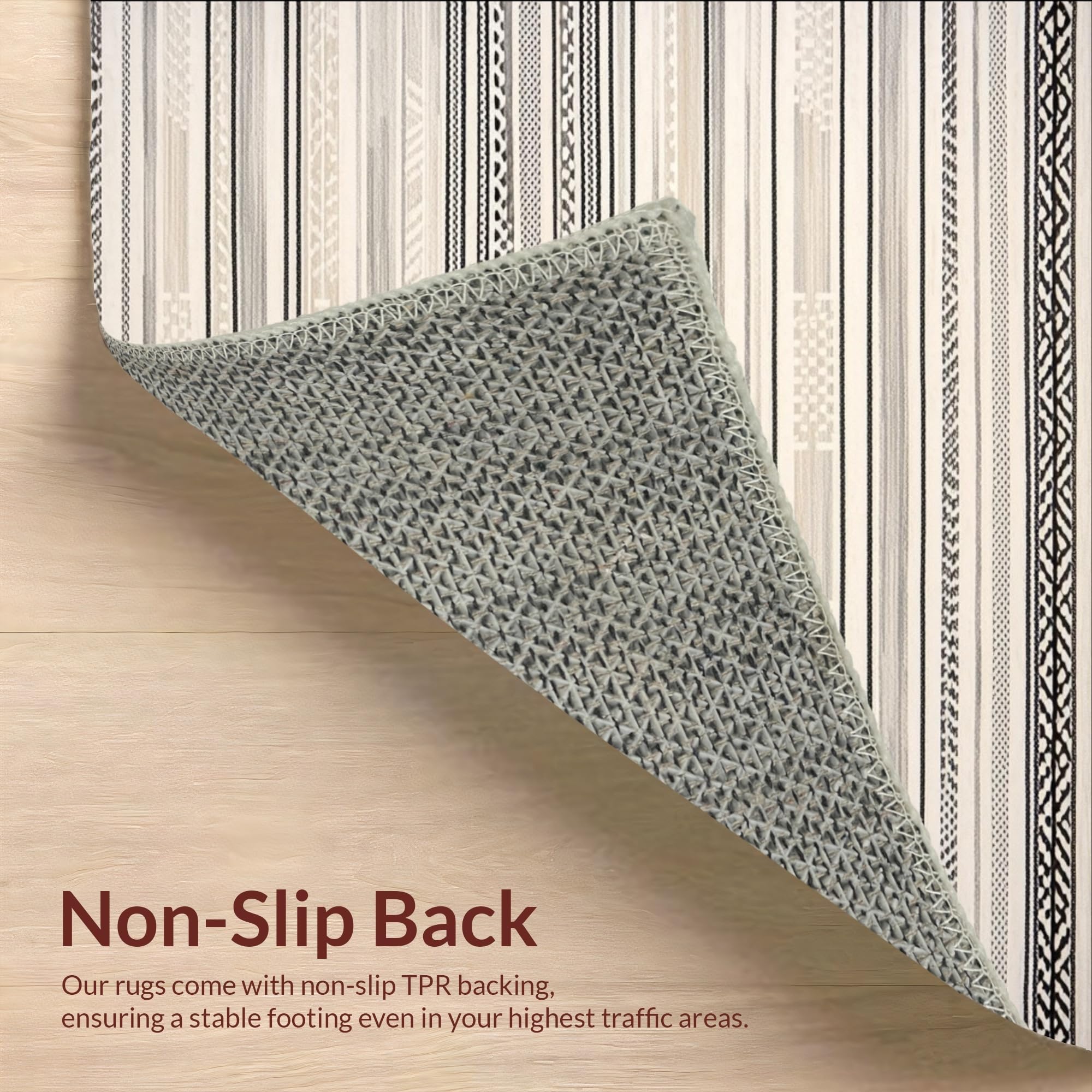 Ultra Soft Area Rug, Non Slip, Stain Resistant, Washable Area Rugs for Living Room, Bedroom, Boho Chic Area with Tribal Inspired Stripes and Muted Sand Accents(Gray) Overview: