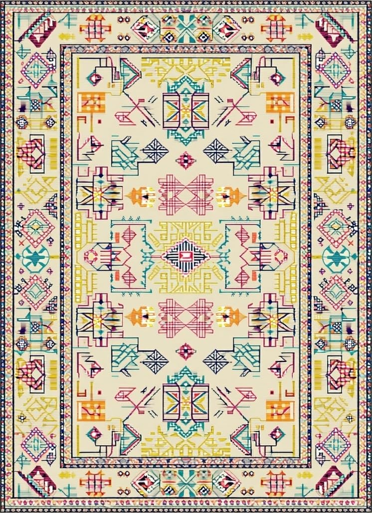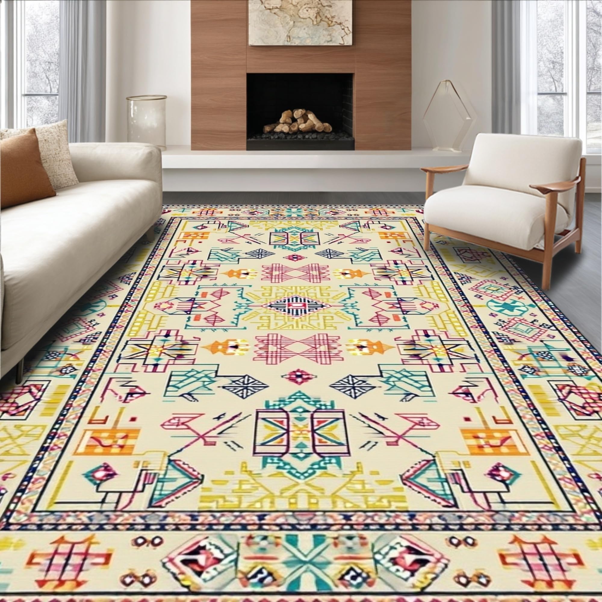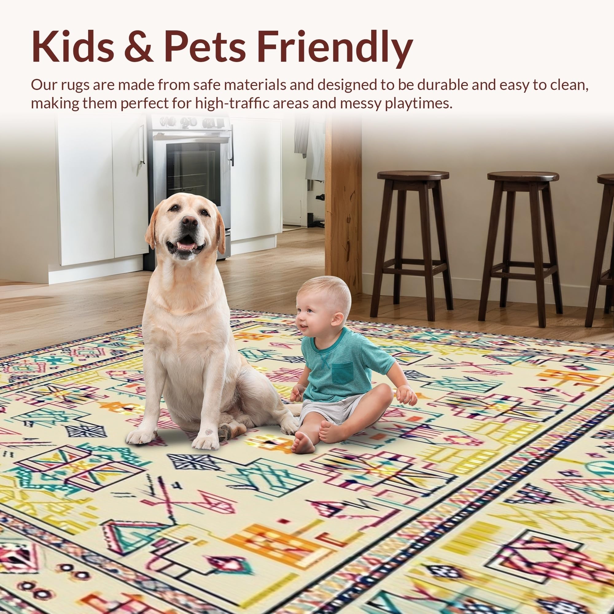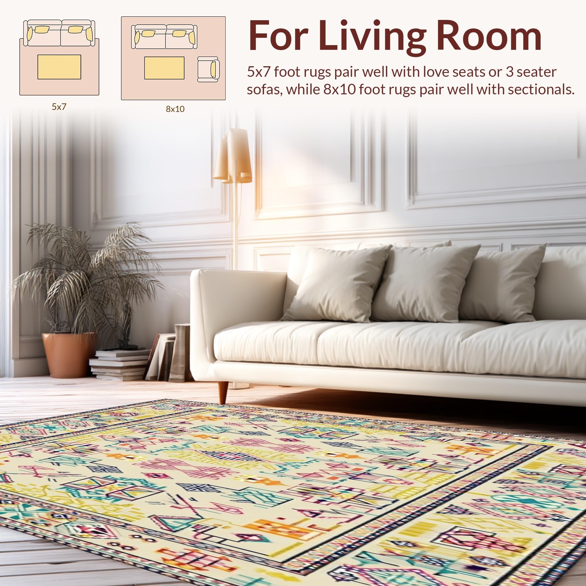 Ultra Soft Area Rug, Non Slip, Stain Resistant, Washable Area Rugs for Living Room, Bedroom, Boho Chic Beige Area with Multi Colored Geometric(Beige) Overview: