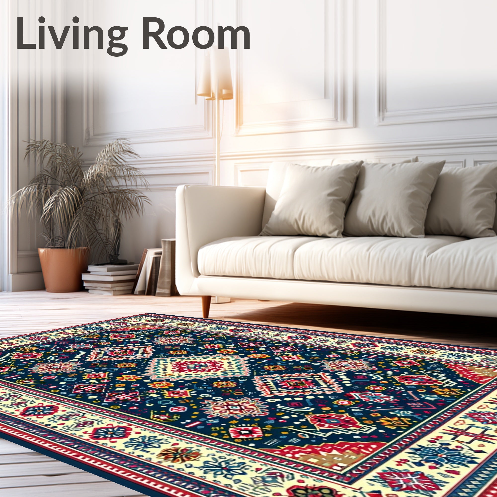 Flatwoven High Traffic Area Rug, Boho with Large Design, Non Slip, Stain Resistant, Washable Area Rugs for Living Room, Bedroom (Blue) Overview: