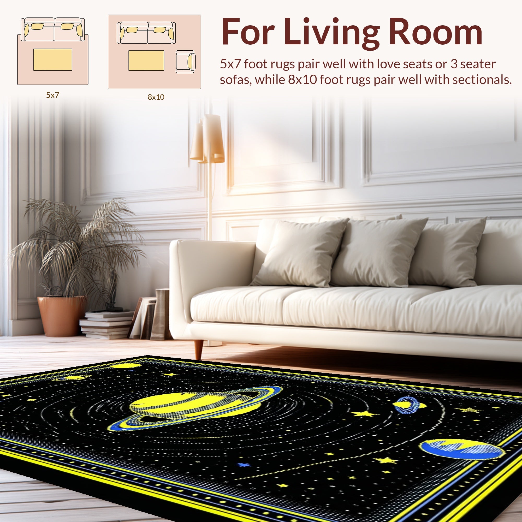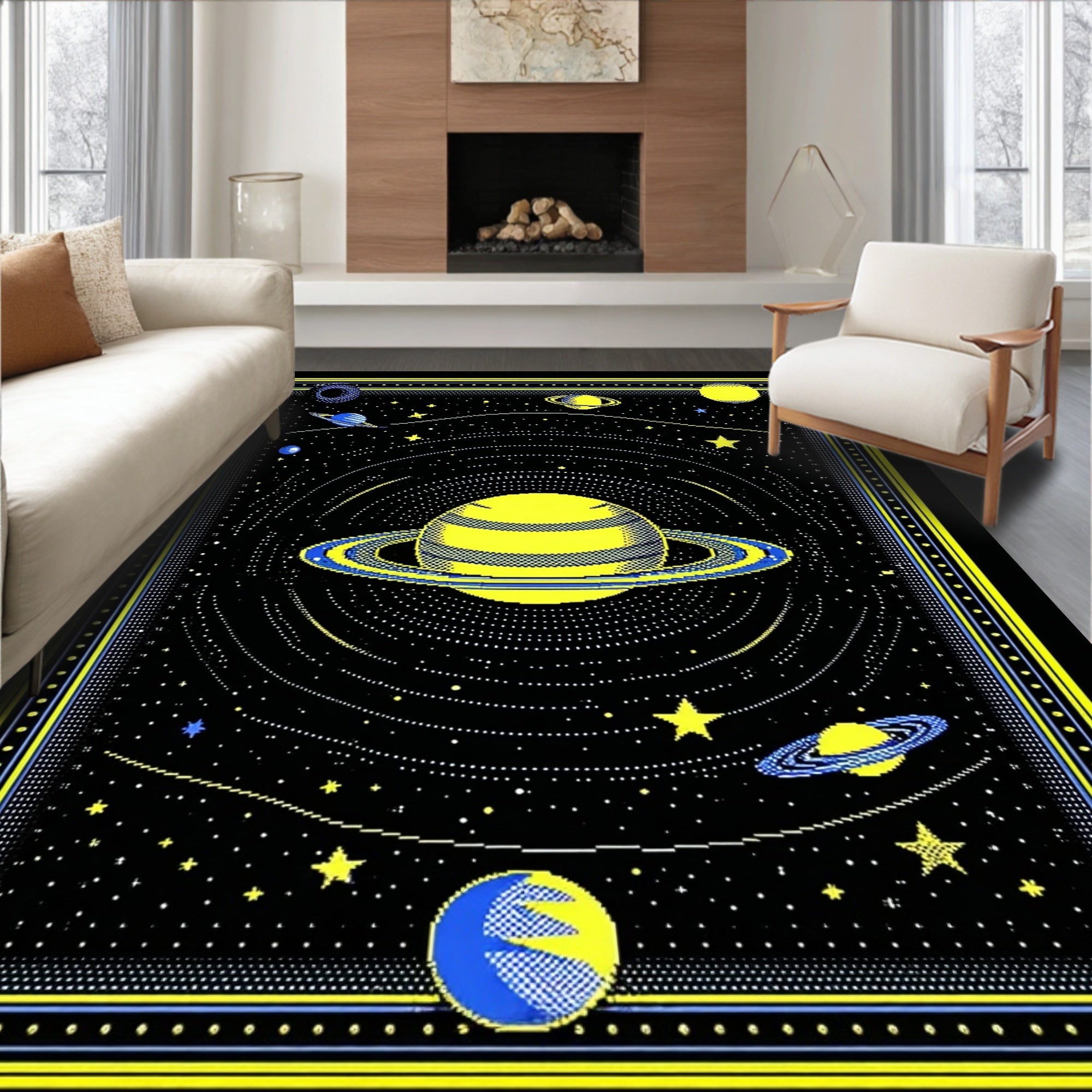 Flatwoven High Traffic Area Rug, Bold Astronomical Shape Arrangement, Non Slip, Stain Resistant, Washable Area Rugs for Living Room, Bedroom (Yellow) Overview: