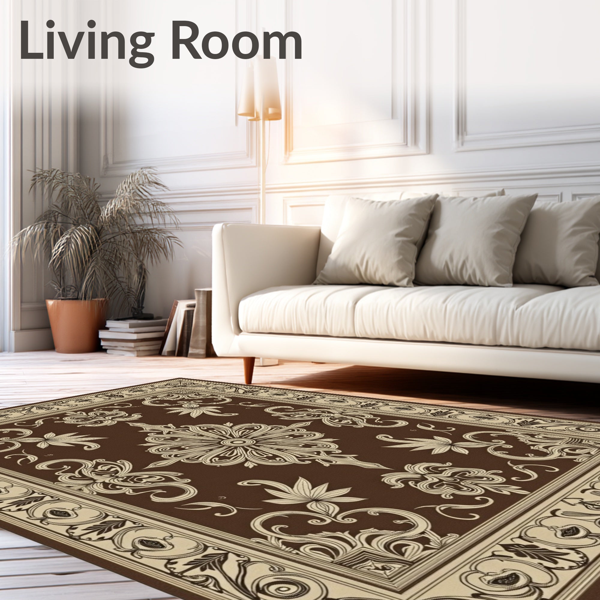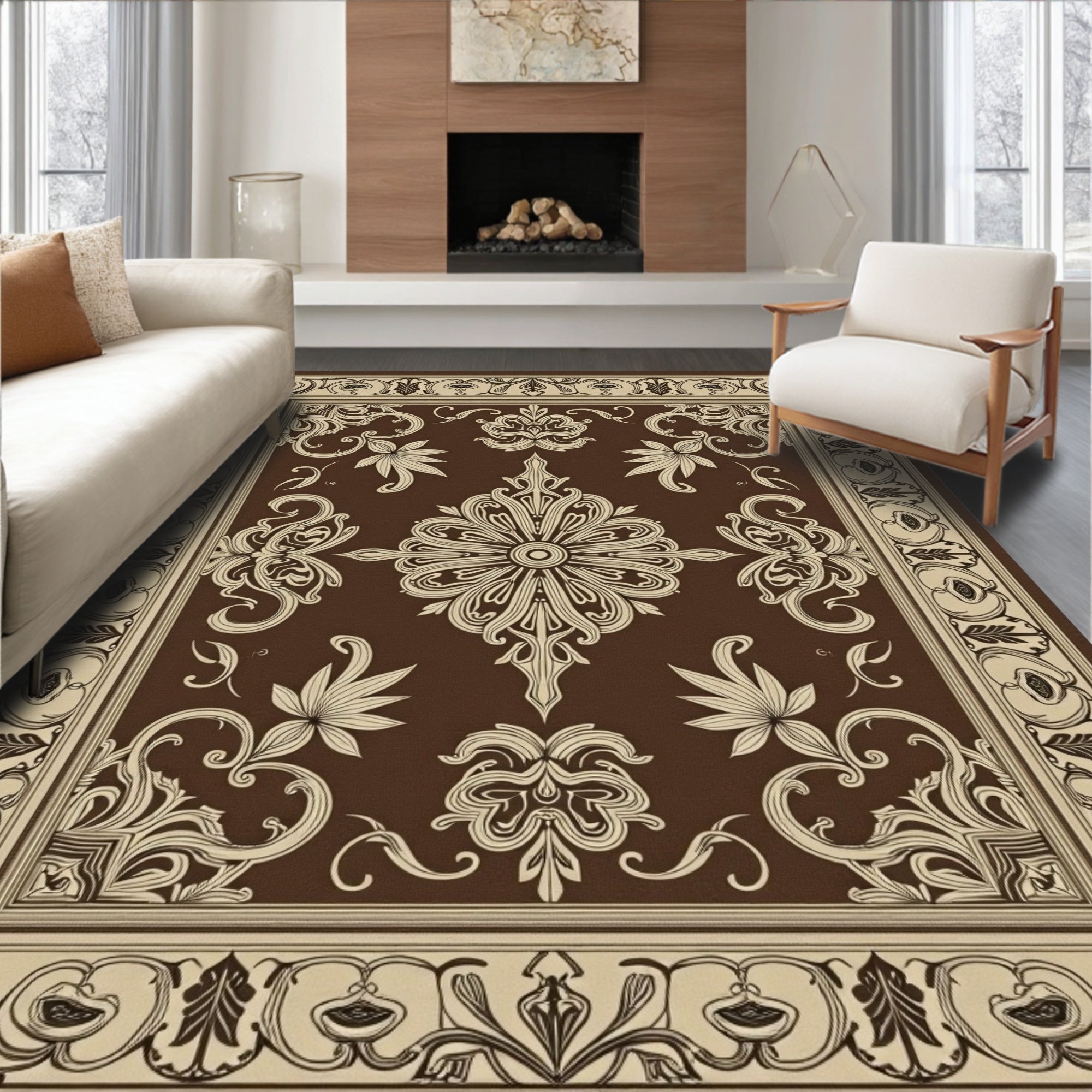 Flatwoven High Traffic Area Rug, Botanical Scroll Design with Artistic Curves and Leaf Details, Non Slip, Stain Resistant, Washable Area Rugs for Living Room, Bedroom (Brown) Overview: