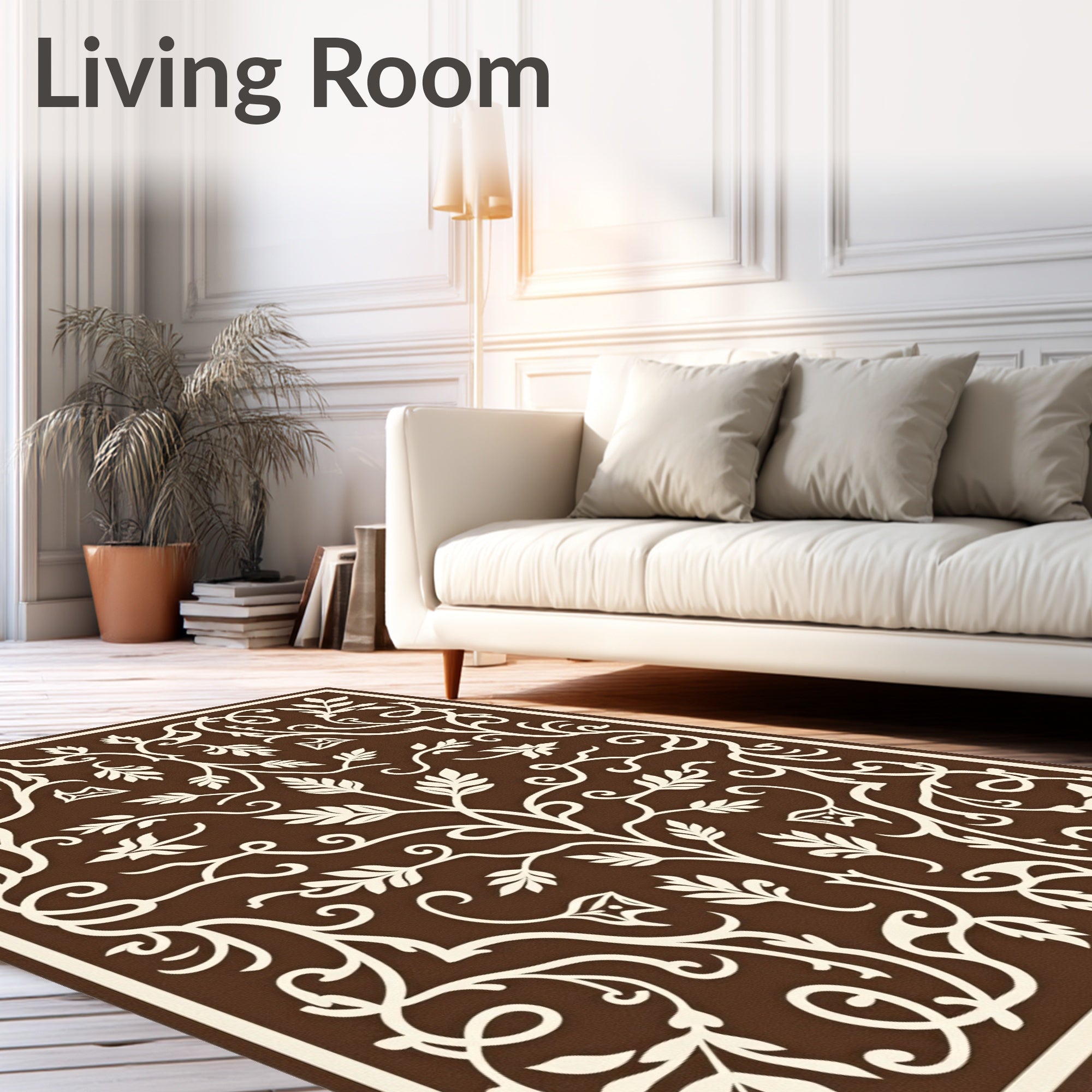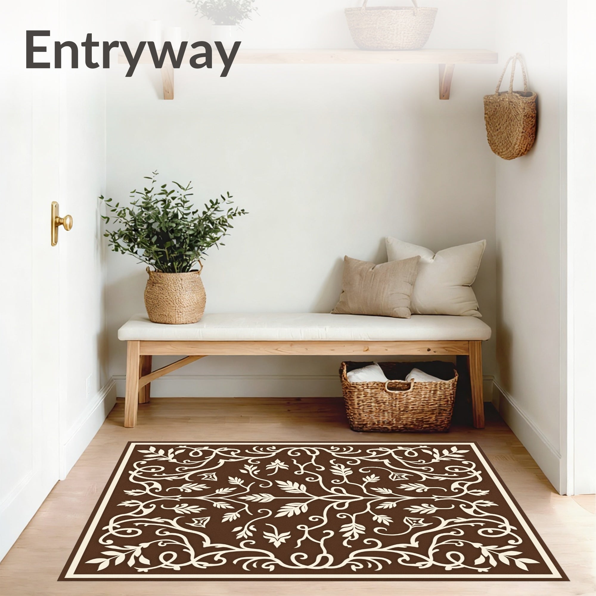 Flatwoven High Traffic Area Rug, Botanical Vine Scroll Traditional Floor, Non Slip, Stain Resistant, Washable Area Rugs for Living Room, Bedroom (Brown) Overview: