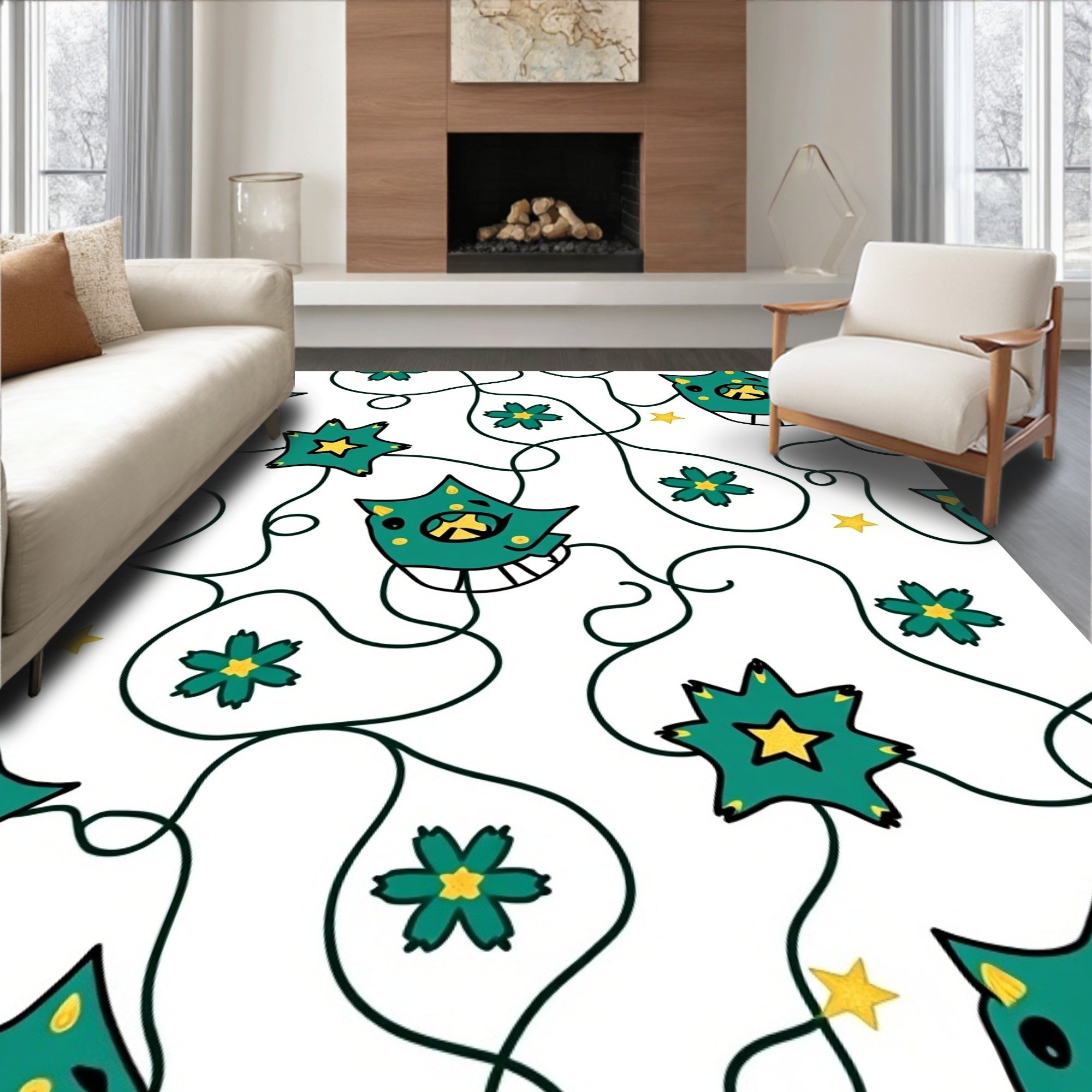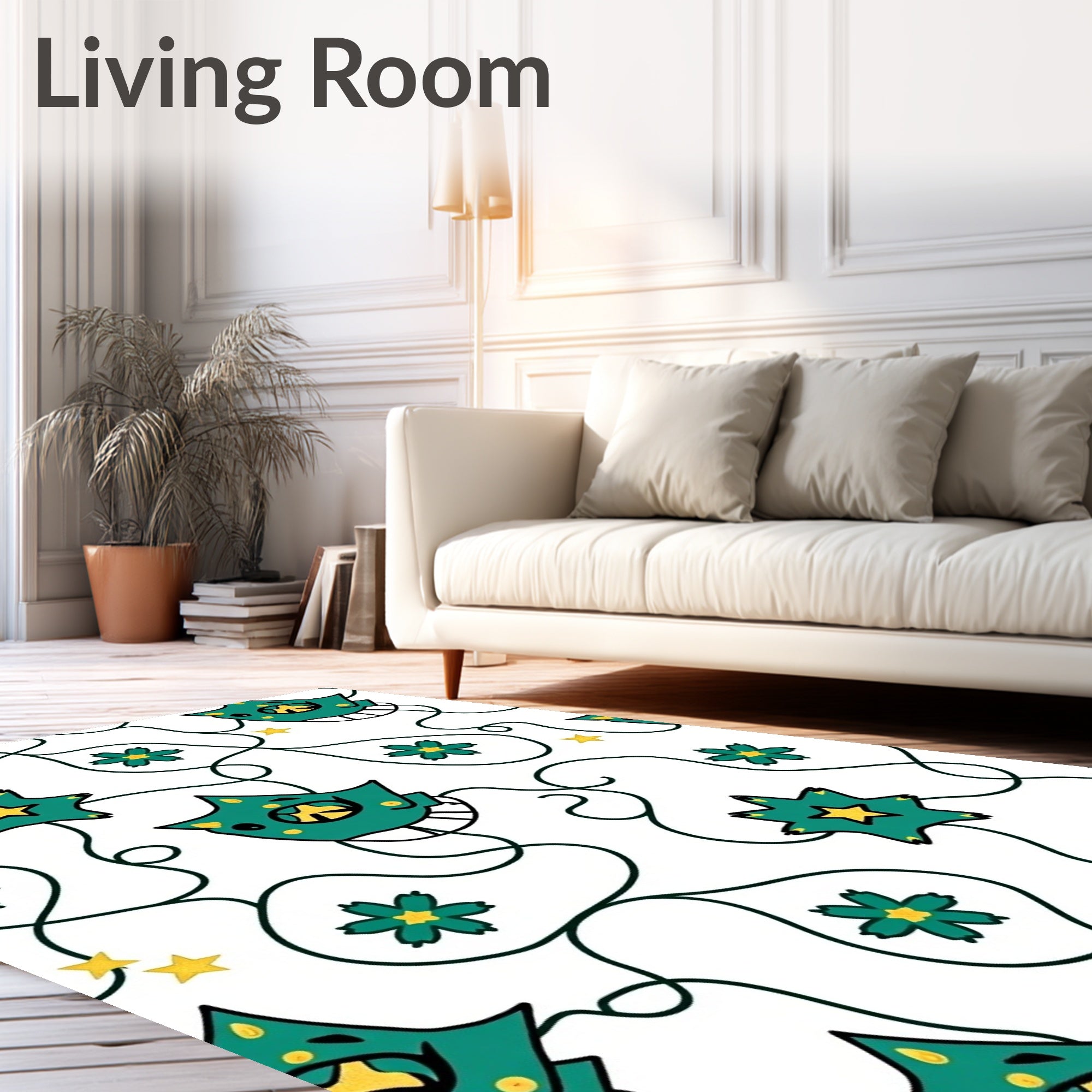 Ultra Soft Area Rug, Non Slip, Stain Resistant, Washable Area Rugs for Living Room, Bedroom, Bright Cat Figure with Festoon String Lights and Playful Sparkle Accents(Teal) Overview: