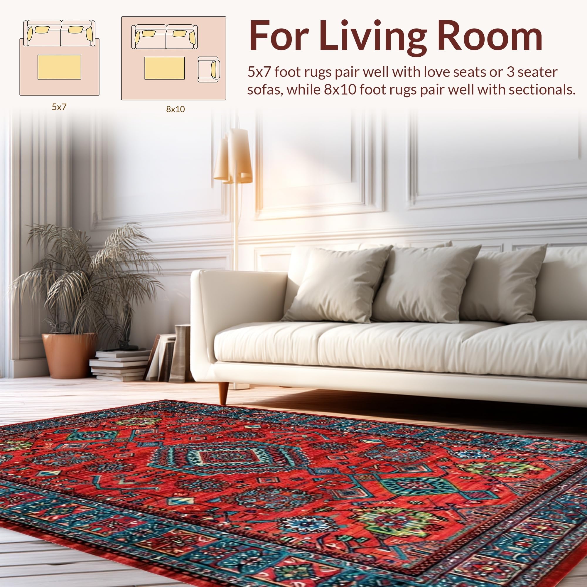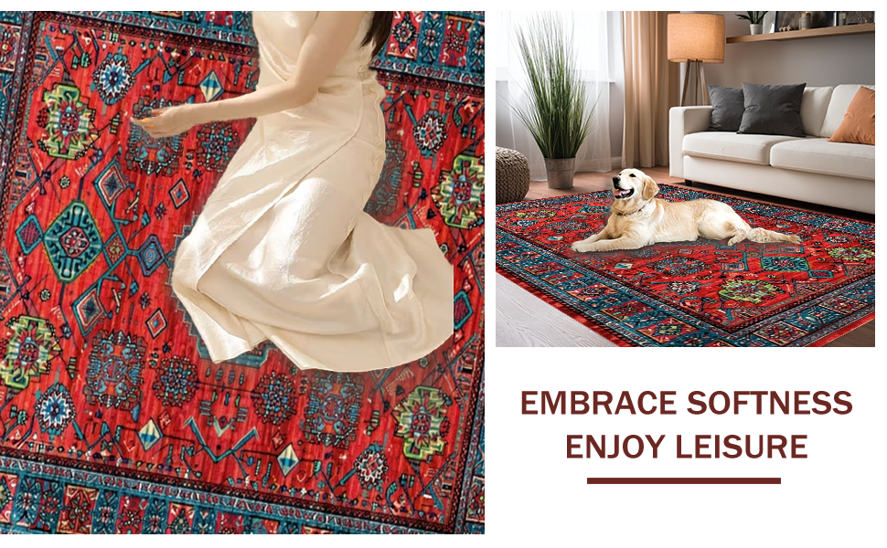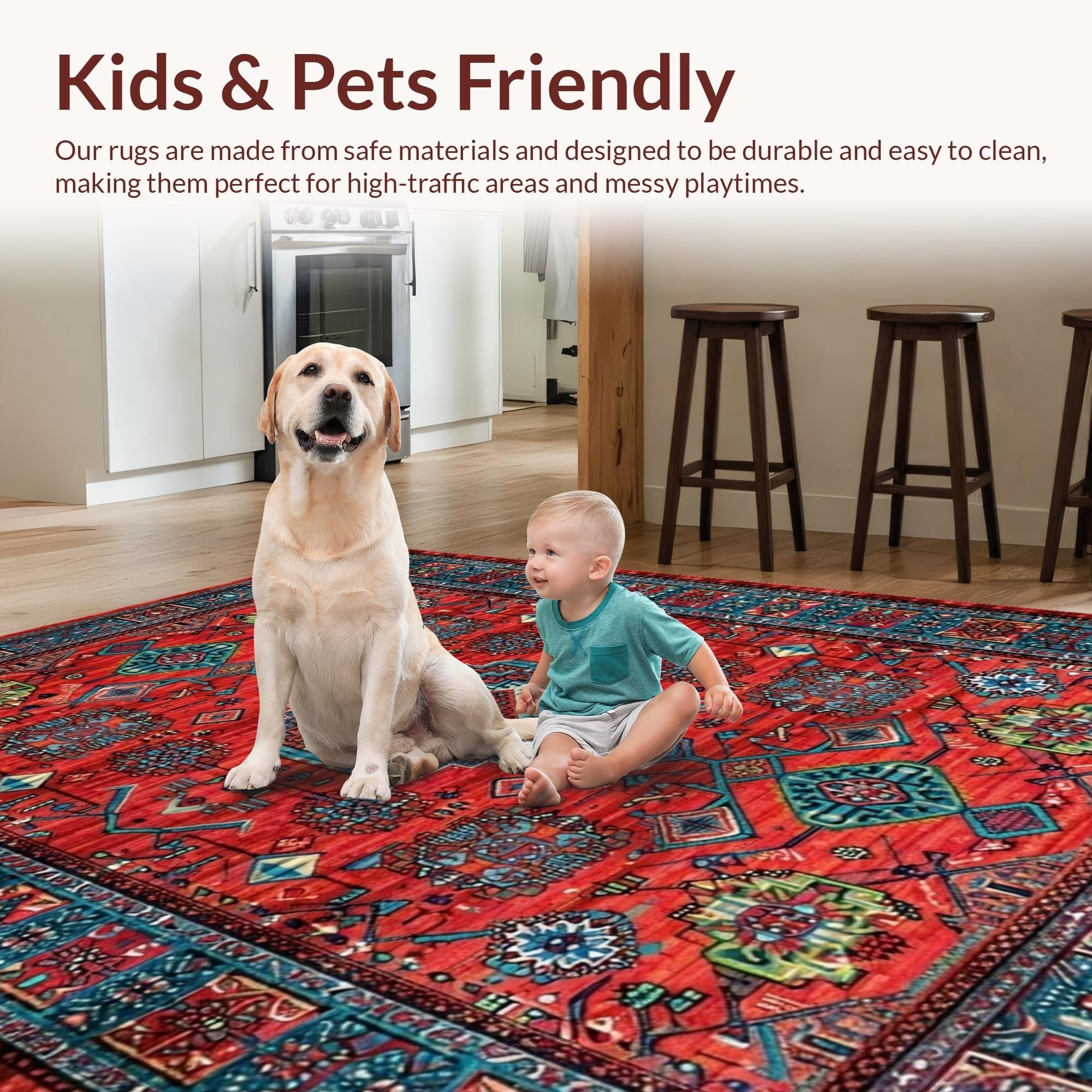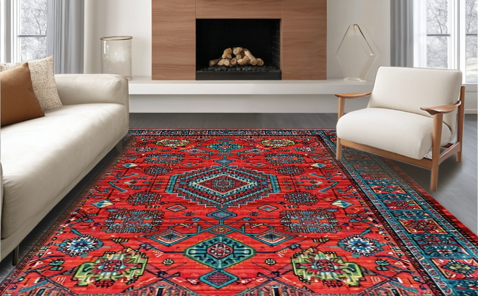 Ultra Soft Area Rug, Non Slip, Stain Resistant, Washable Area Rugs for Living Room, Bedroom, Brightly Colored Folk-Inspired Design(Red) Overview: