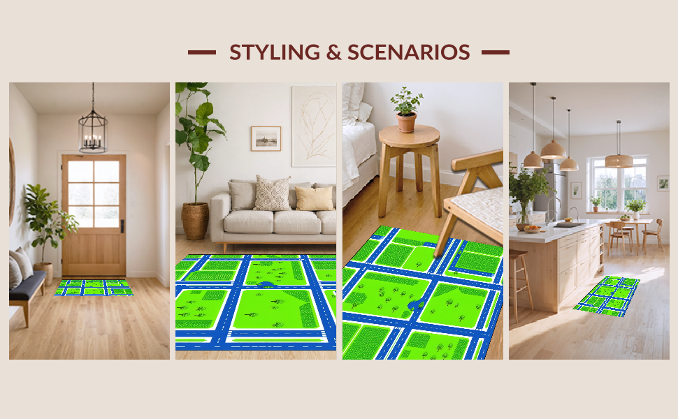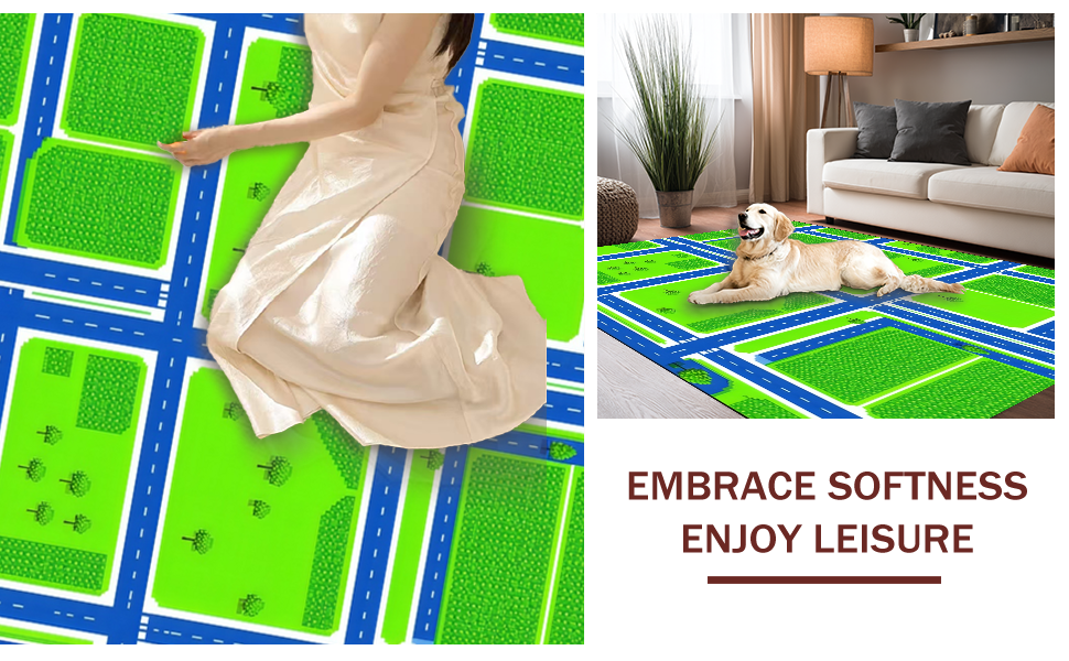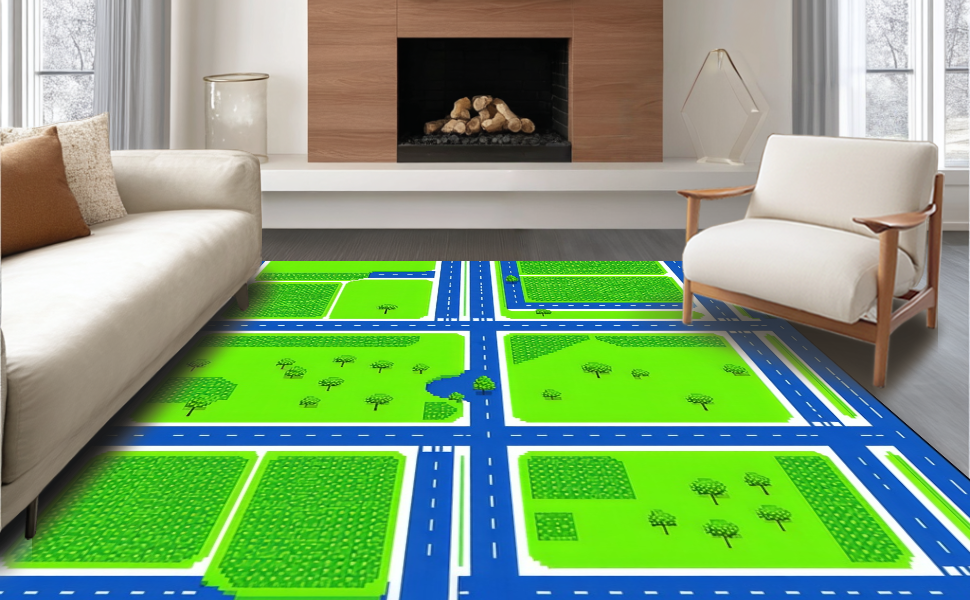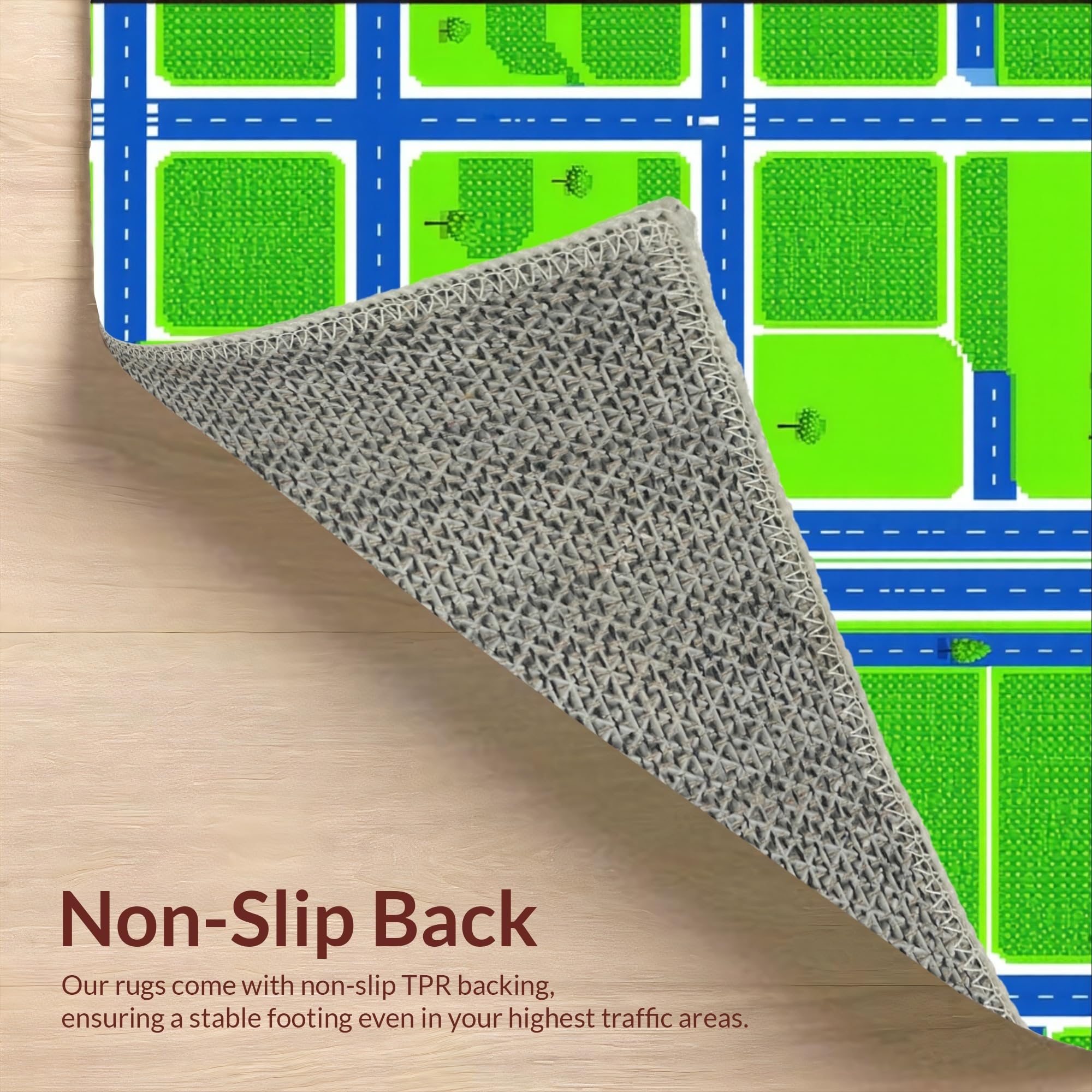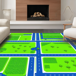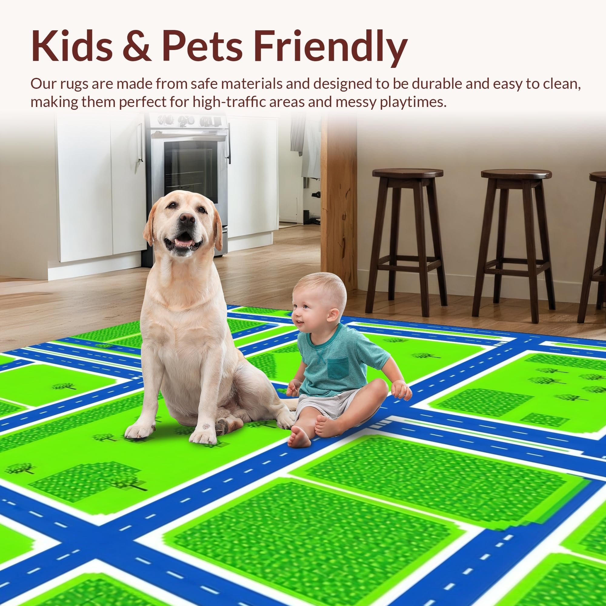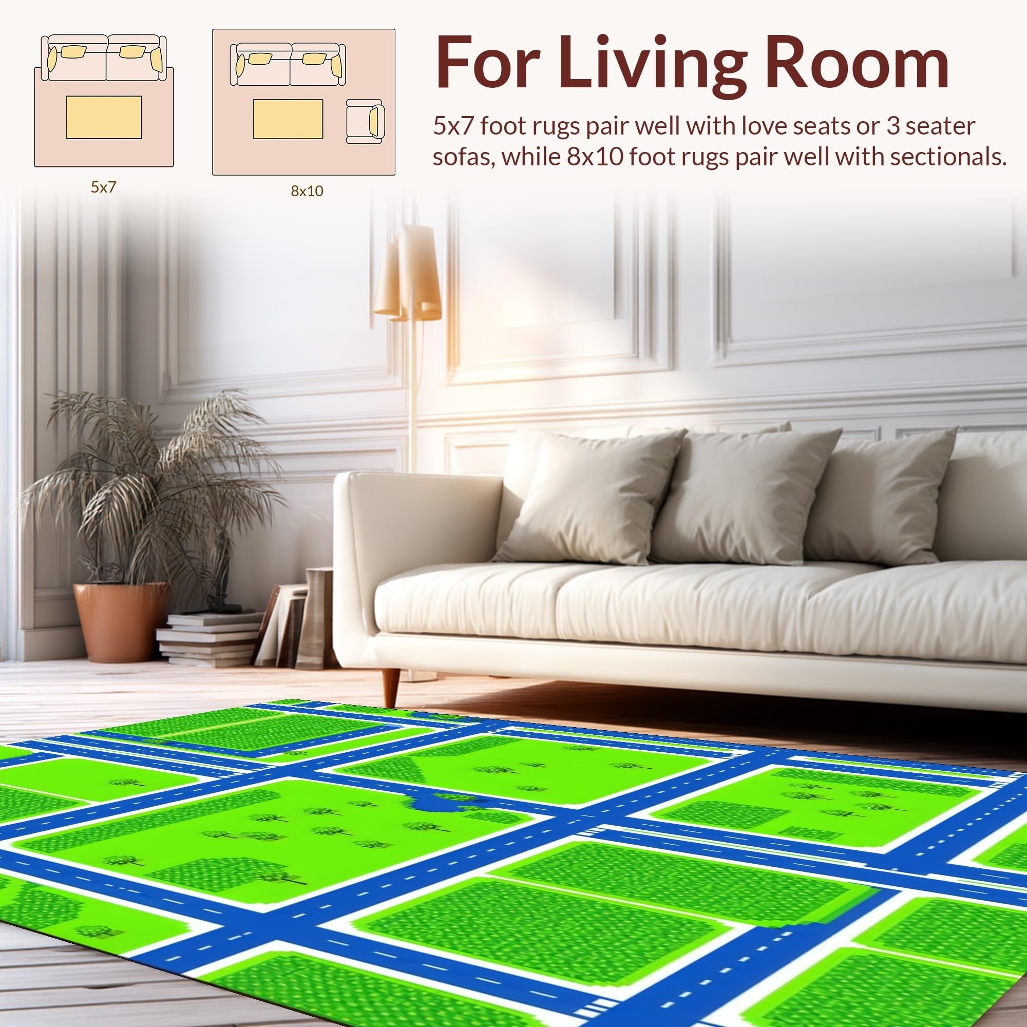 Ultra Soft Area Rug, Non Slip, Stain Resistant, Washable Area Rugs for Living Room, Bedroom, Brightly Illustrated Traffic Adventure Motif(Green) Overview: