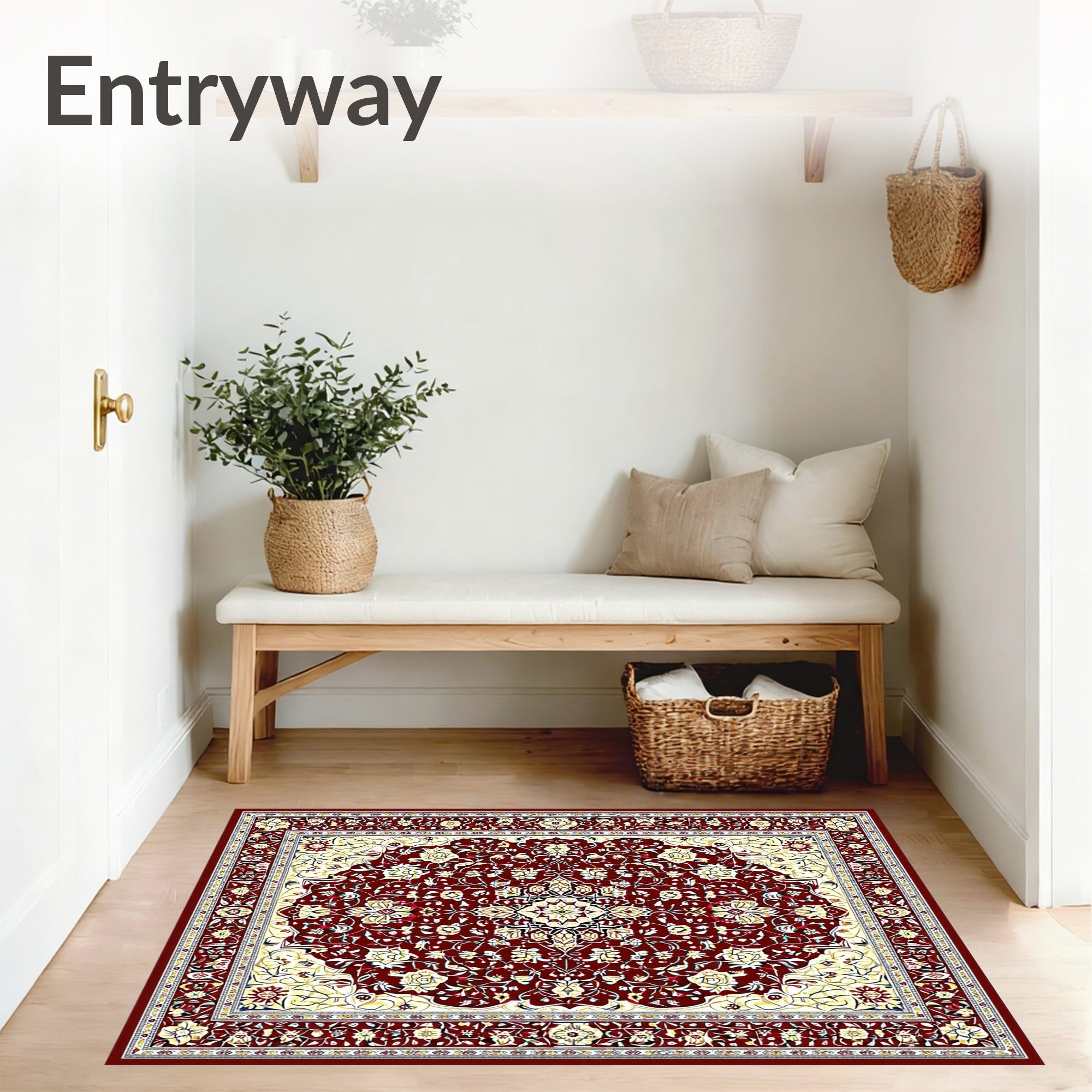 Flatwoven High Traffic Area Rug, Burgundy and Cream Floral Medallion with Geometric Design, Non Slip, Stain Resistant, Washable Area Rugs for Living Room, Bedroom (Red) Overview: