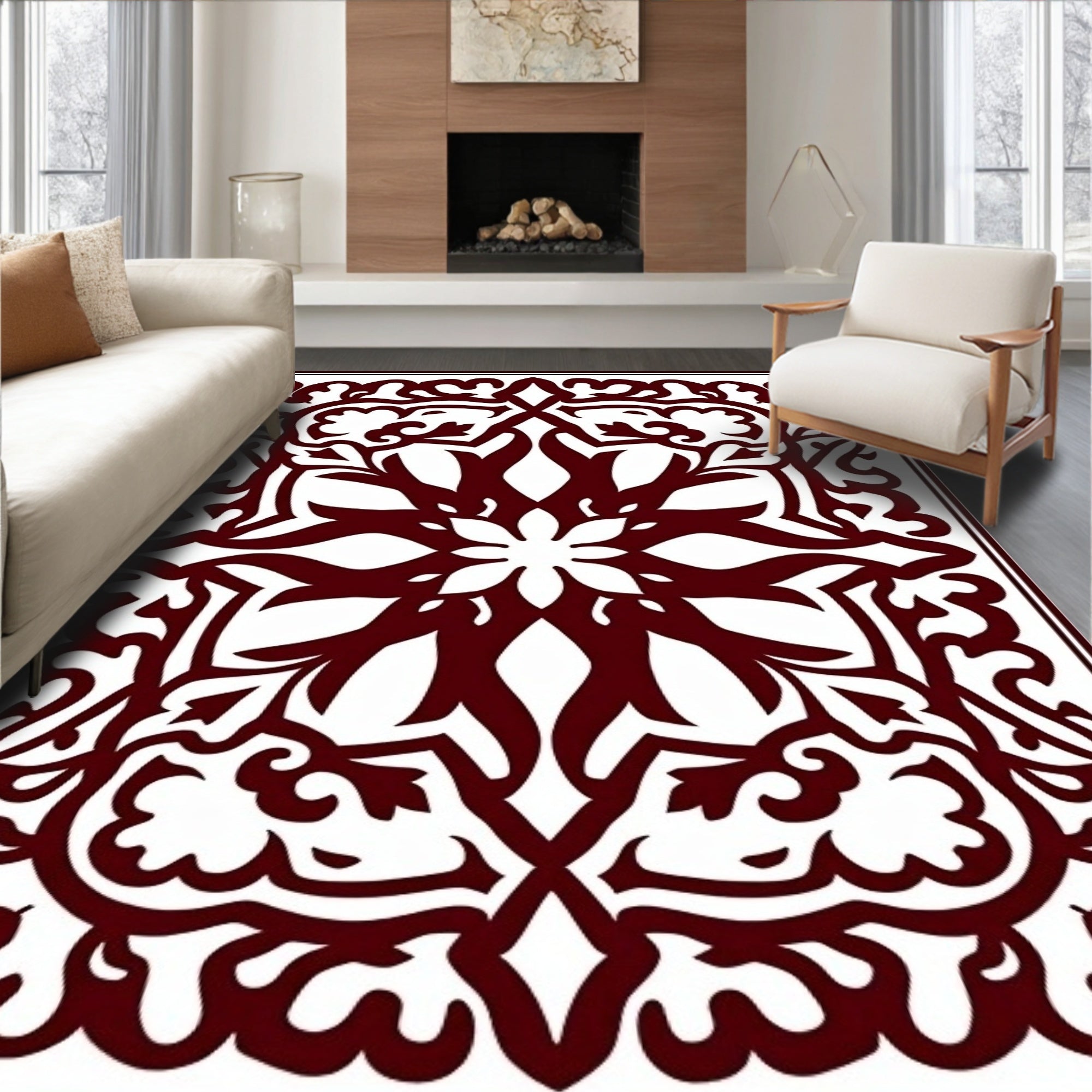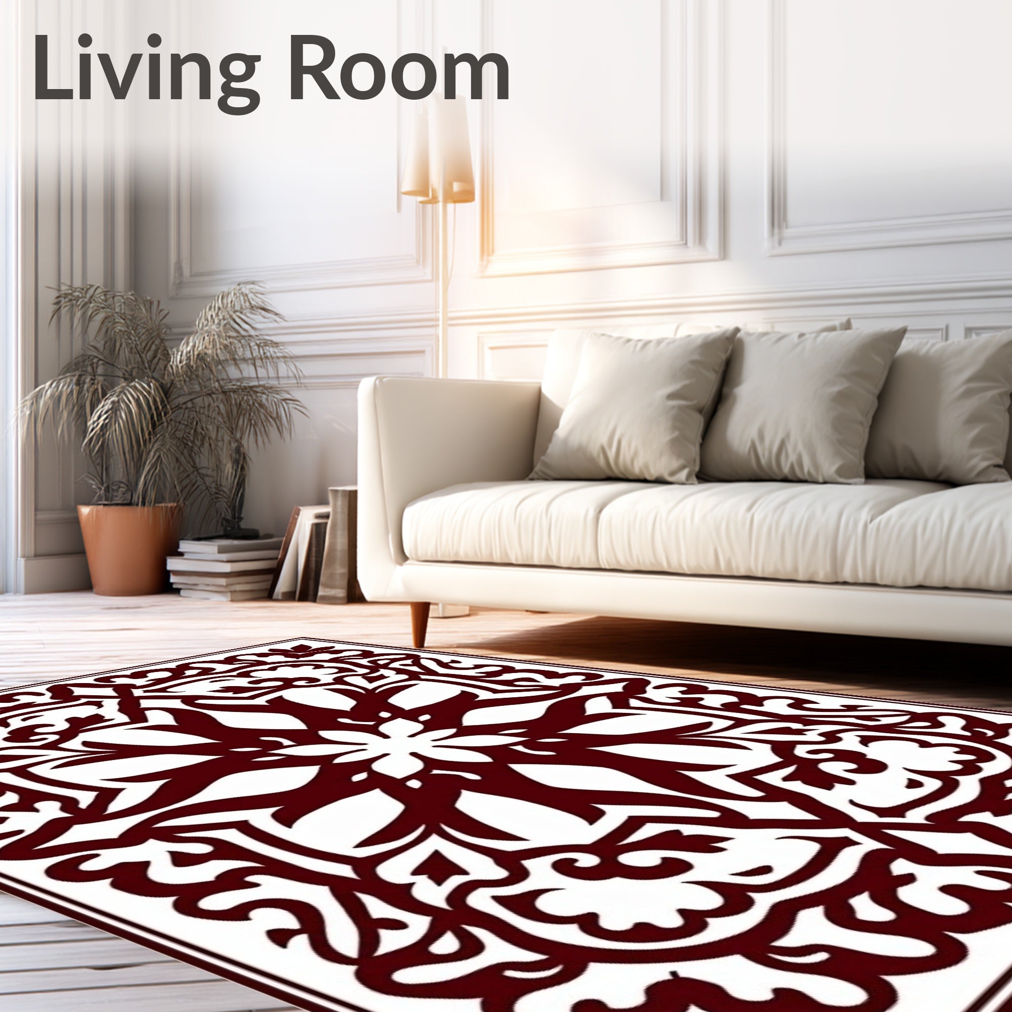 Ultra Soft Area Rug, Non Slip, Stain Resistant, Washable Area Rugs for Living Room, Bedroom, Burst Design with Intricate Petal Motifs and Symmetrical Flourishes(Red) Overview: