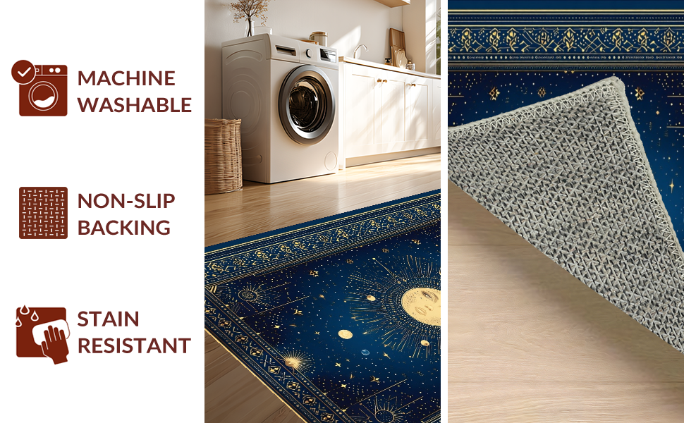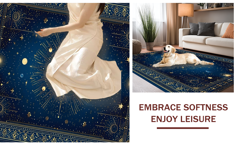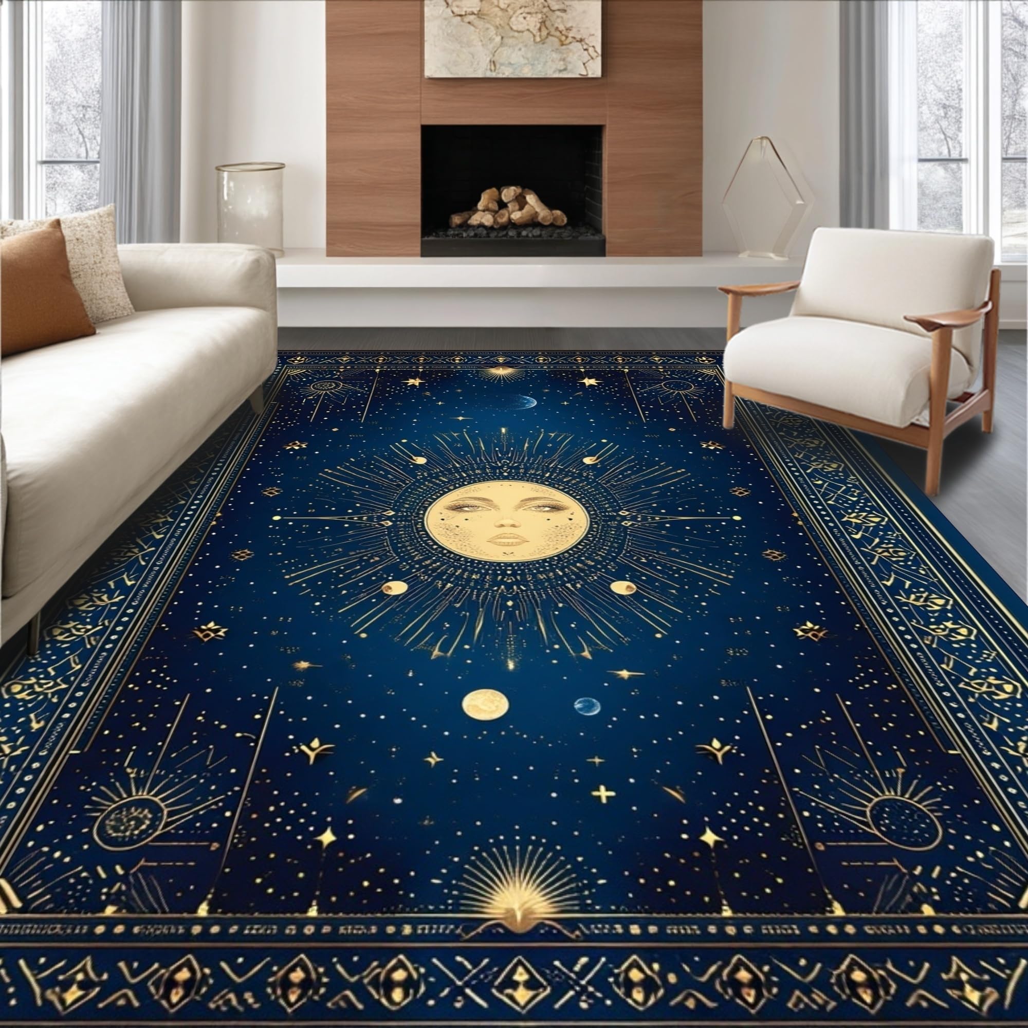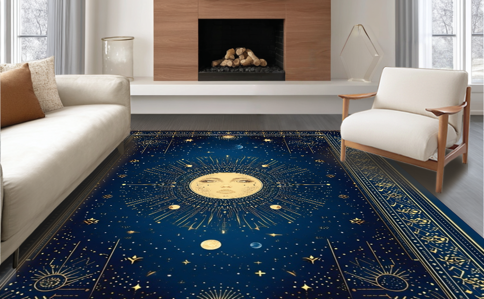 Ultra Soft Area Rug, Non Slip, Stain Resistant, Washable Area Rugs for Living Room, Bedroom, Celestial Whimsical Sun Motif(Blue) Overview: