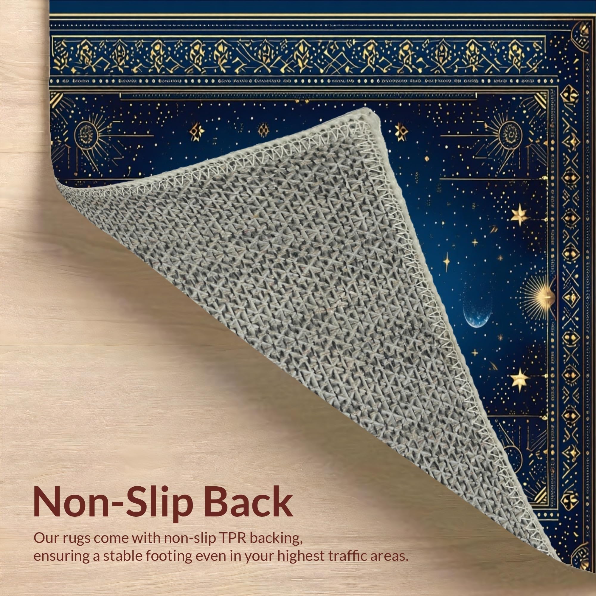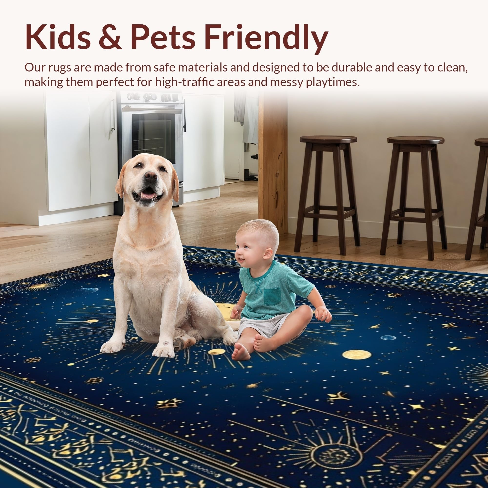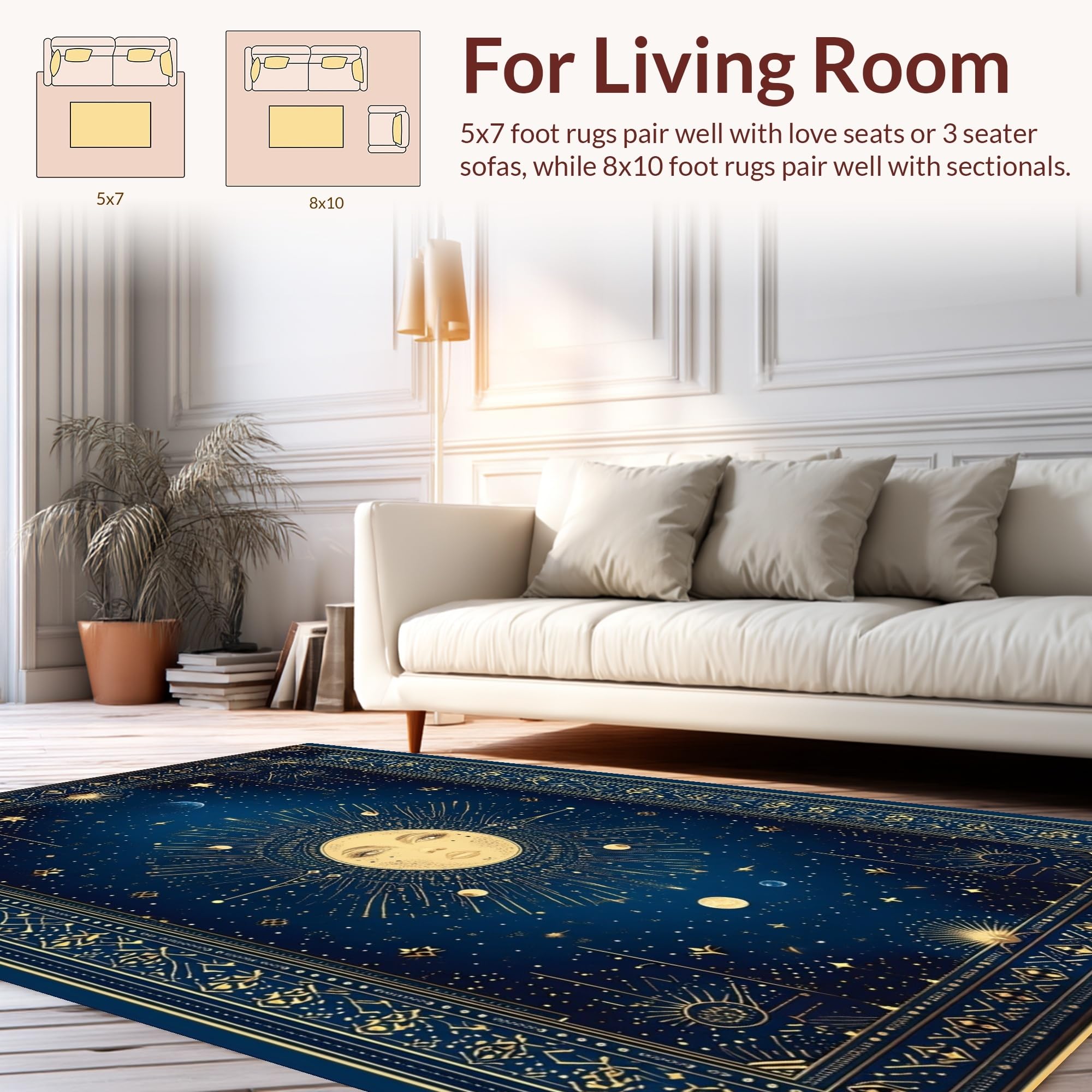 Ultra Soft Area Rug, Non Slip, Stain Resistant, Washable Area Rugs for Living Room, Bedroom, Celestial Whimsical Sun Motif(Blue) Overview: