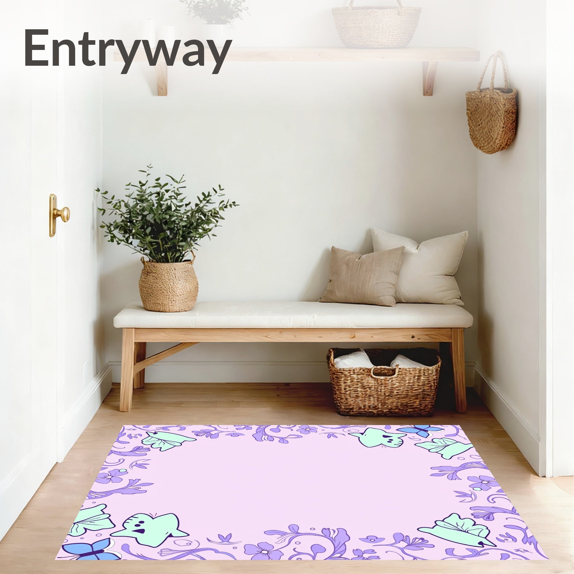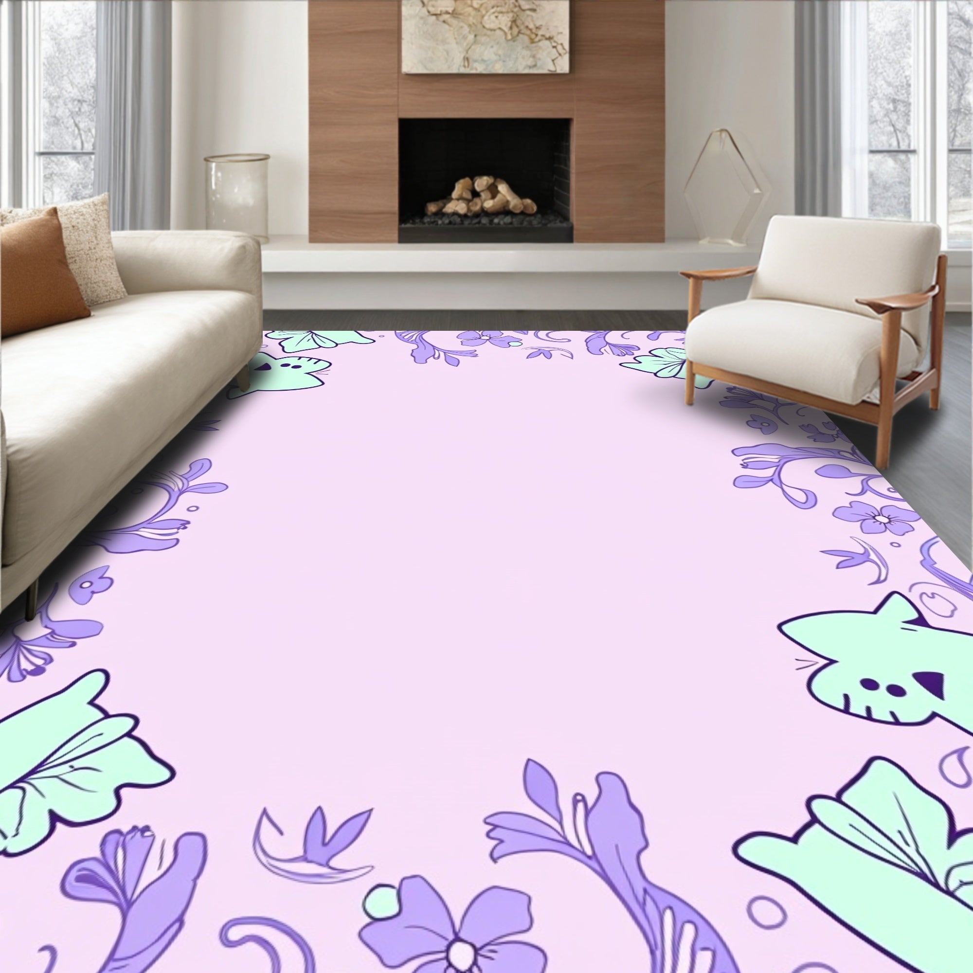 Flatwoven High Traffic Area Rug, Charming Cartoon Cats Chasing Butterflies with Swirling Floral Vines, Non Slip, Stain Resistant, Washable Area Rugs for Living Room, Bedroom (Pink) Overview: