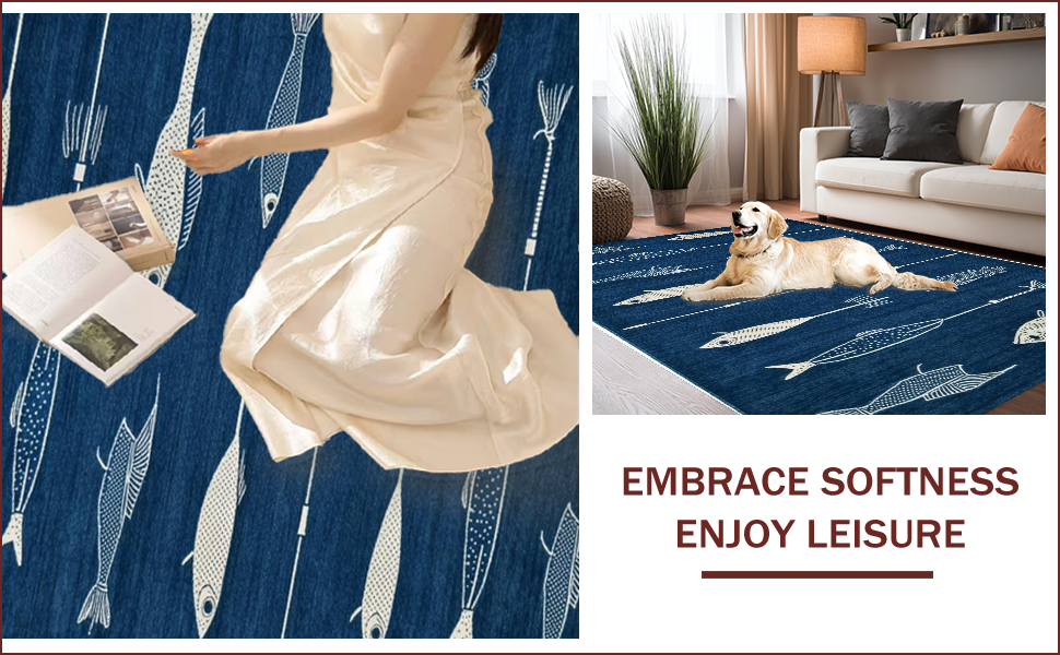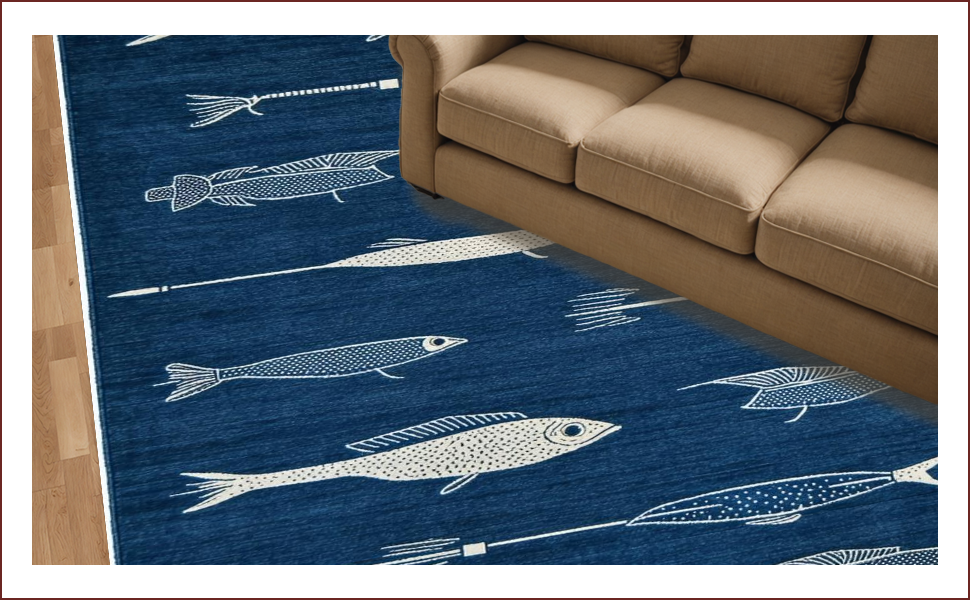 Ultra Soft Area Rug, Non Slip, Stain Resistant, Washable Area Rugs for Living Room, Bedroom, Charming Coastal Fishing Motif(Blue) Overview: