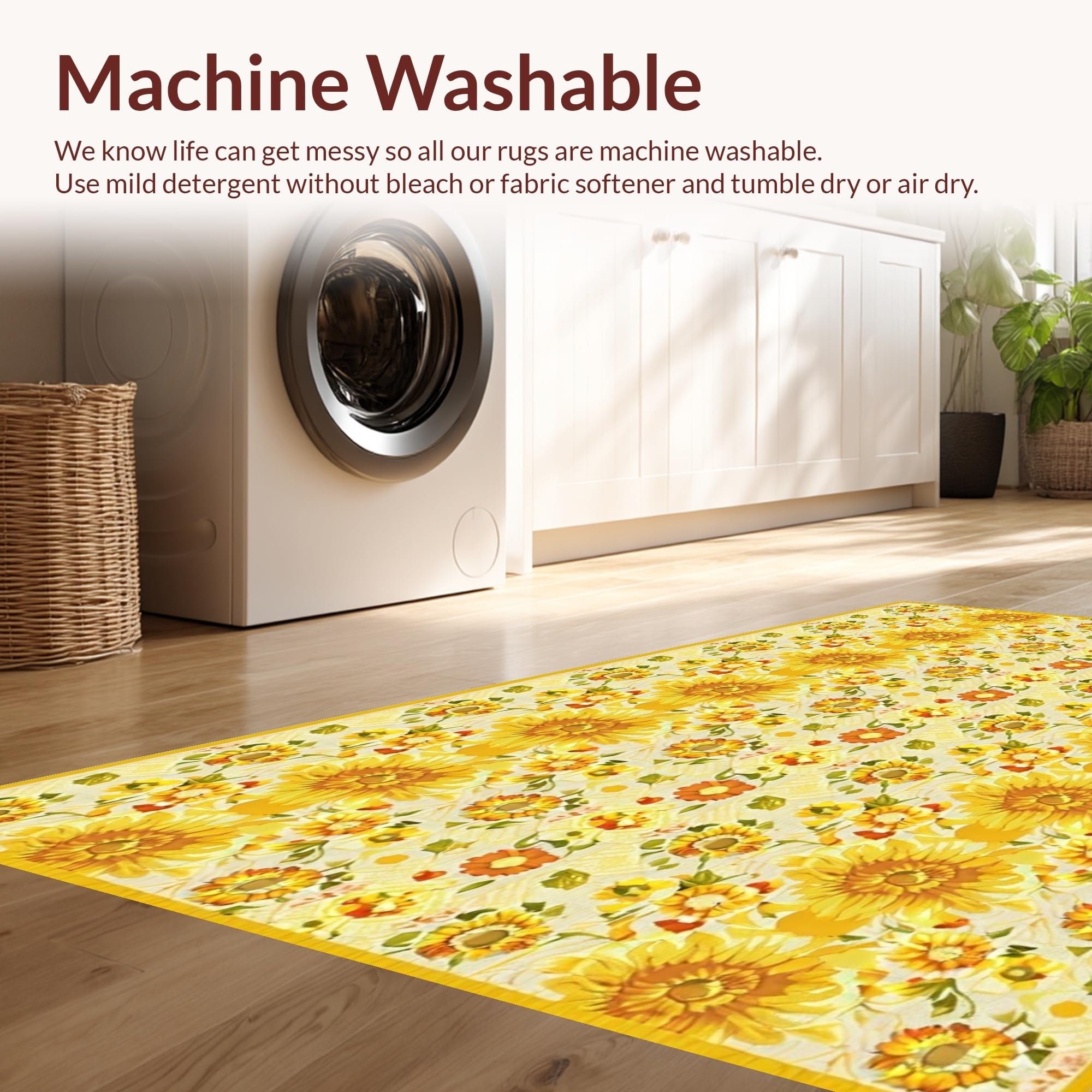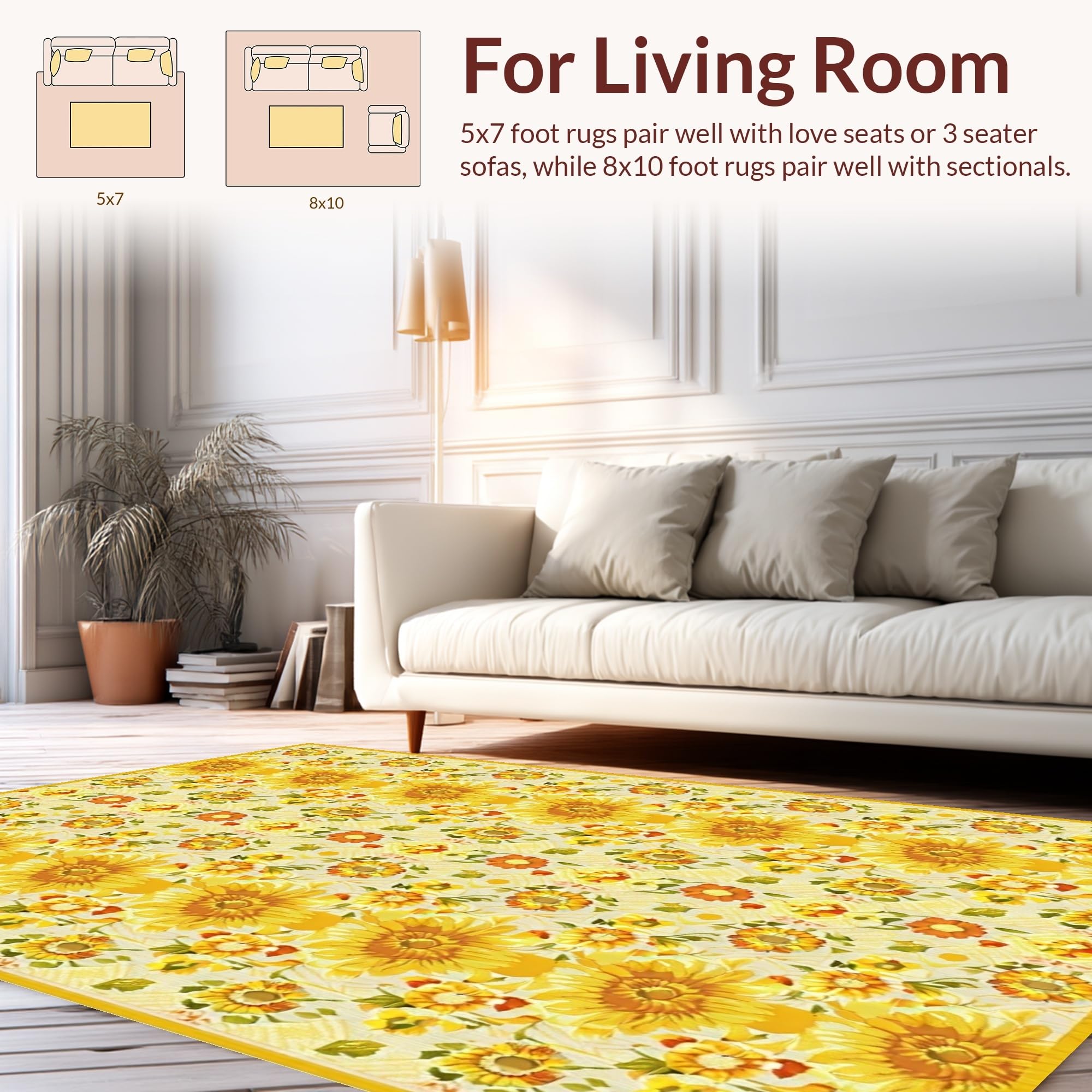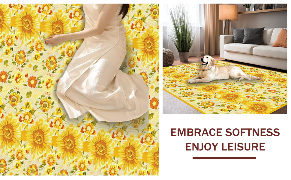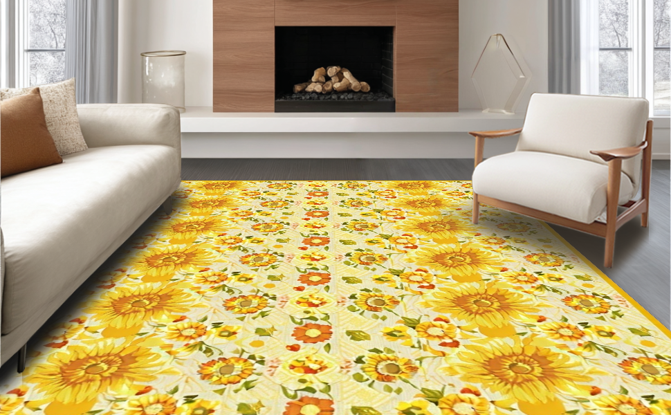 Ultra Soft Area Rug, Non Slip, Stain Resistant, Washable Area Rugs for Living Room, Bedroom, Charming Farmhouse Sunflower Motif(Yellow) Overview:
