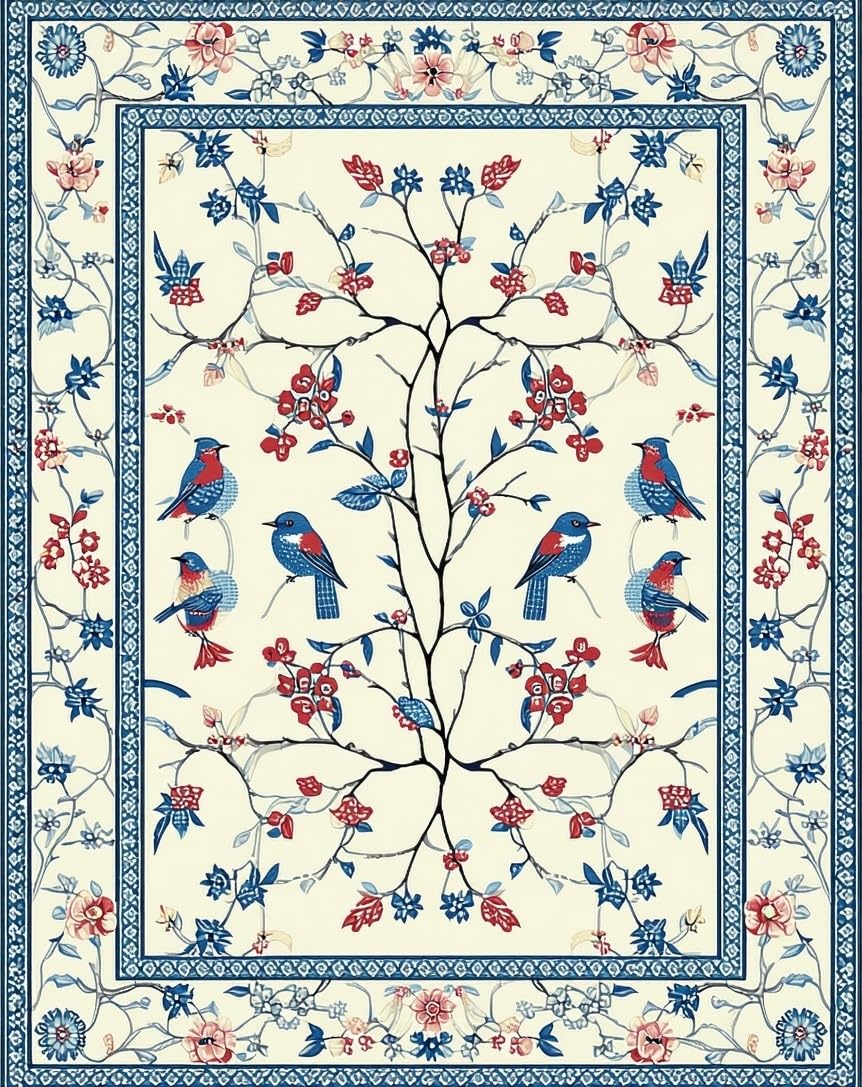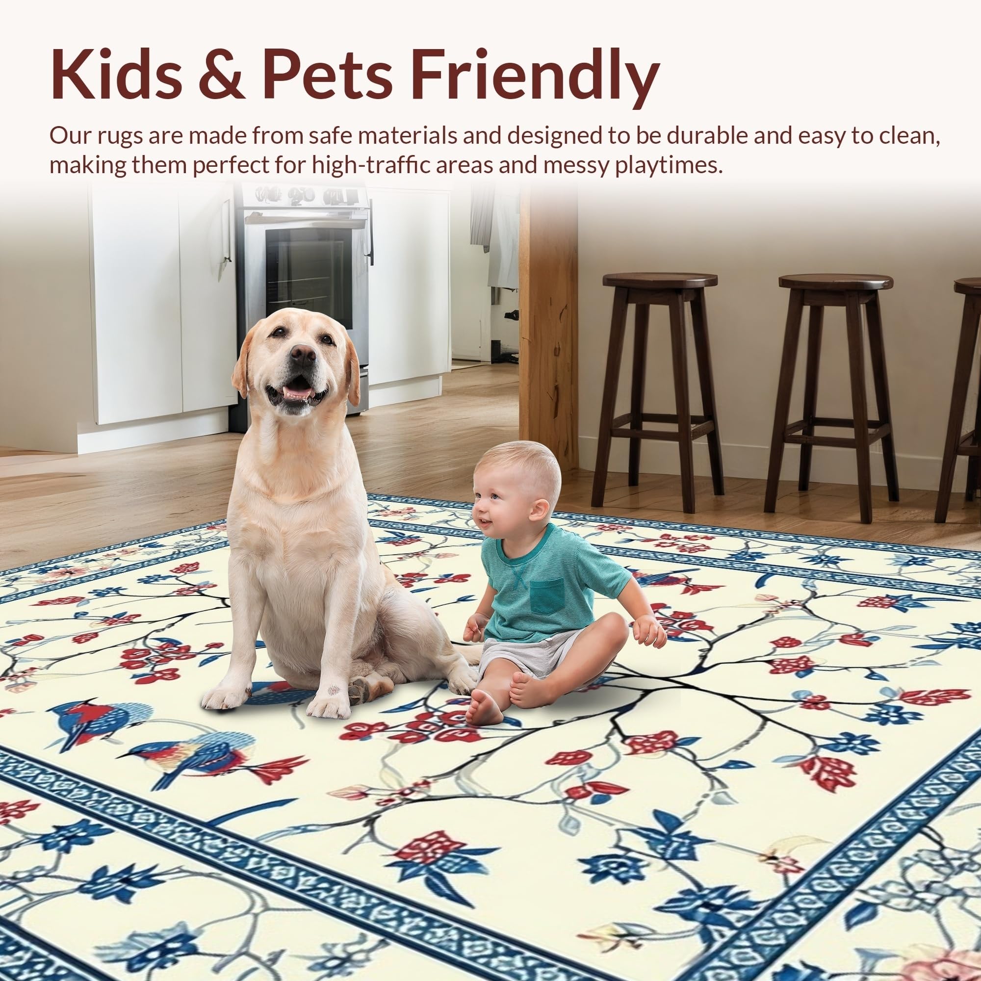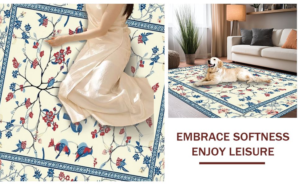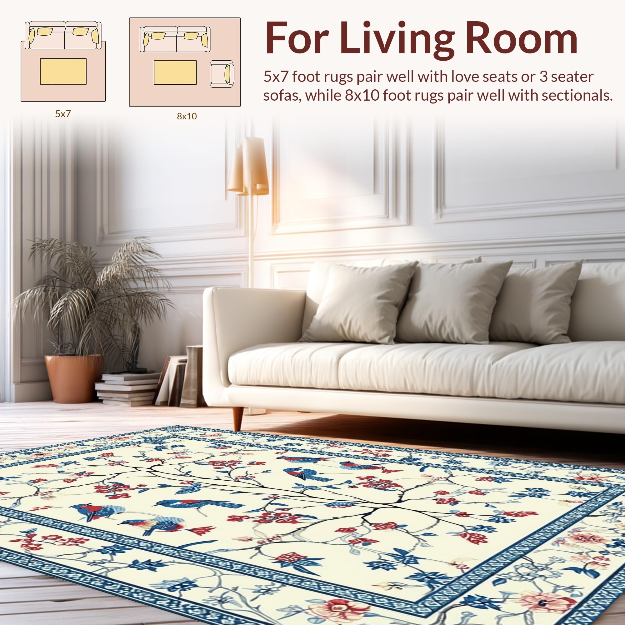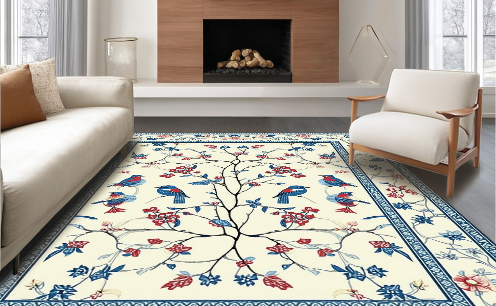 Ultra Soft Area Rug, Non Slip, Stain Resistant, Washable Area Rugs for Living Room, Bedroom, Charming Retro Twigs and Birds(Beige) Overview: