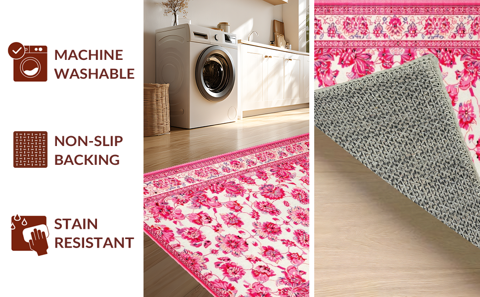 Ultra Soft Area Rug, Non Slip, Stain Resistant, Washable Area Rugs for Living Room, Bedroom, Charming Vintage Blossom Arrangement(Pink) Overview: