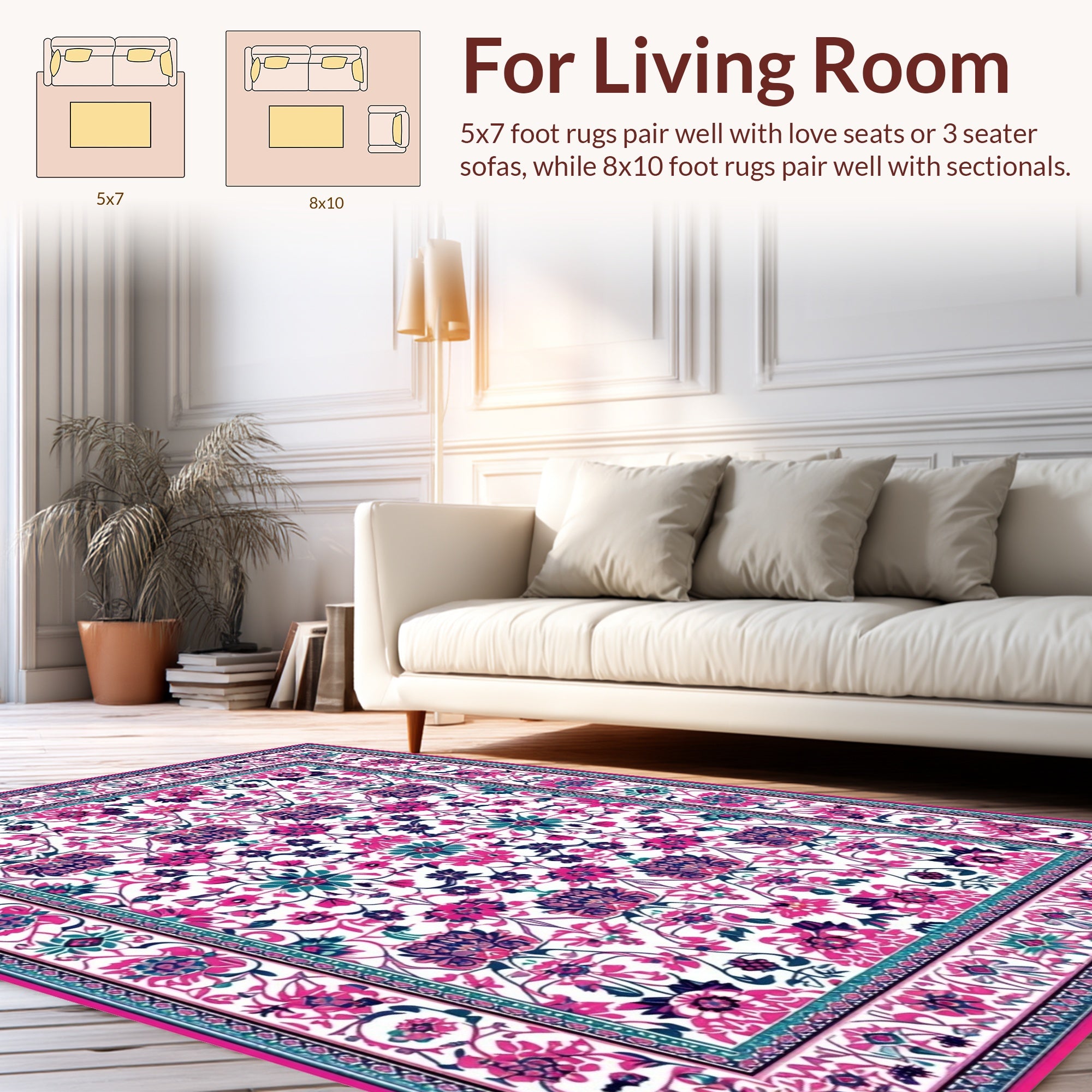 Flatwoven High Traffic Area Rug, Chic Dark Floral Aesthetic, Non Slip, Stain Resistant, Washable Area Rugs for Living Room, Bedroom (White) Overview: