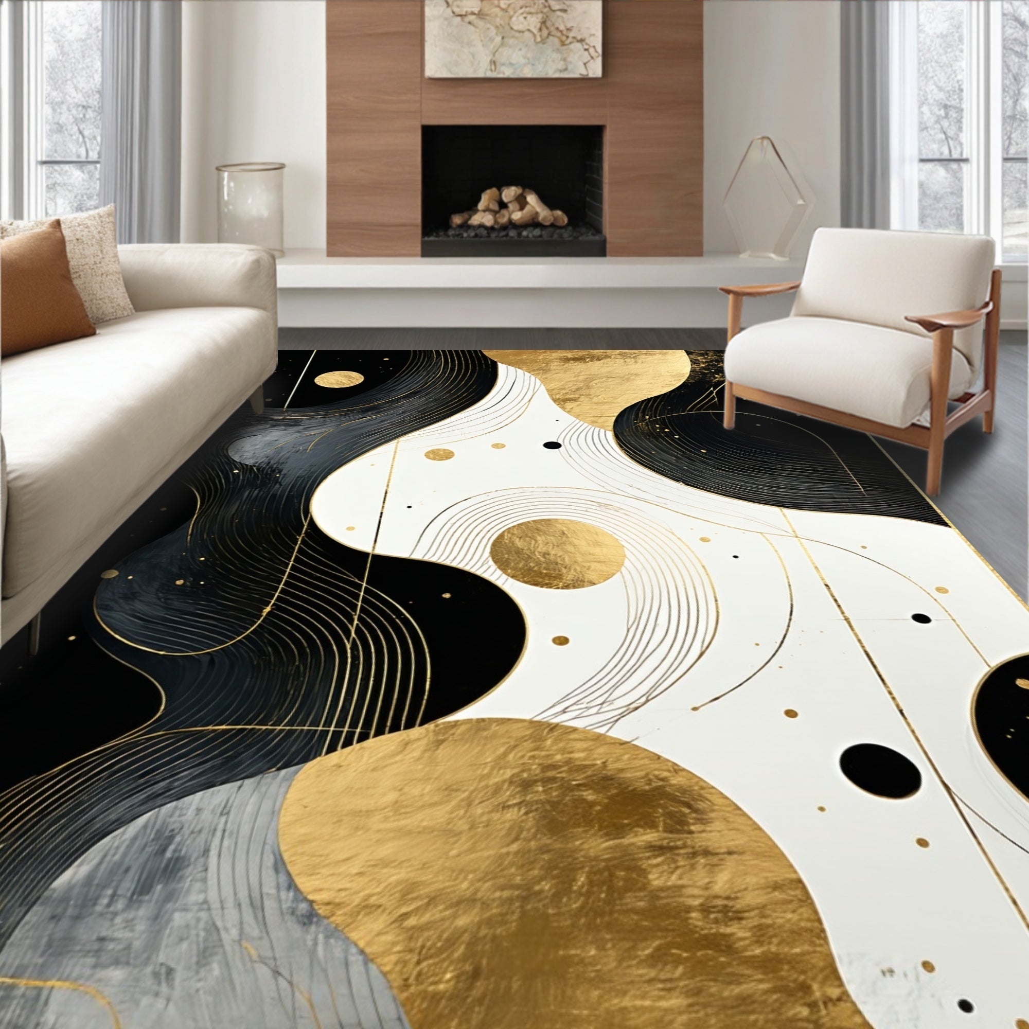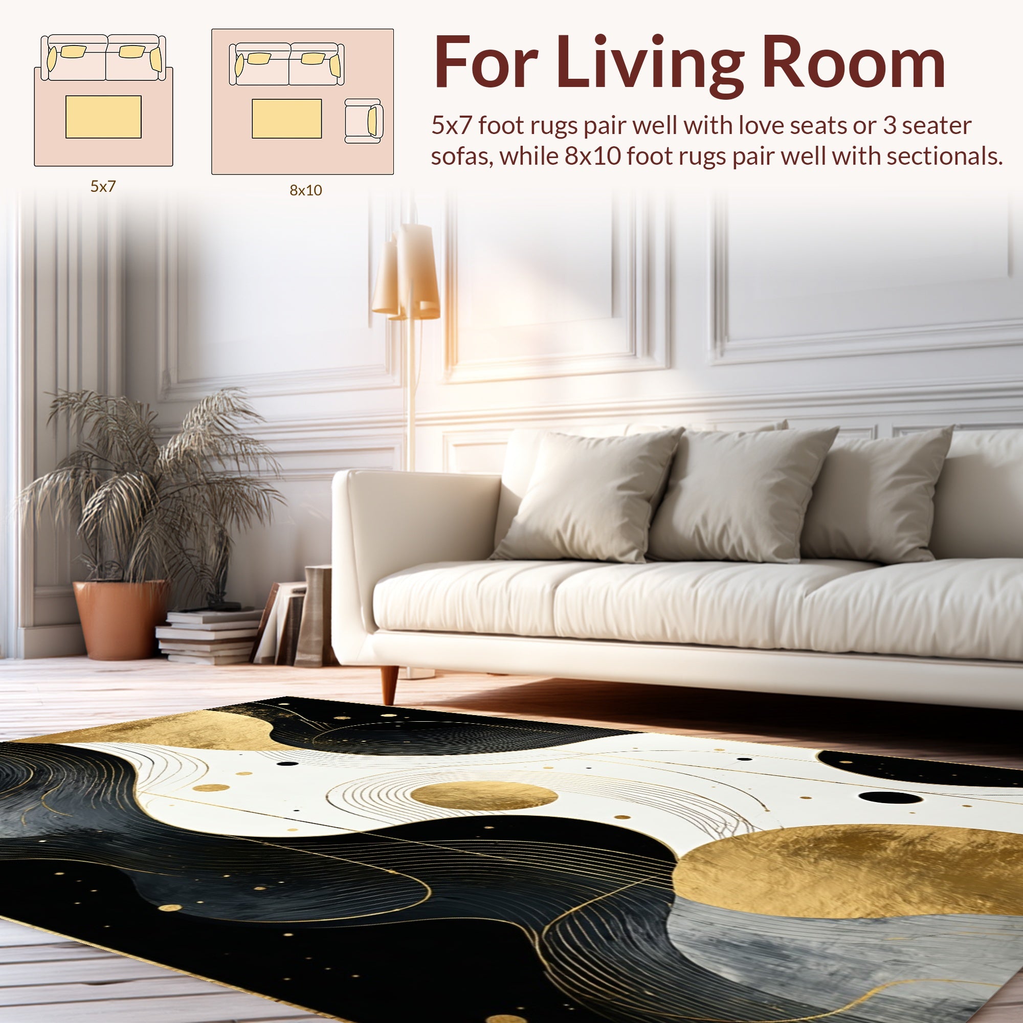 Flatwoven High Traffic Area Rug, Chic Gold Foil Geometric Motif, Non Slip, Stain Resistant, Washable Area Rugs for Living Room, Bedroom (Black) Overview: