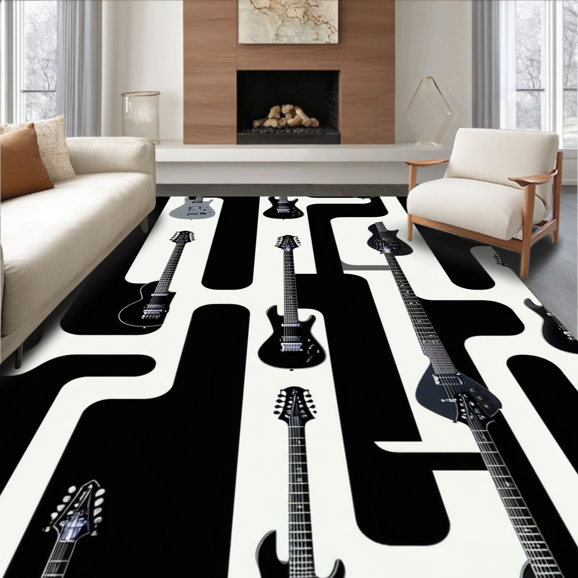 Flatwoven High Traffic Area Rug, Chic Graphical Stringed Instrument Design, Non Slip, Stain Resistant, Washable Area Rugs for Living Room, Bedroom (Black) Overview: