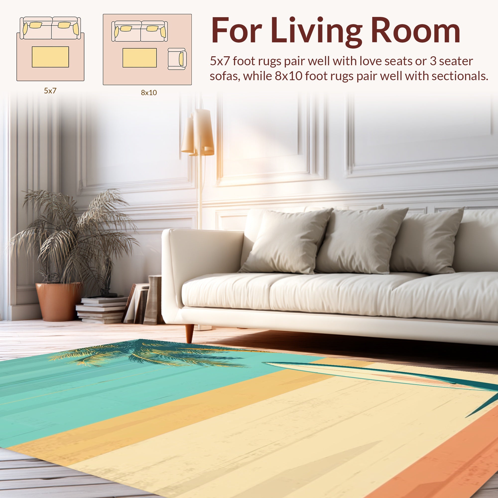 Flatwoven High Traffic Area Rug, Chic Surfboard Bathroom Featuring Palm Trees on Rustic Wood Texture, Non Slip, Stain Resistant, Washable Area Rugs for Living Room, Bedroom (Blue) Overview:
