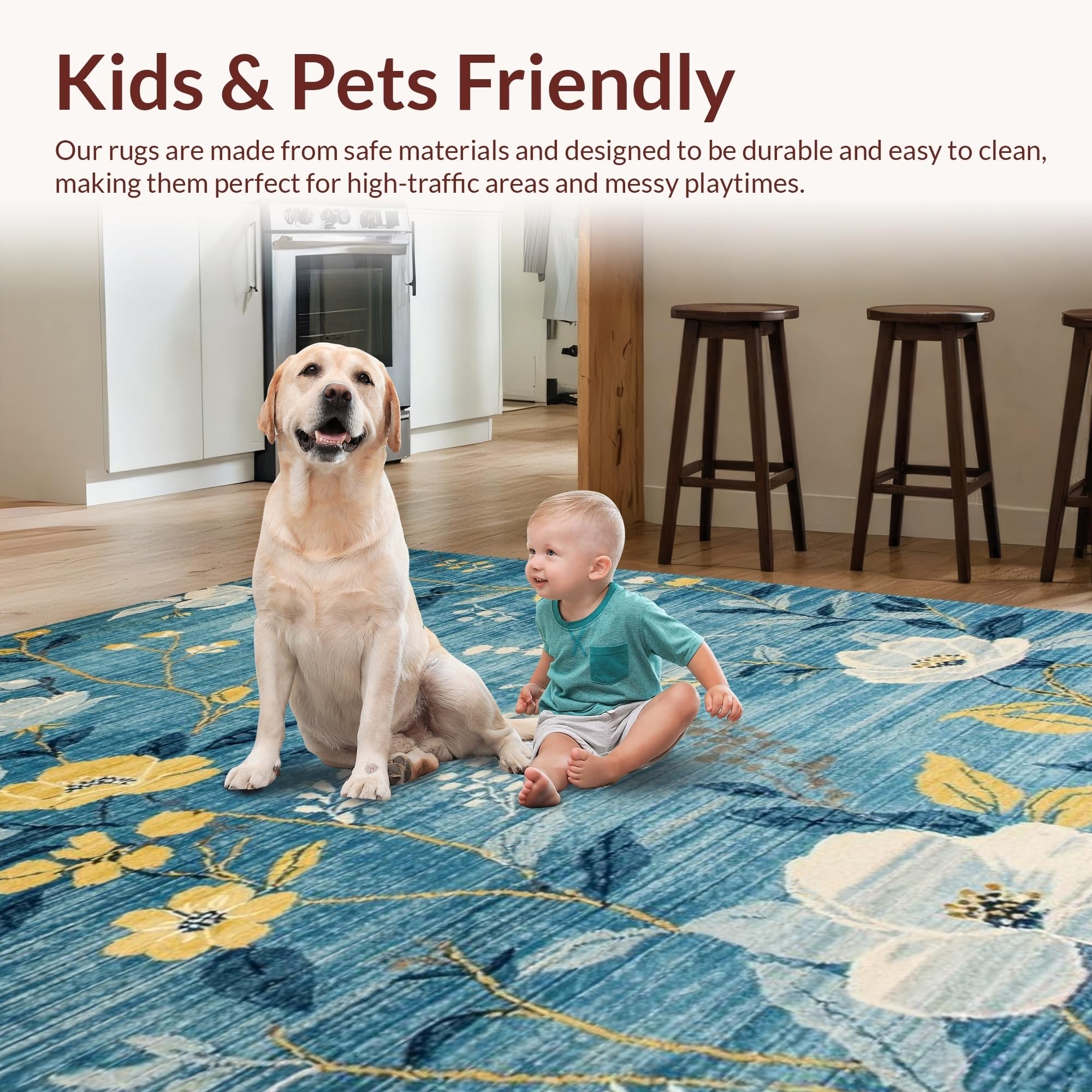 Ultra Soft Area Rug, Non Slip, Stain Resistant, Washable Area Rugs for Living Room, Bedroom, Chic Vintage Tiled Motif(Blue) Overview: