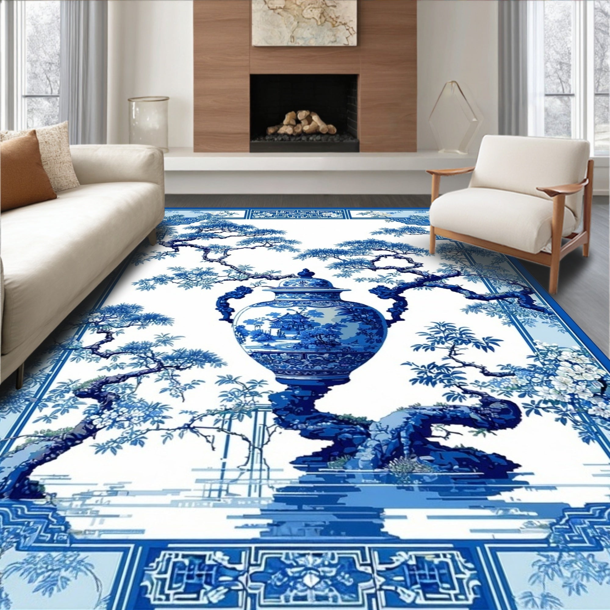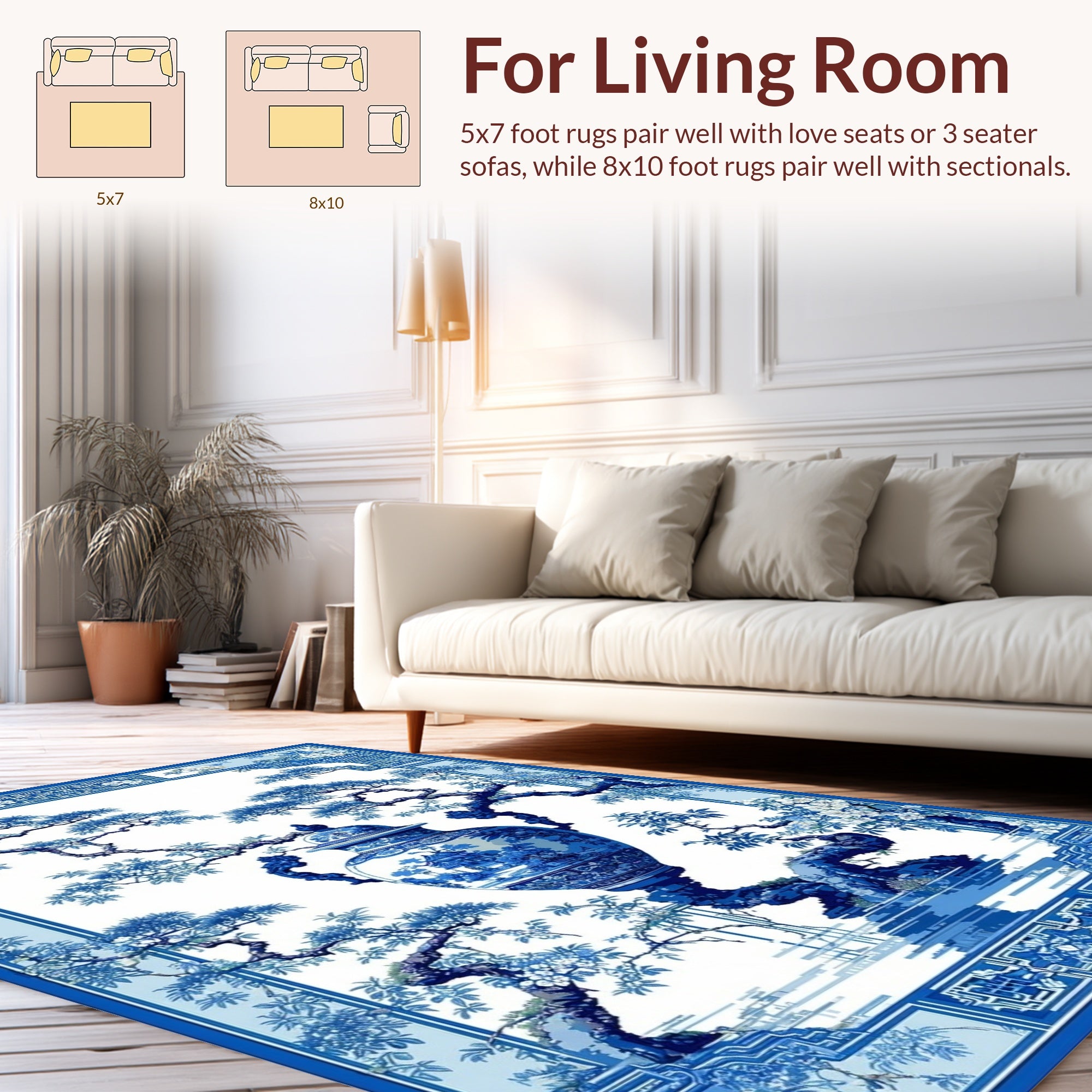 Flatwoven High Traffic Area Rug, Chinoiserie Floral Elegance Motif, Non Slip, Stain Resistant, Washable Area Rugs for Living Room, Bedroom (Blue) Overview: