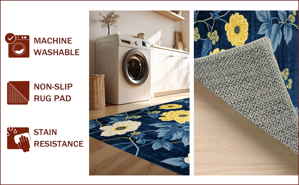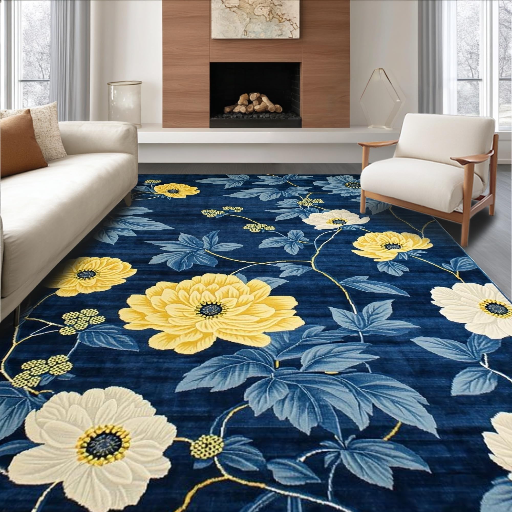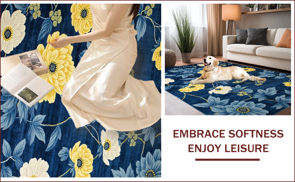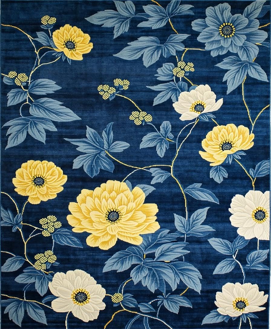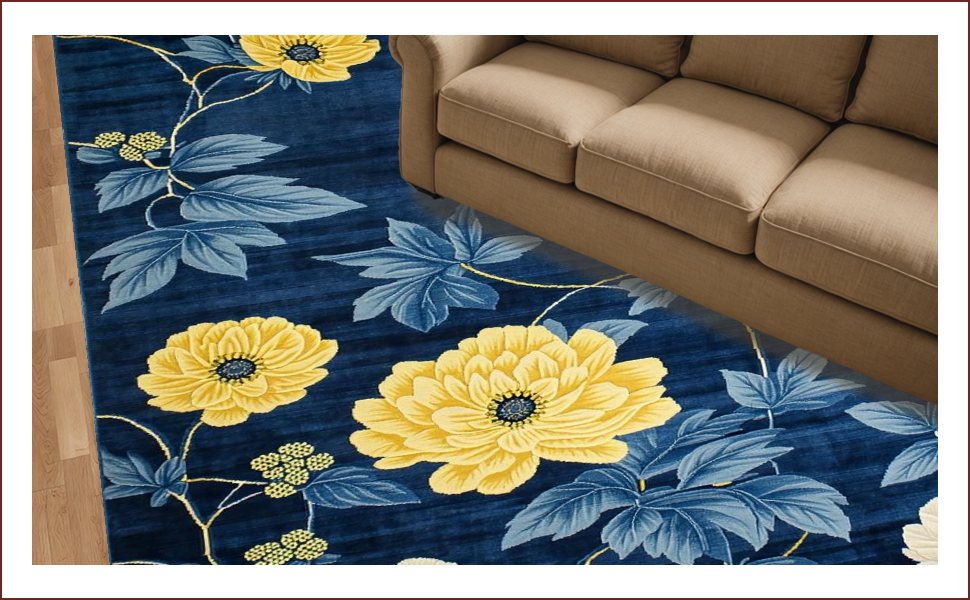 Ultra Soft Area Rug, Non Slip, Stain Resistant, Washable Area Rugs for Living Room, Bedroom, Chrysanthemum Floral Elegance(Blue) Overview: