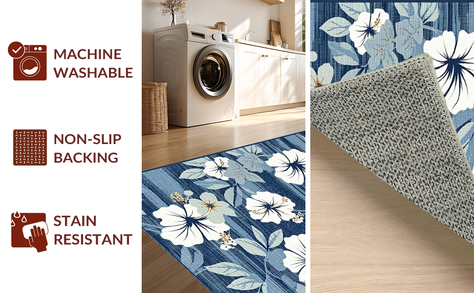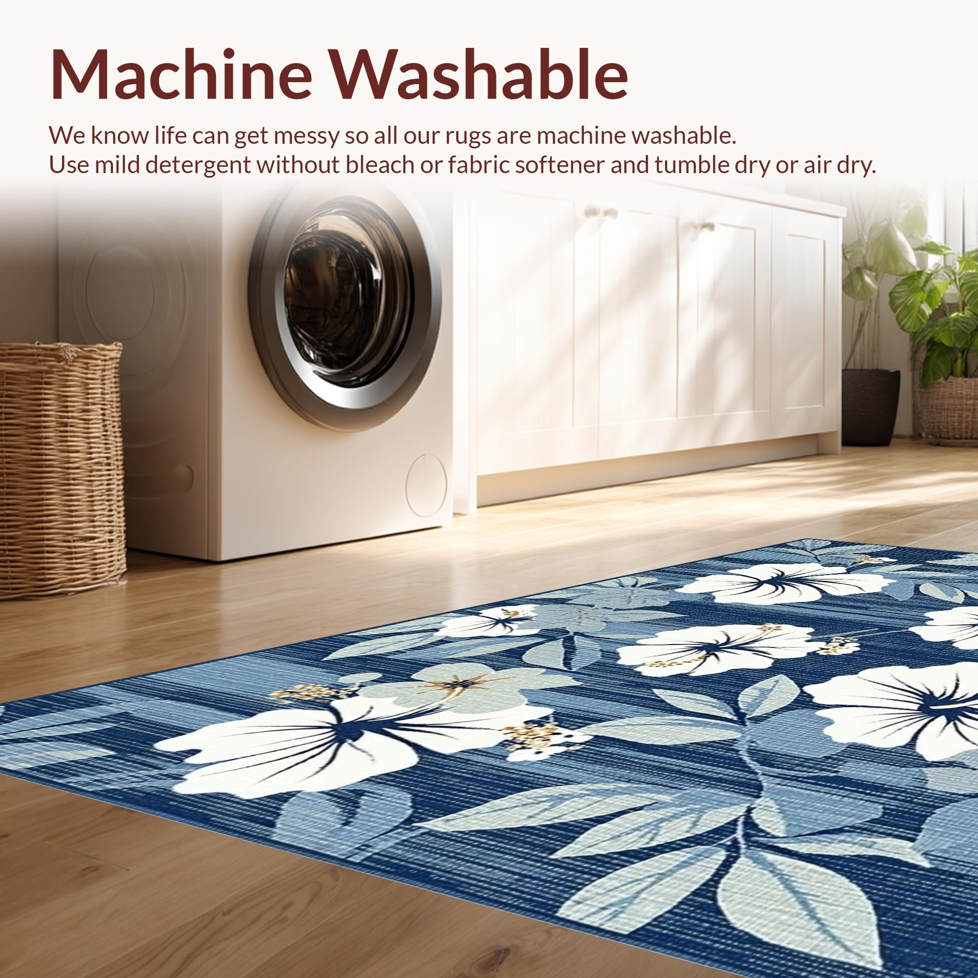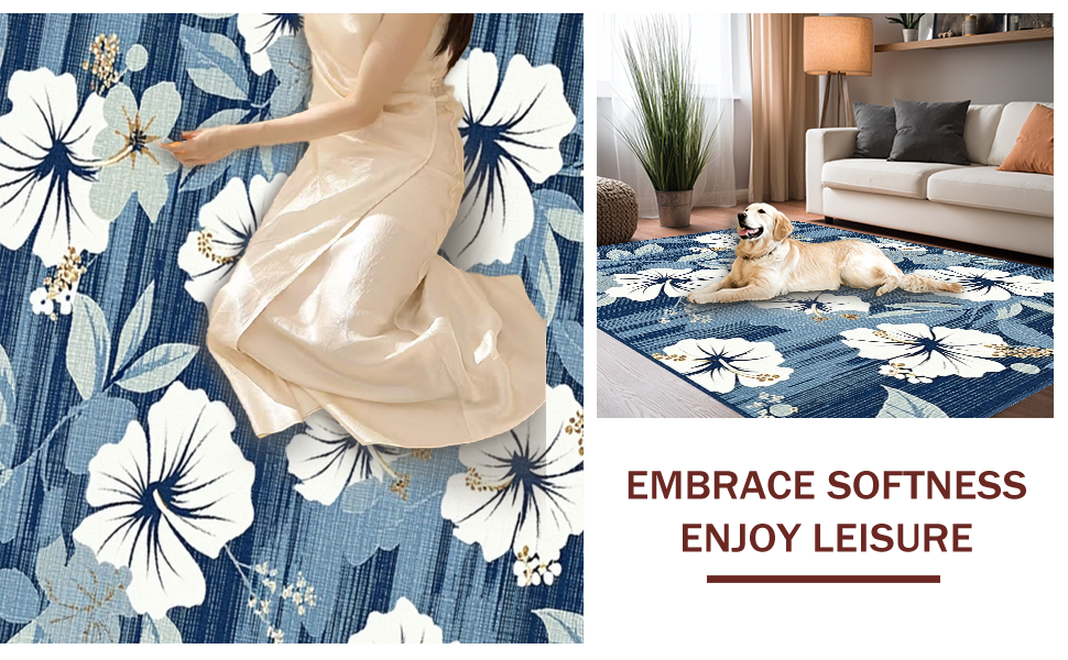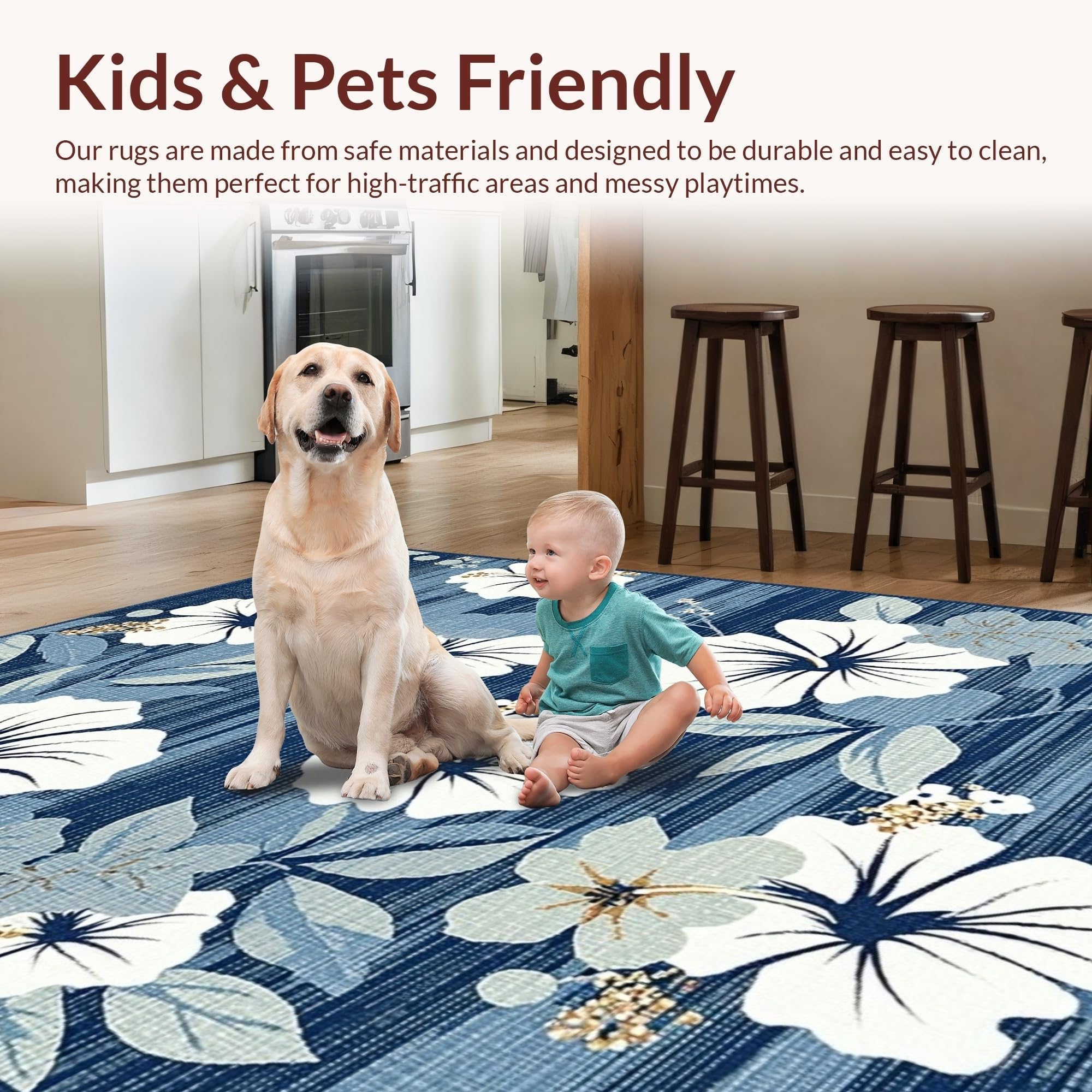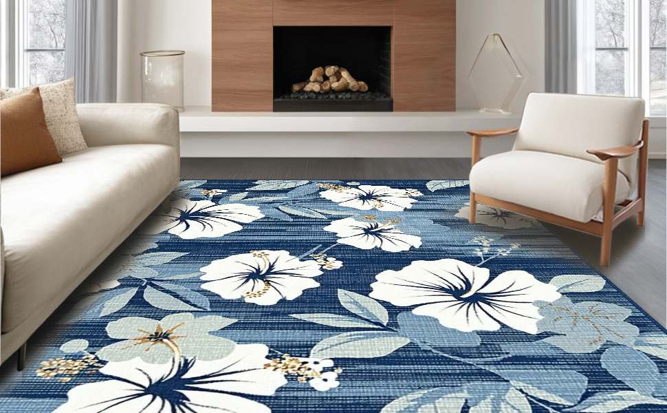 Ultra Soft Area Rug, Non Slip, Stain Resistant, Washable Area Rugs for Living Room, Bedroom, Coastal Hibiscus Floral Accent(Blue) Overview: