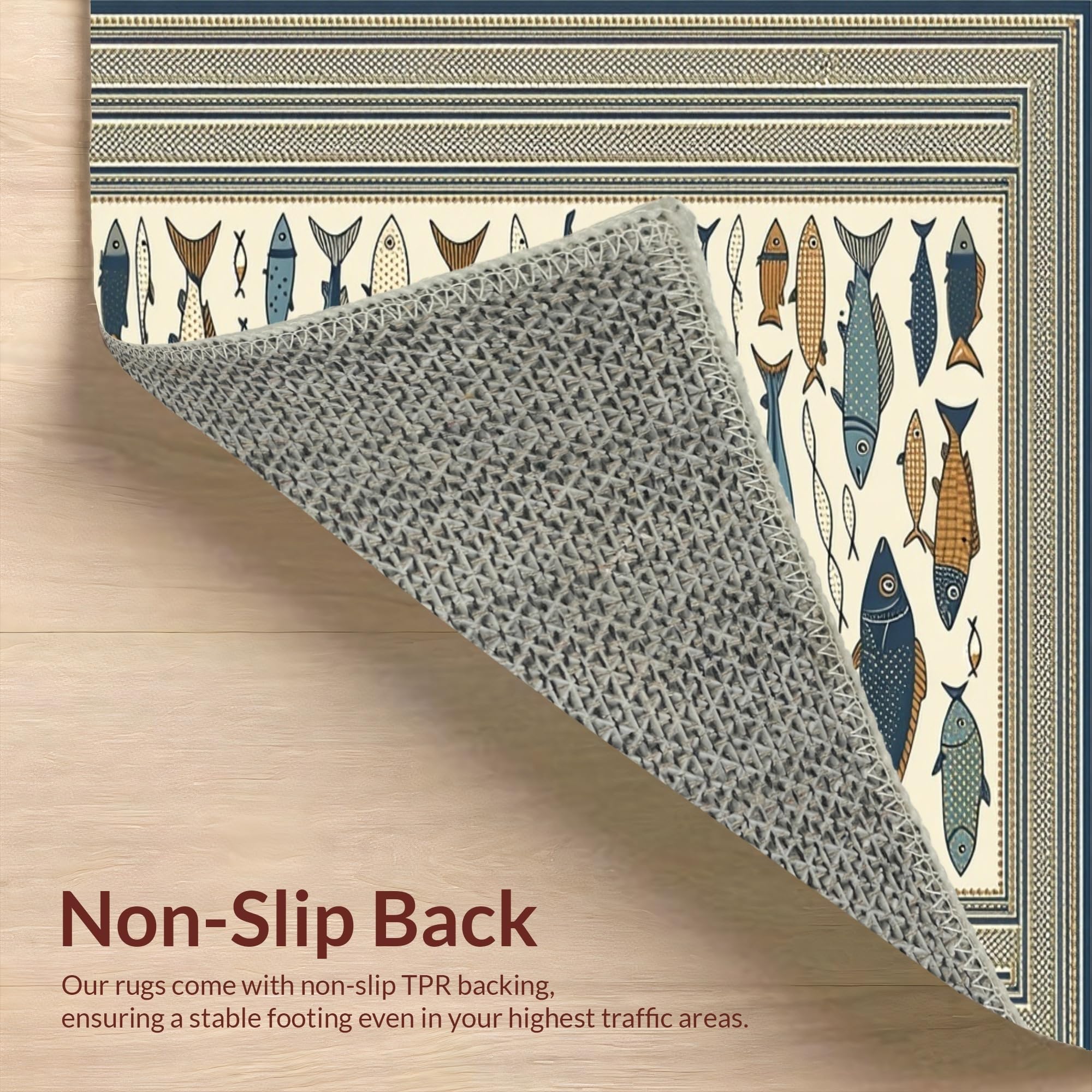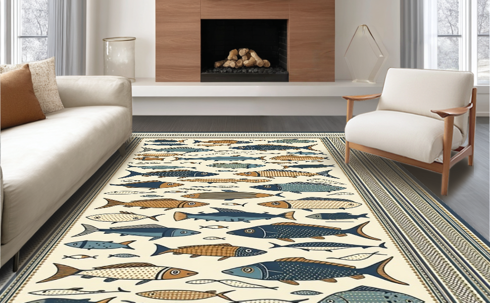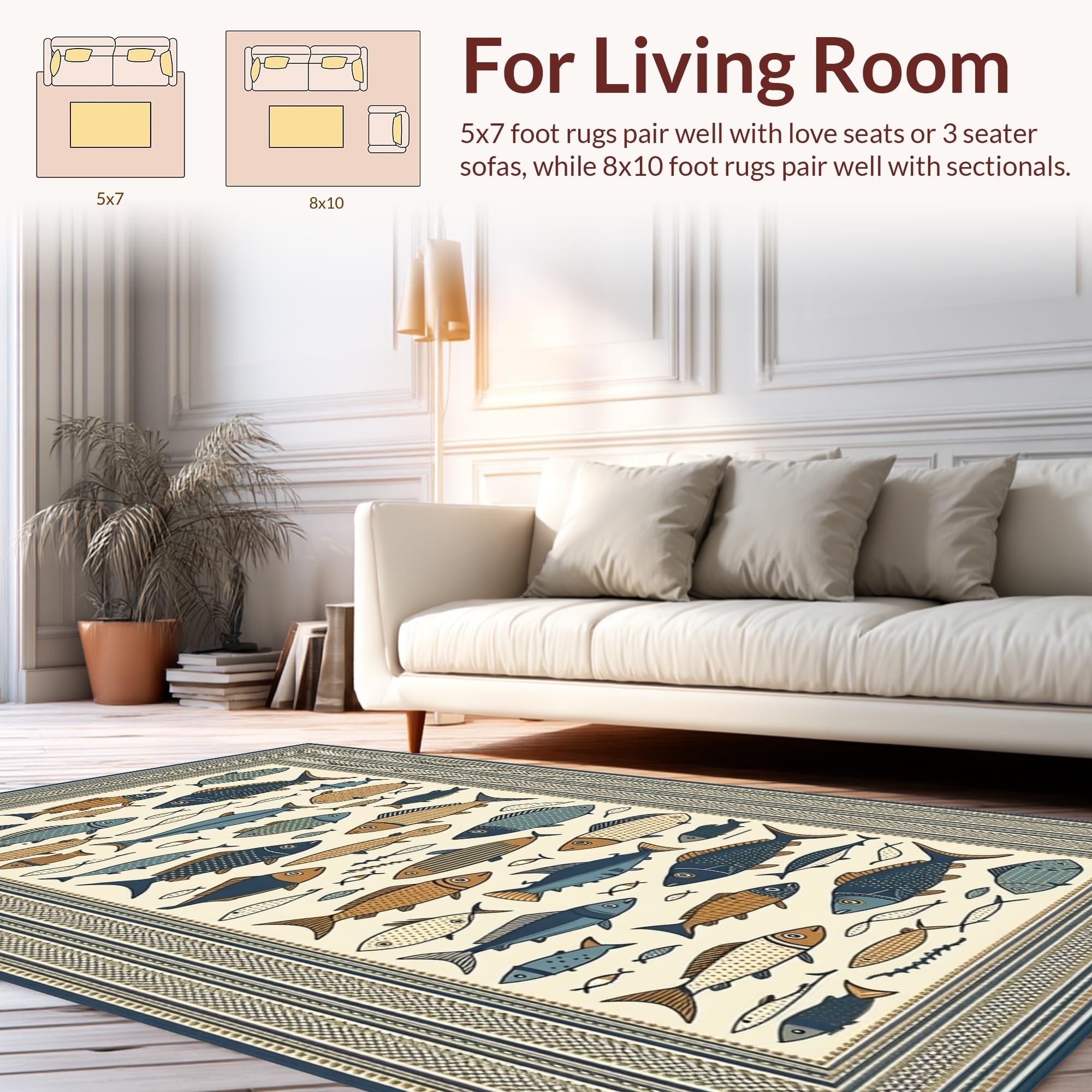 Ultra Soft Area Rug, Non Slip, Stain Resistant, Washable Area Rugs for Living Room, Bedroom, Coastal Nautical Fish Motif(White) Overview:
