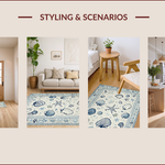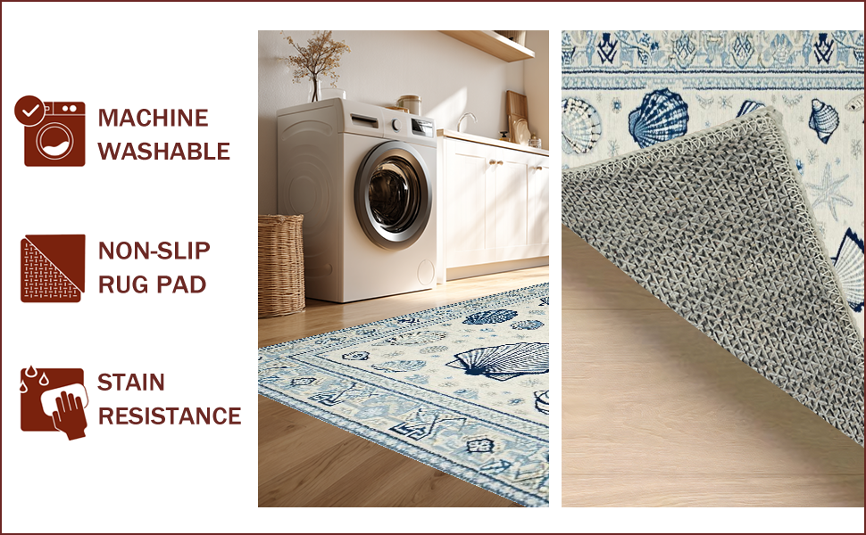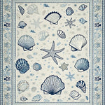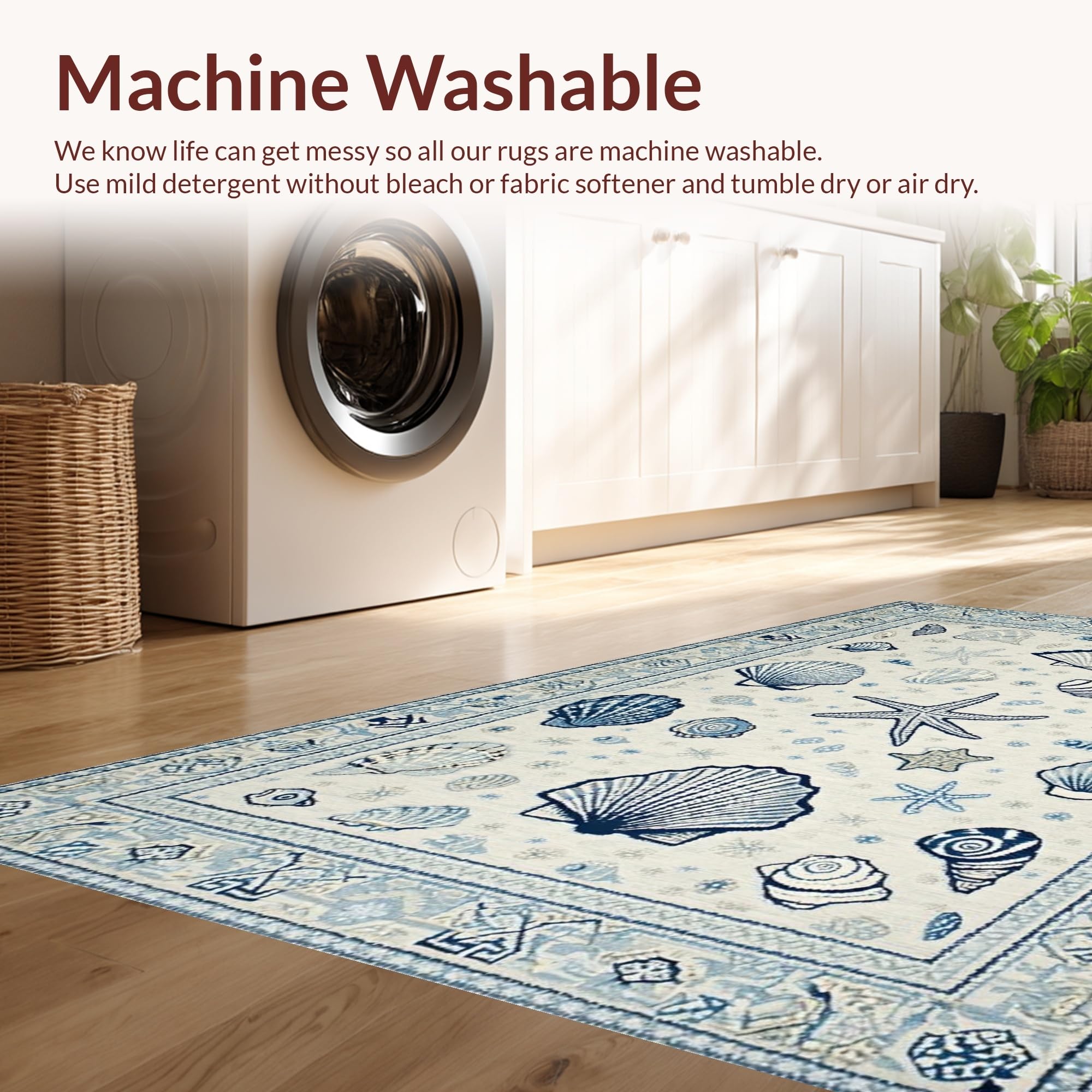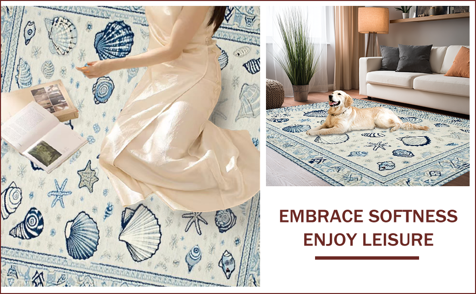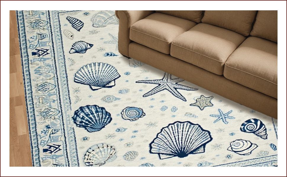 Ultra Soft Area Rug, Non Slip, Stain Resistant, Washable Area Rugs for Living Room, Bedroom, Coastal Shell Motif with Blue Hues(Blue) Overview: