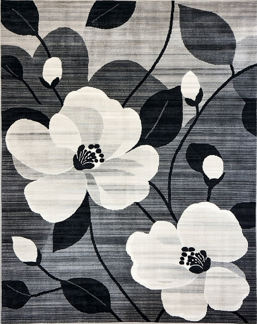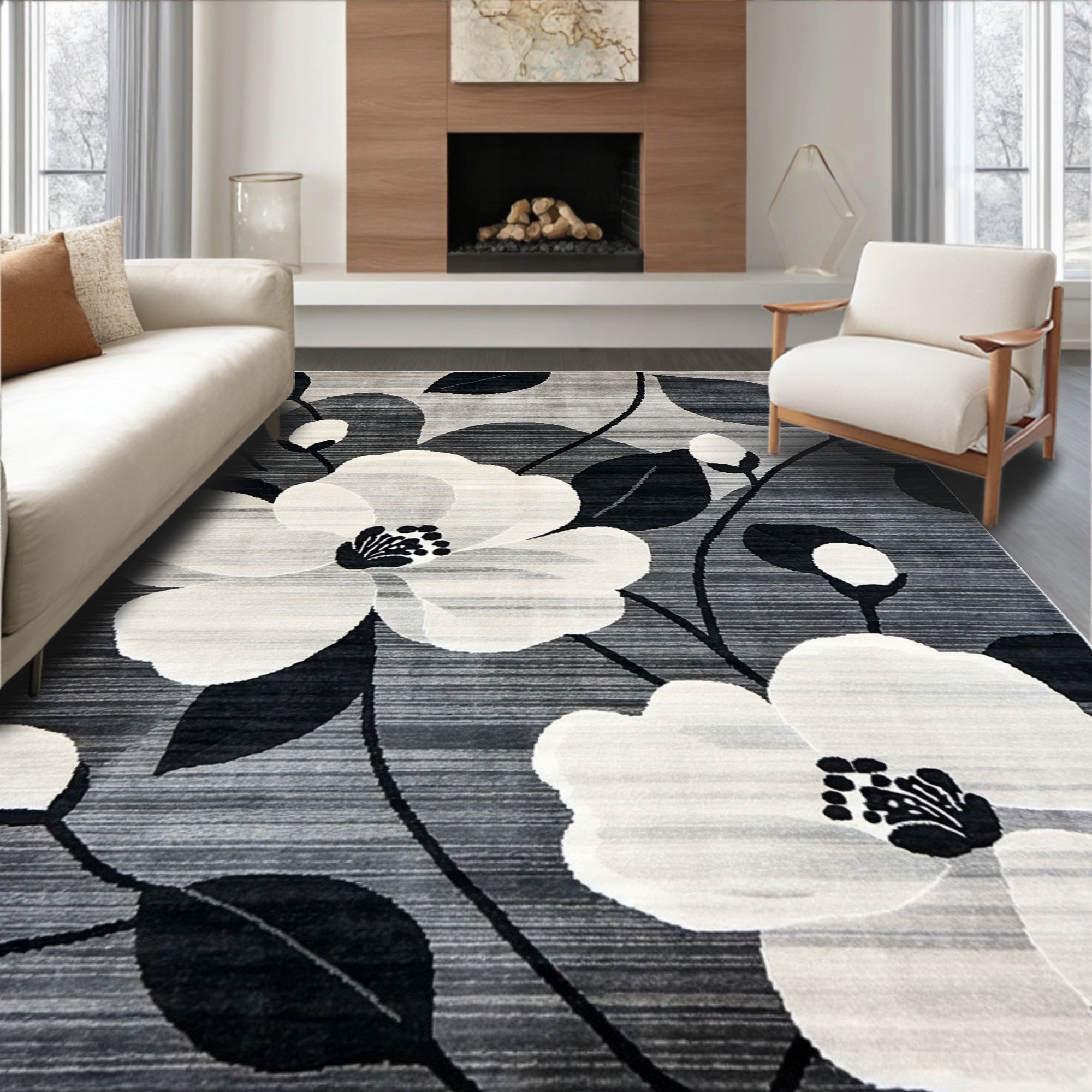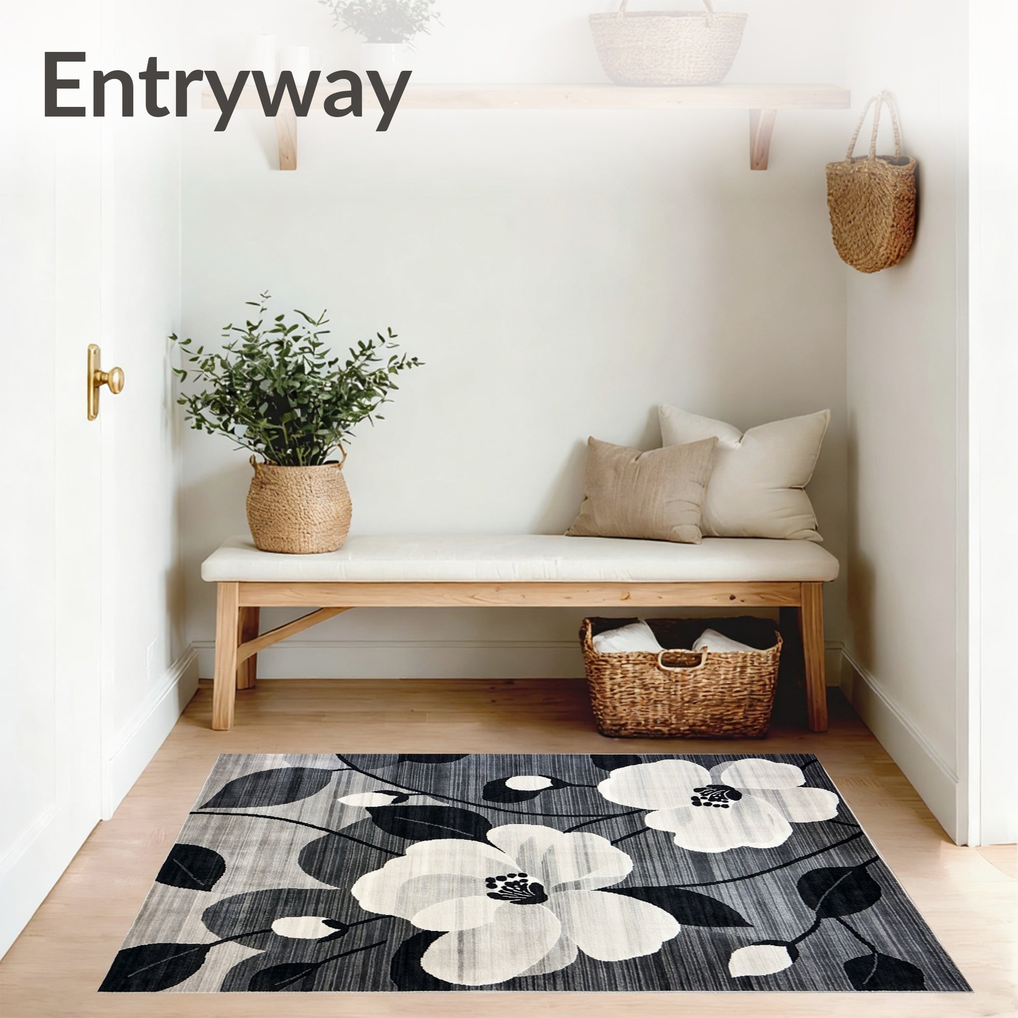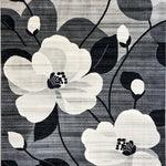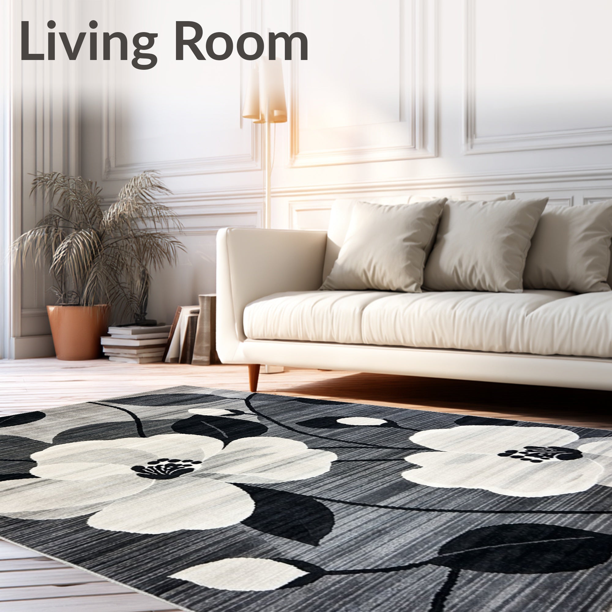 Flatwoven High Traffic Area Rug, Contemporary Black and Grey Floral with Artistic Detailing, Non Slip, Stain Resistant, Washable Area Rugs for Living Room, Bedroom (White) Overview: