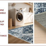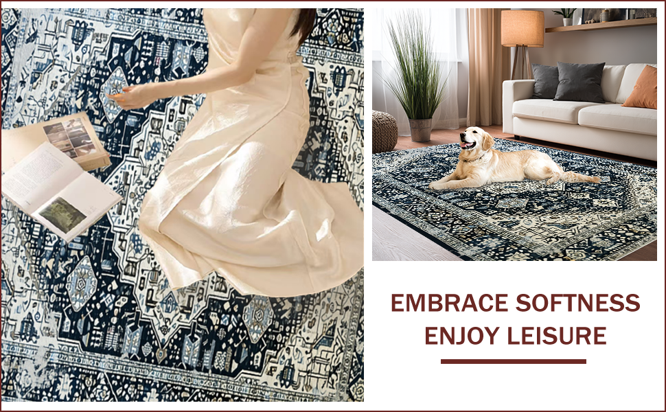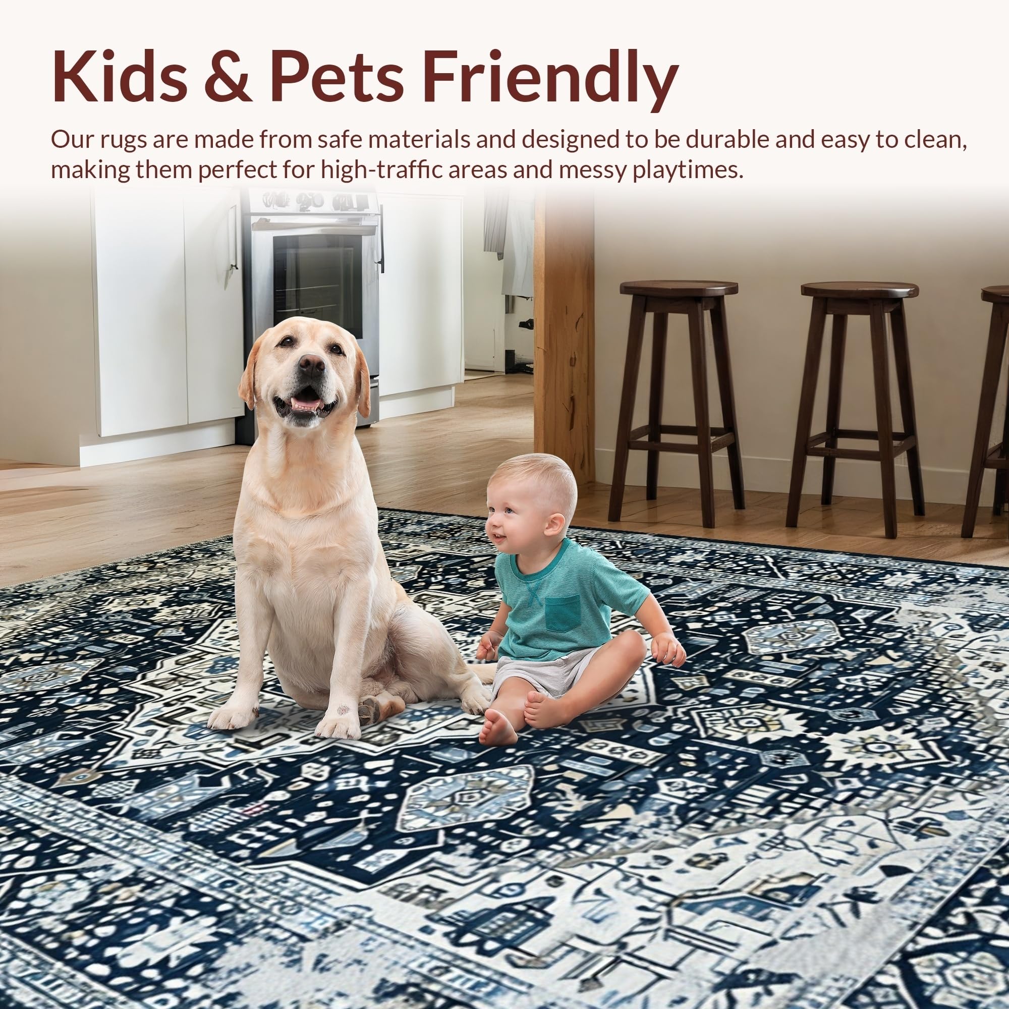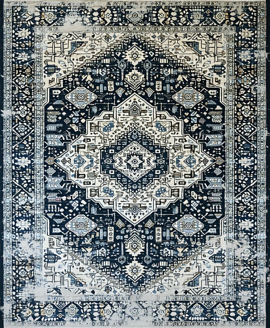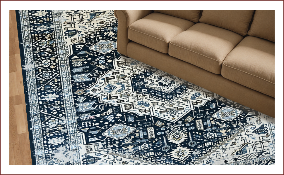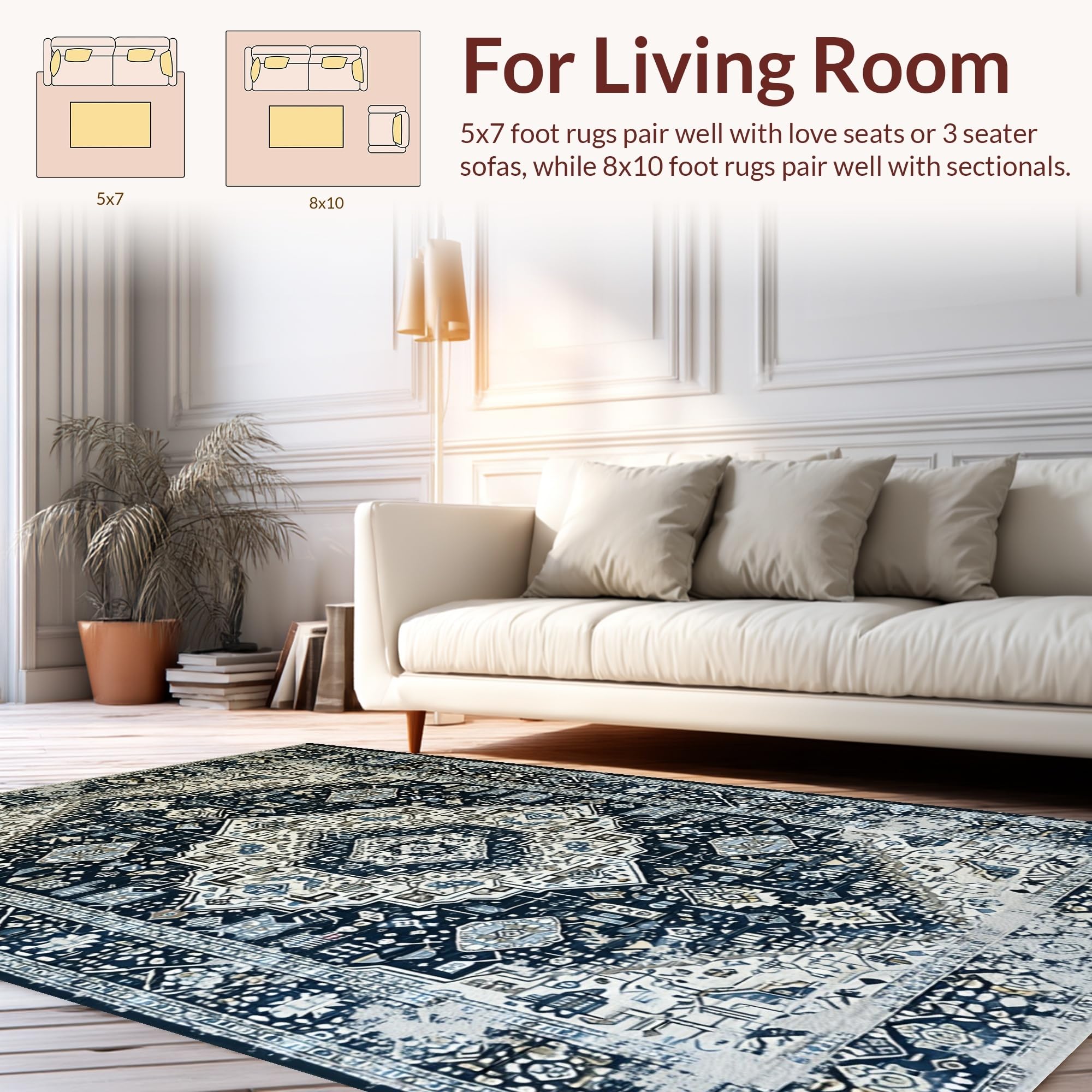 Ultra Soft Area Rug, Non Slip, Stain Resistant, Washable Area Rugs for Living Room, Bedroom, Contemporary Black and Ivory Medallion(Blue) Overview: