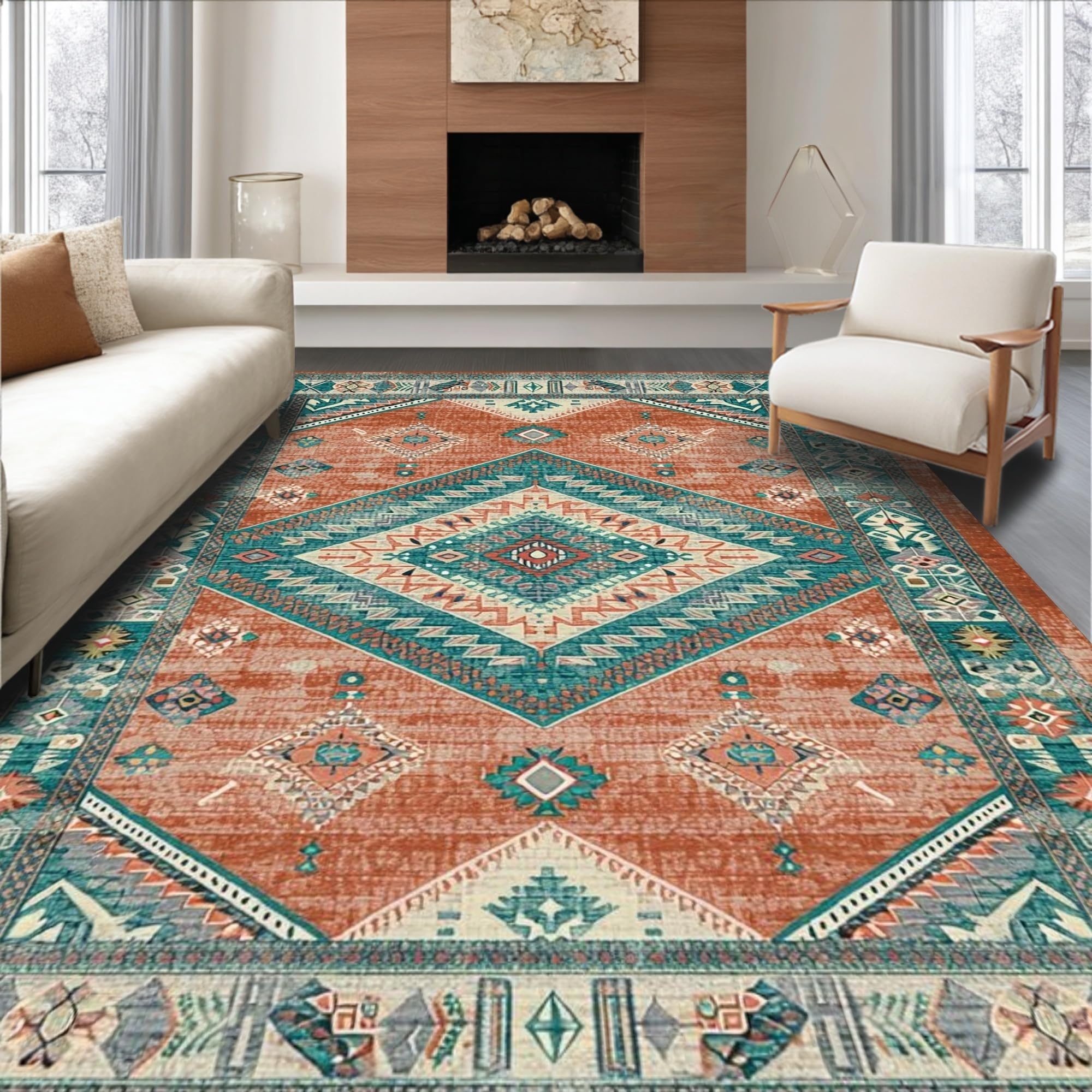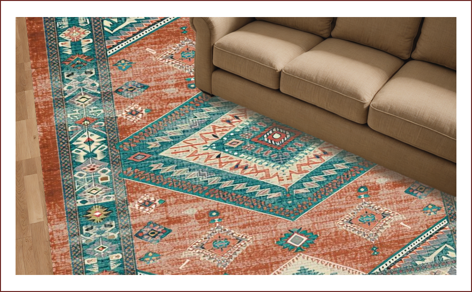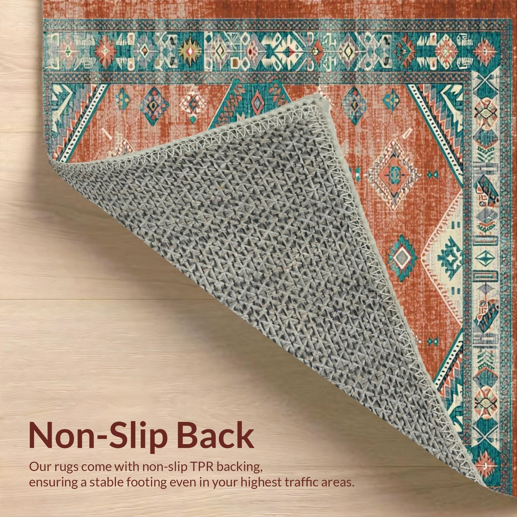 Ultra Soft Area Rug, Non Slip, Stain Resistant, Washable Area Rugs for Living Room, Bedroom, Contemporary Teal and Rust Motif(Red) Overview: