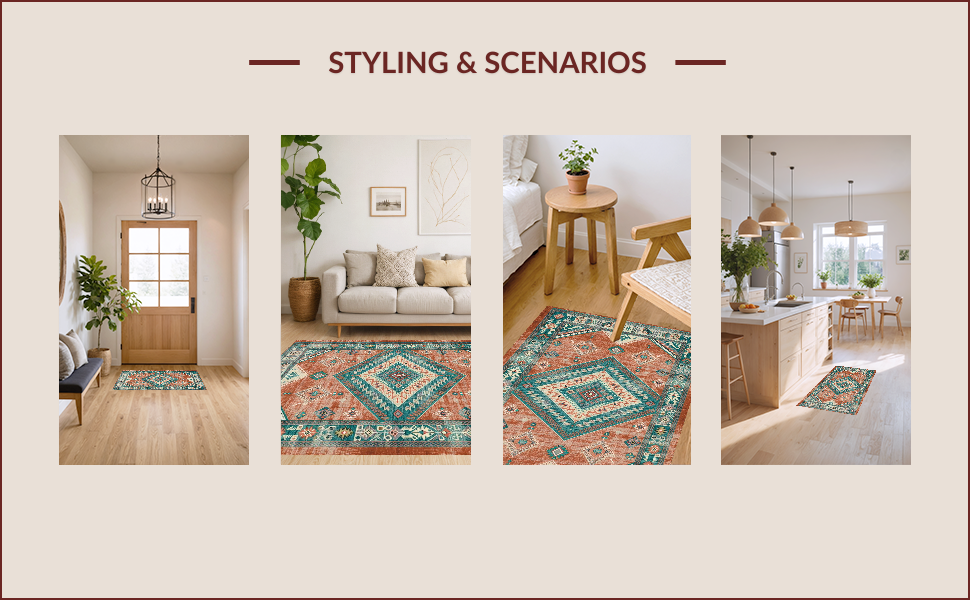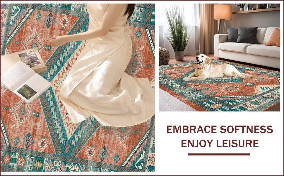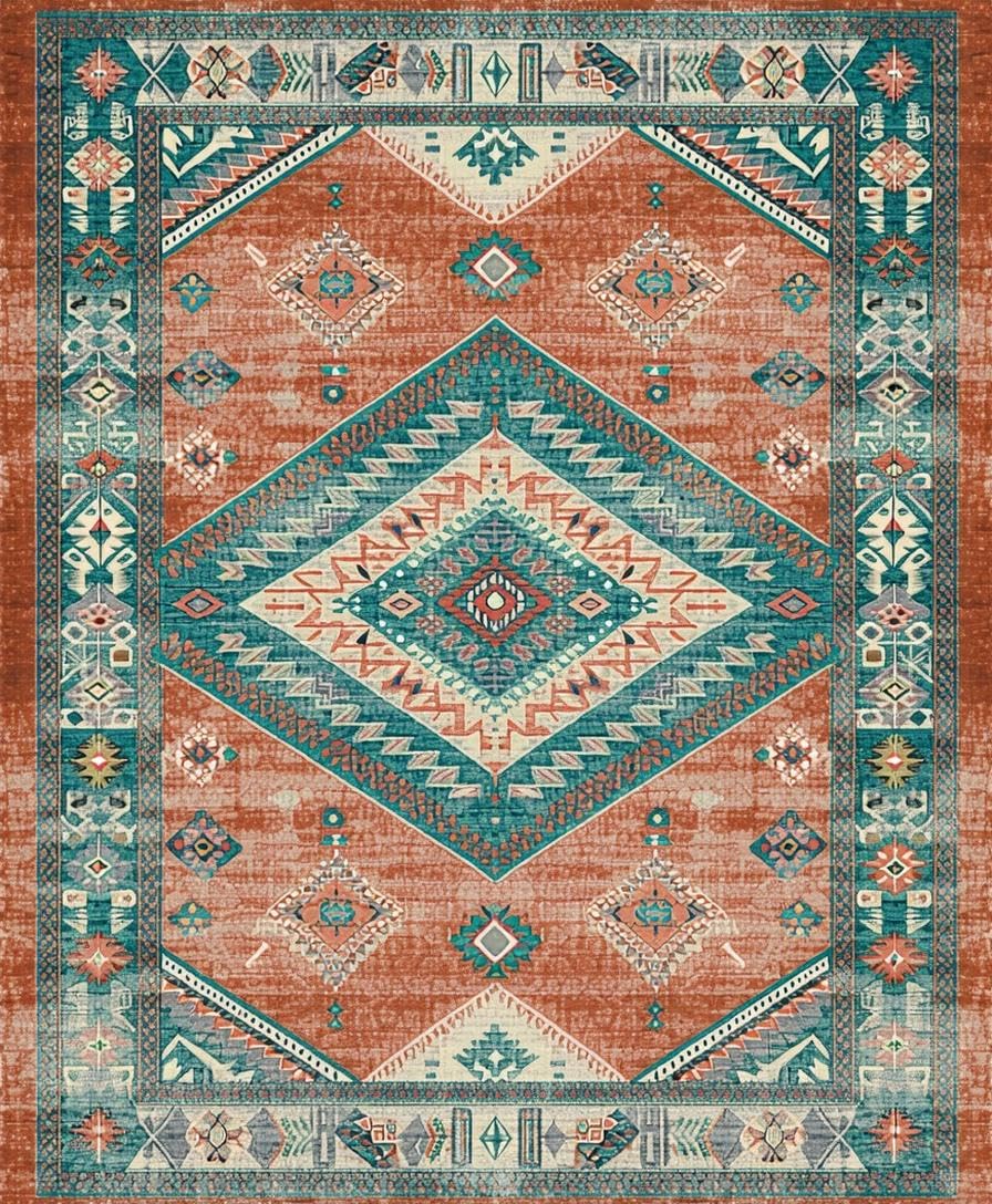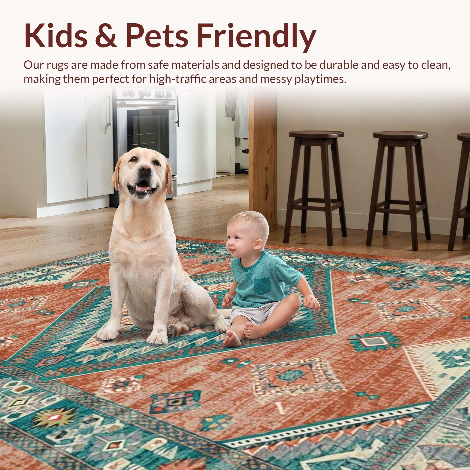 Ultra Soft Area Rug, Non Slip, Stain Resistant, Washable Area Rugs for Living Room, Bedroom, Contemporary Teal and Rust Motif(Red) Overview: