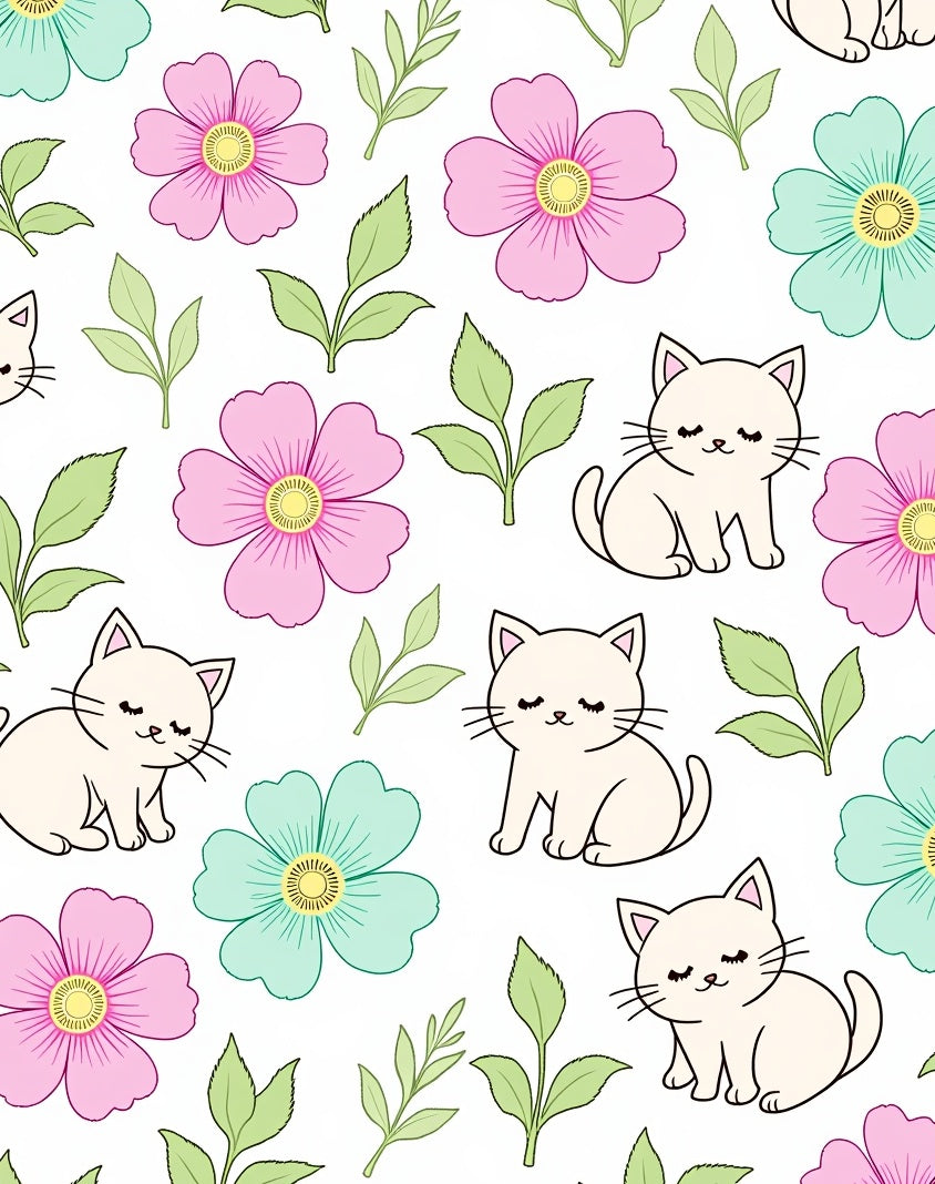Cute Kitten Doodle Collage Fantasy Floral Whisker Art(Pink)