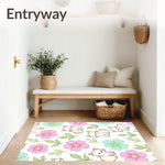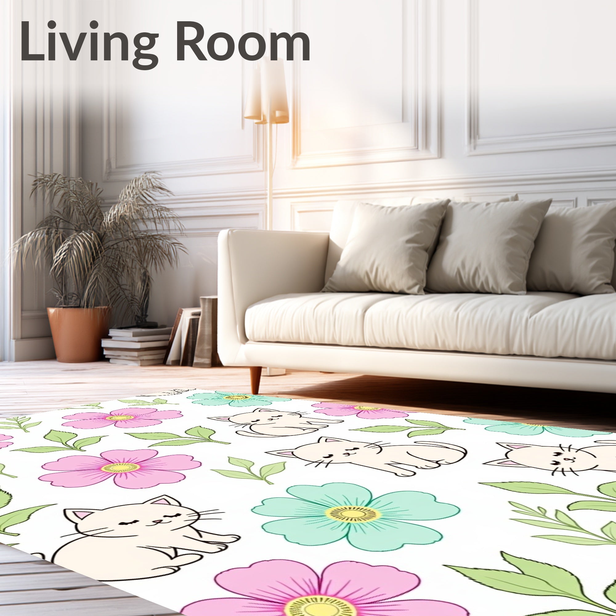 Flatwoven High Traffic Area Rug, Cute Kitten Doodle Collage Fantasy Floral Whisker Art, Non Slip, Stain Resistant, Washable Area Rugs for Living Room, Bedroom (Pink) Overview: