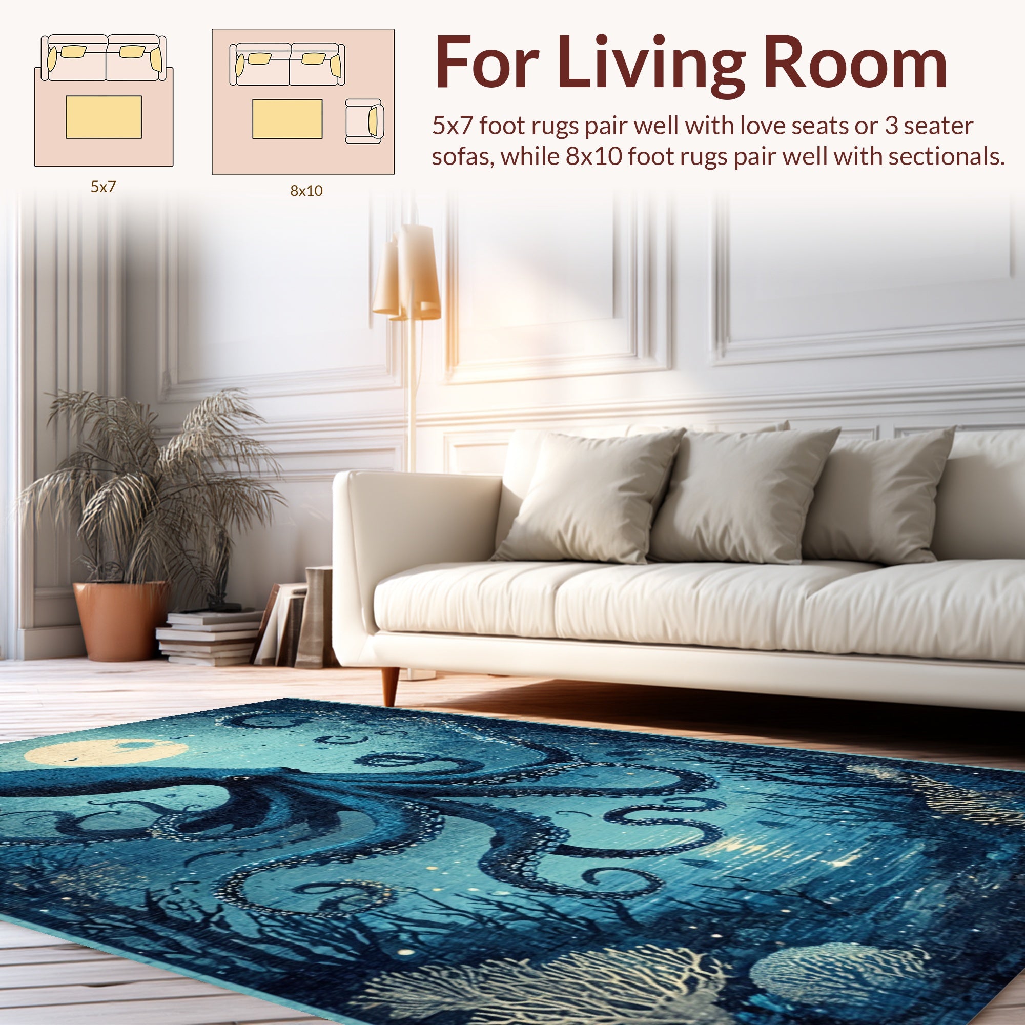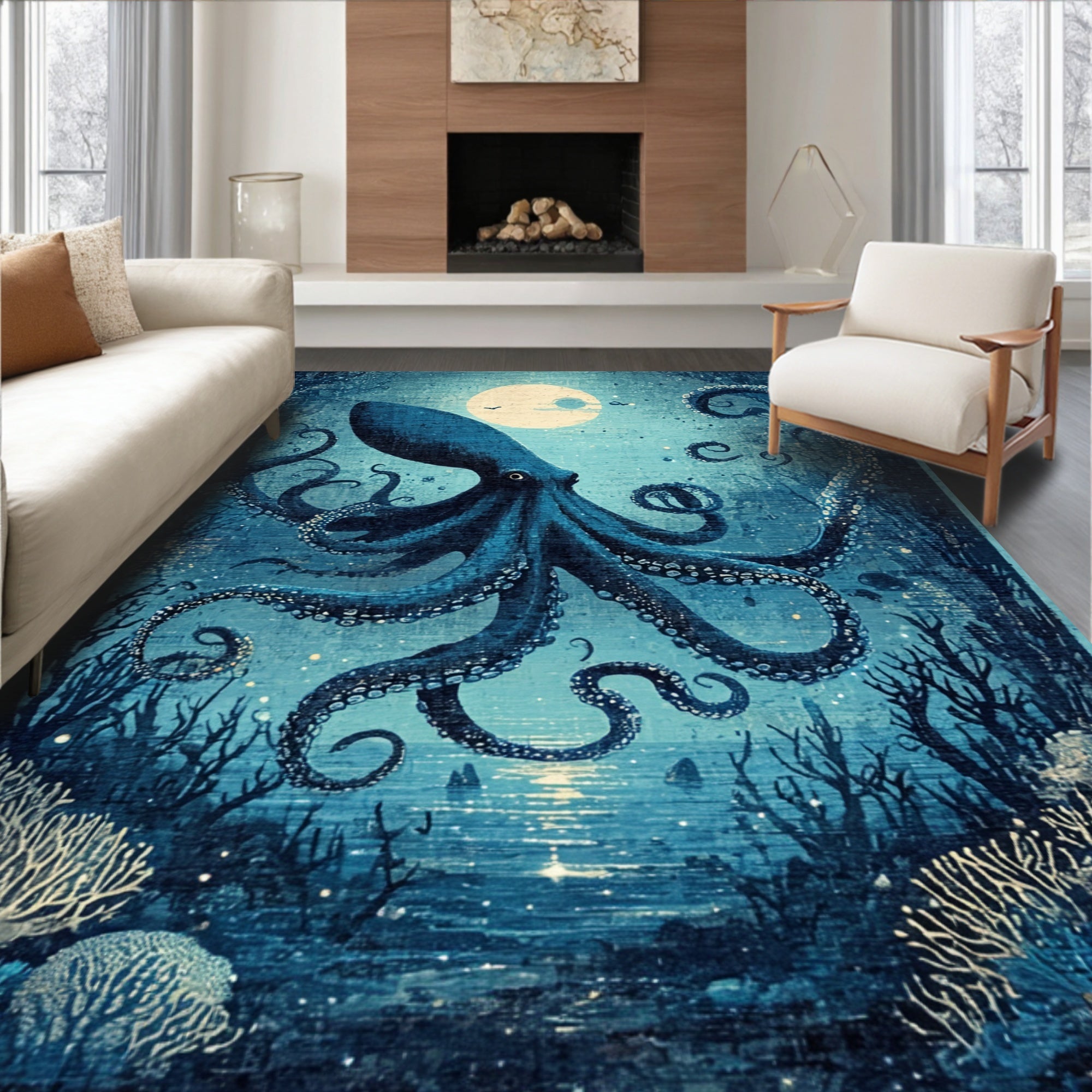 Flatwoven High Traffic Area Rug, Deep Sea Kraken Nautical With Tentacle Design Maritime Ocean Theme, Non Slip, Stain Resistant, Washable Area Rugs for Living Room, Bedroom (Blue) Overview:
