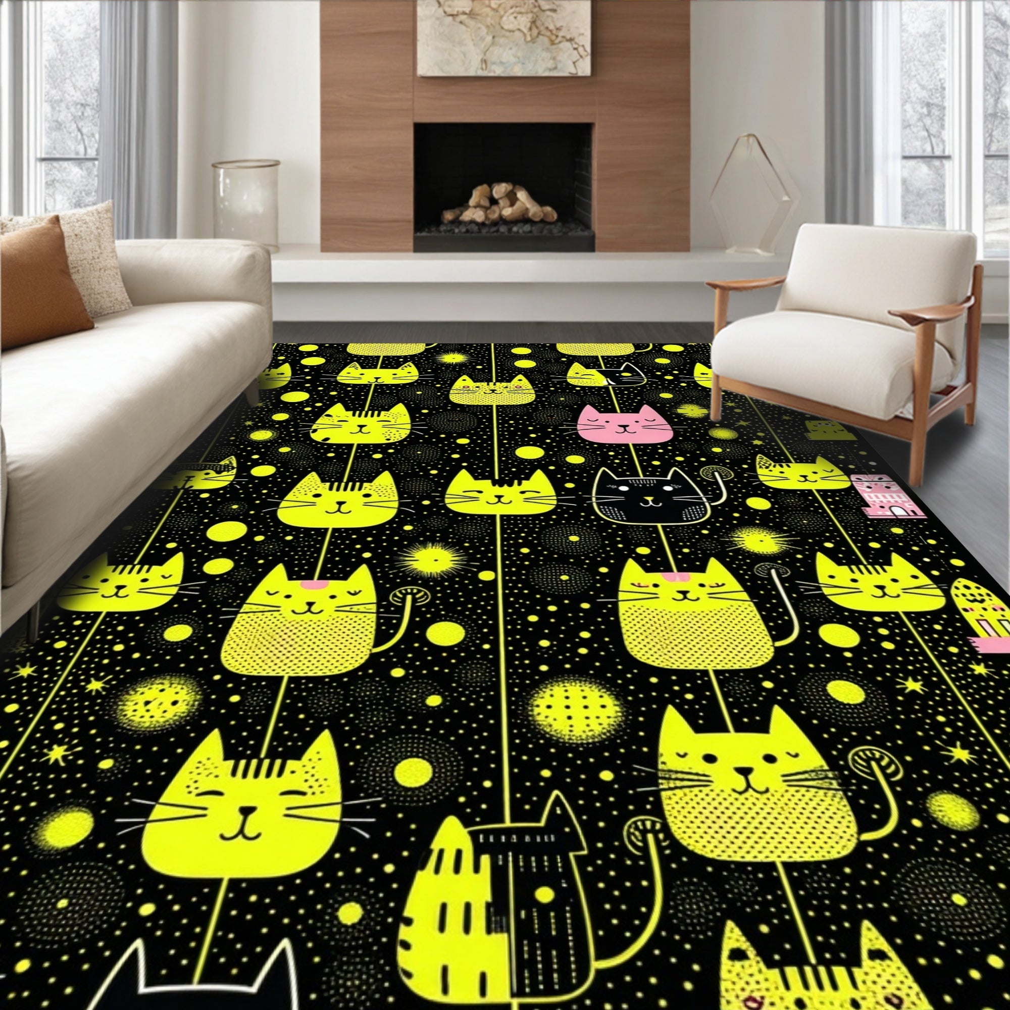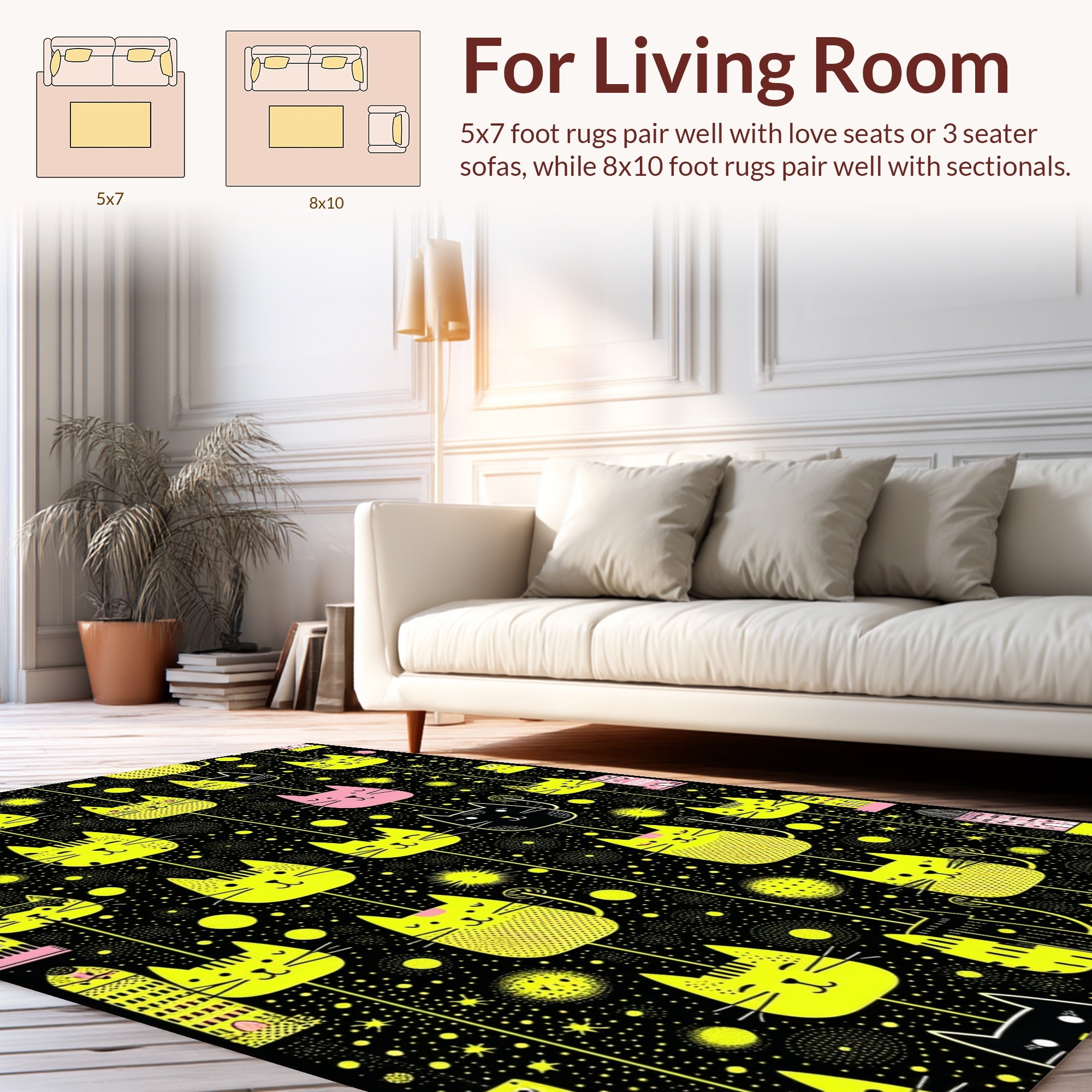 Flatwoven High Traffic Area Rug, Delightful Friendly Cat Imagery, Non Slip, Stain Resistant, Washable Area Rugs for Living Room, Bedroom (Black) Overview: