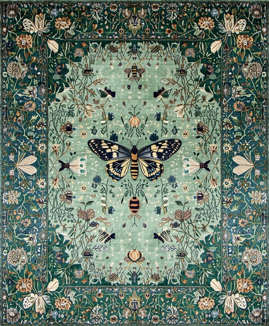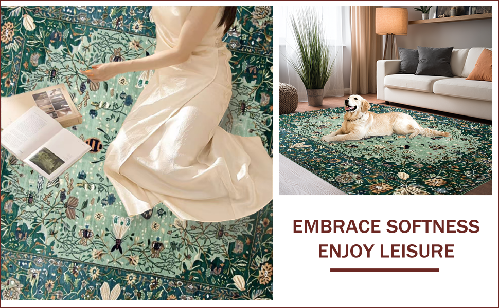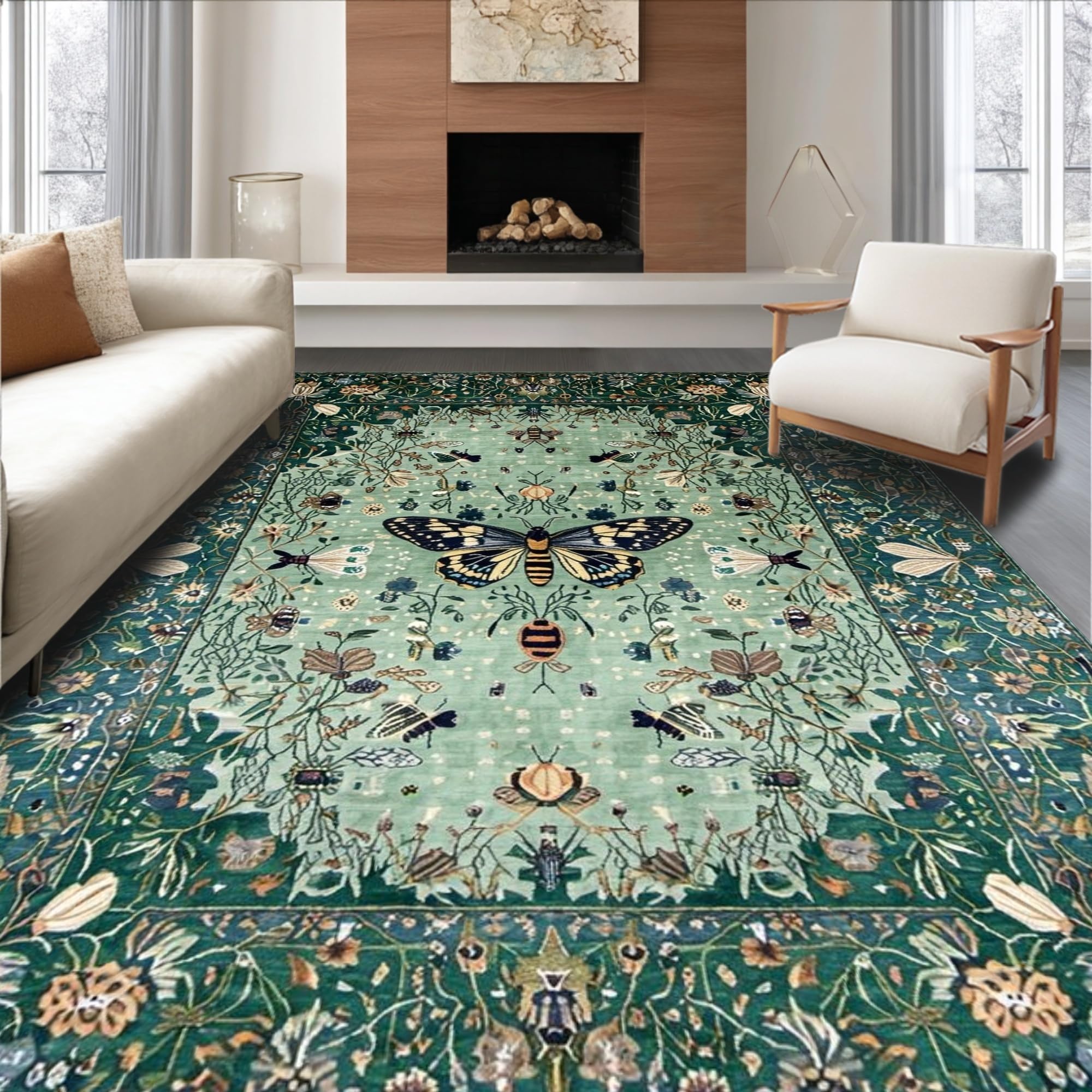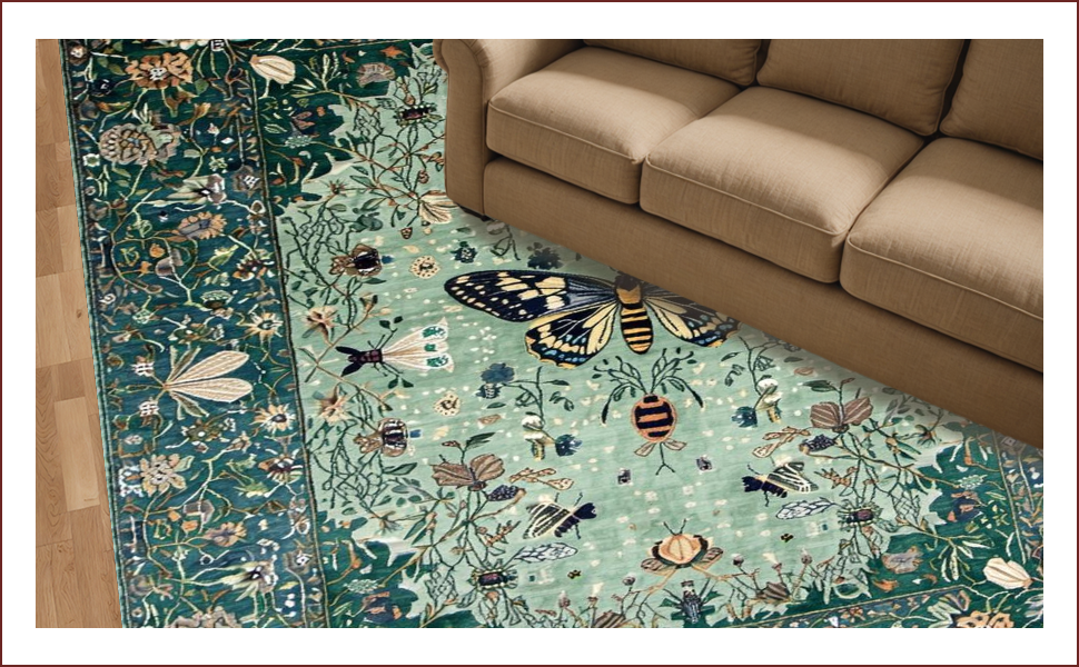 Ultra Soft Area Rug, Non Slip, Stain Resistant, Washable Area Rugs for Living Room, Bedroom, Distinctive Forest Green Insect Motif(Green) Overview: