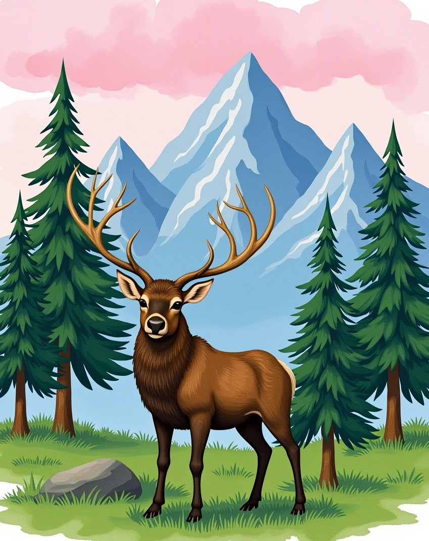 Dreamy Mountain Elk Pine Tree Landscape Floor(Brown)