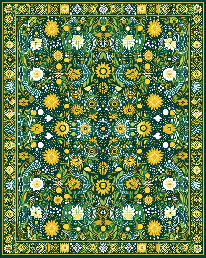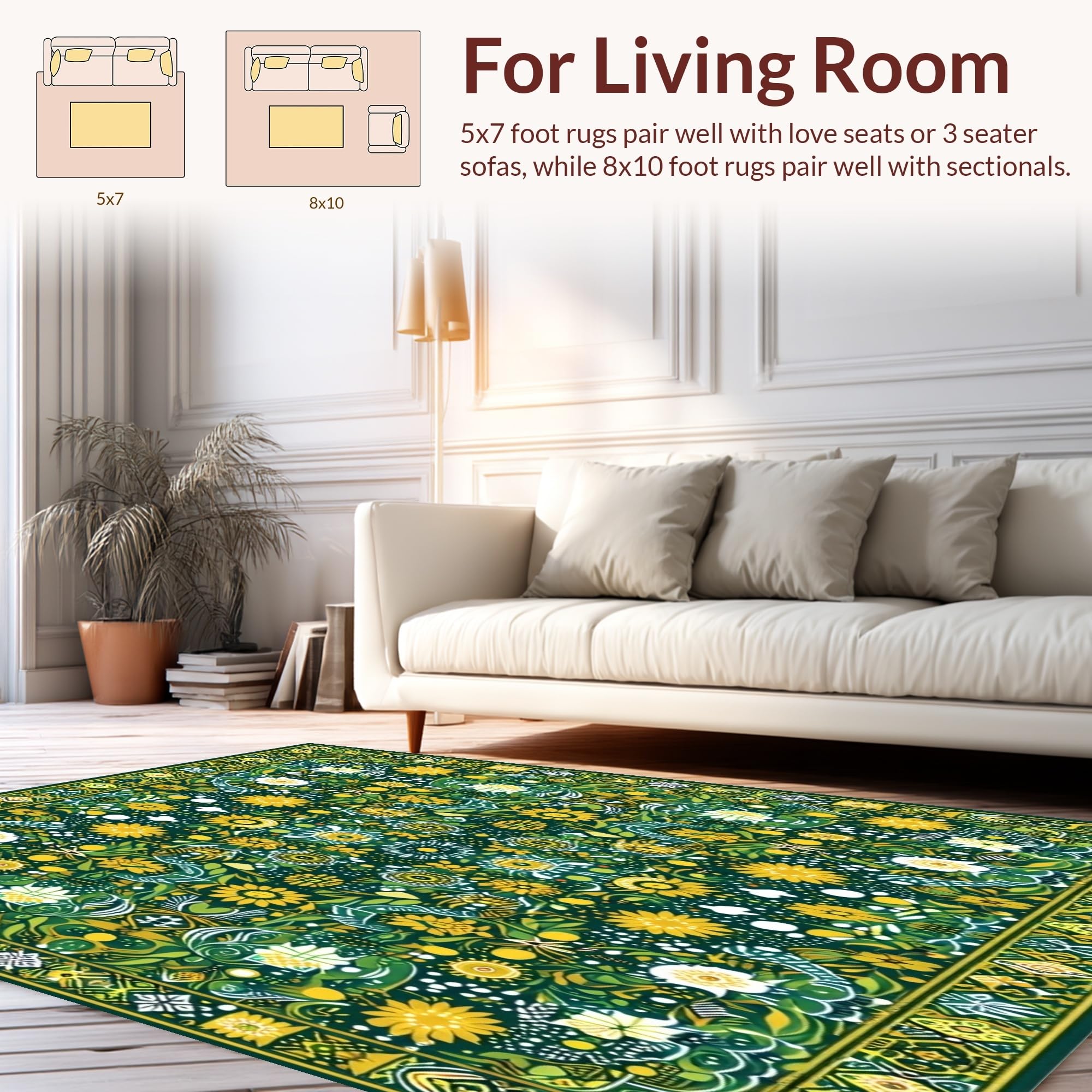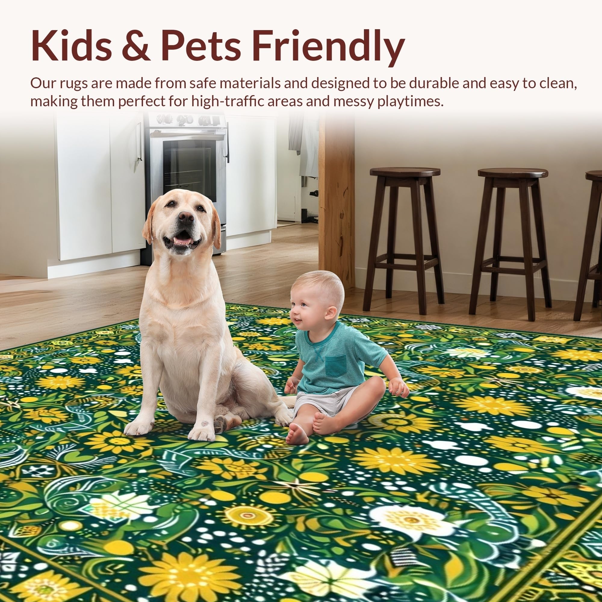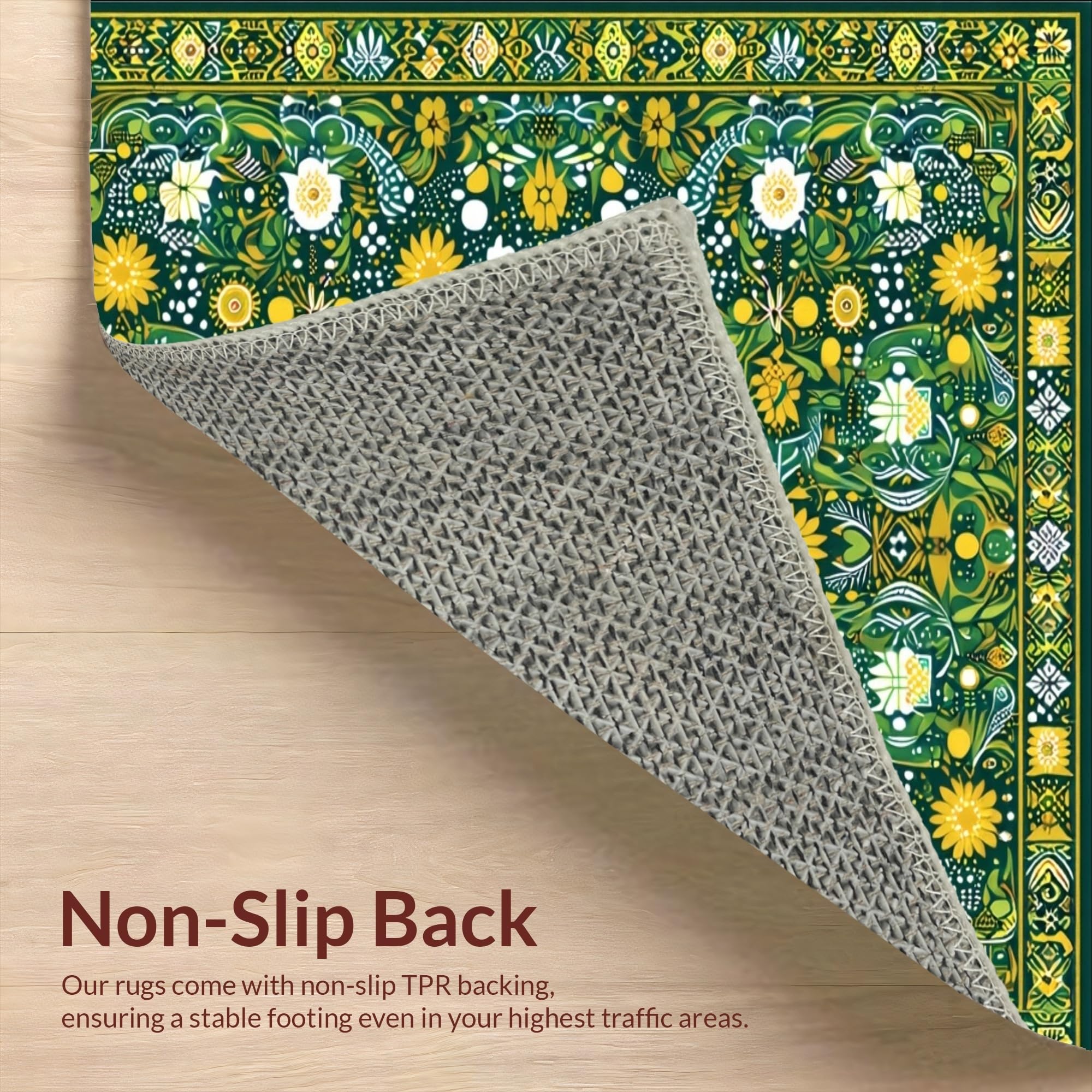 Ultra Soft Area Rug, Non Slip, Stain Resistant, Washable Area Rugs for Living Room, Bedroom, Eclectic Boho Area in Emerald Green with Golden Yellow Swirls(Green) Overview: