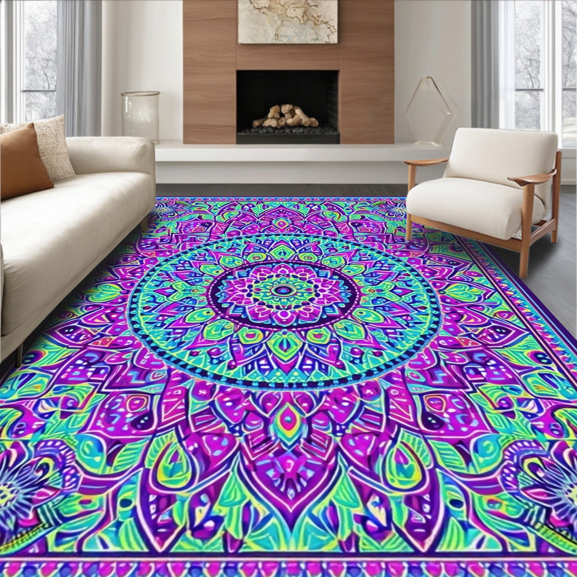 Flatwoven High Traffic Area Rug, Eclectic Colorful Medallion Design, Non Slip, Stain Resistant, Washable Area Rugs for Living Room, Bedroom (Purple) Overview: