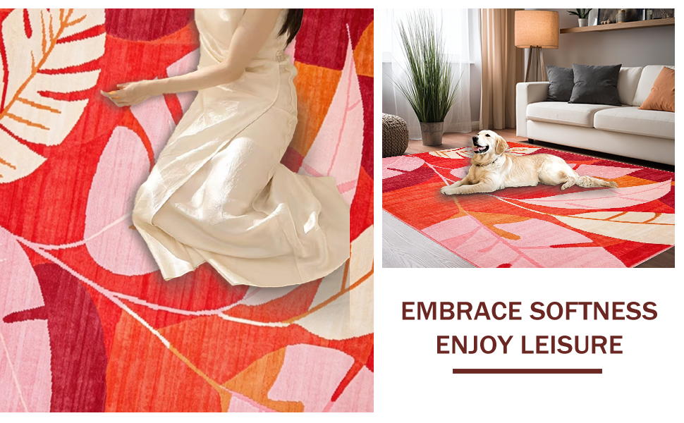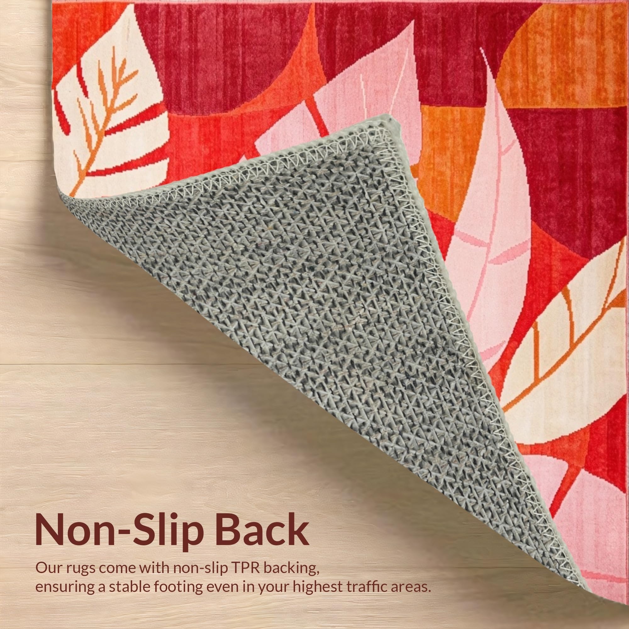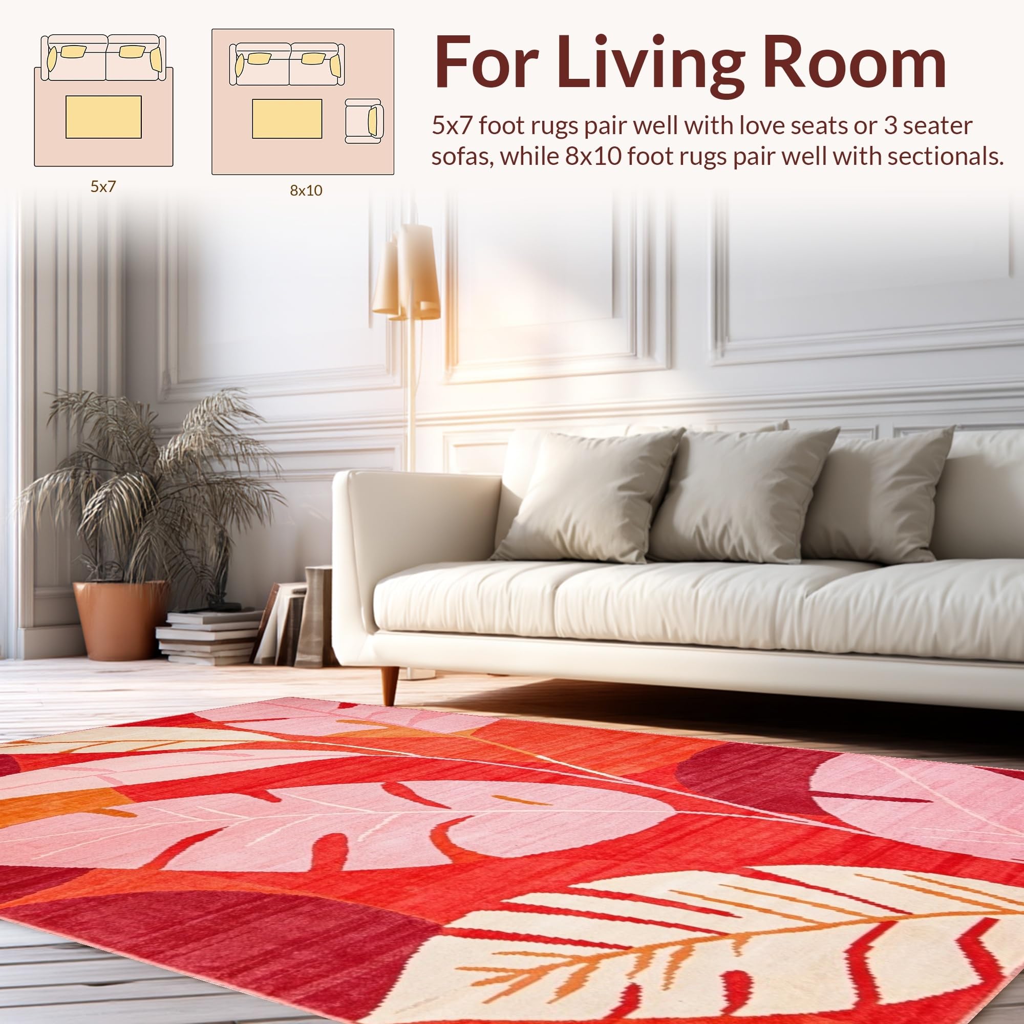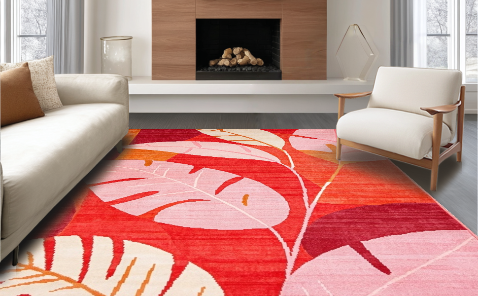 Ultra Soft Area Rug, Non Slip, Stain Resistant, Washable Area Rugs for Living Room, Bedroom, Eclectic Modern Leaf Silhouettes(Red) Overview: