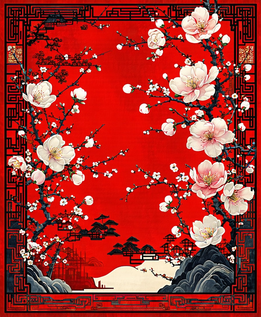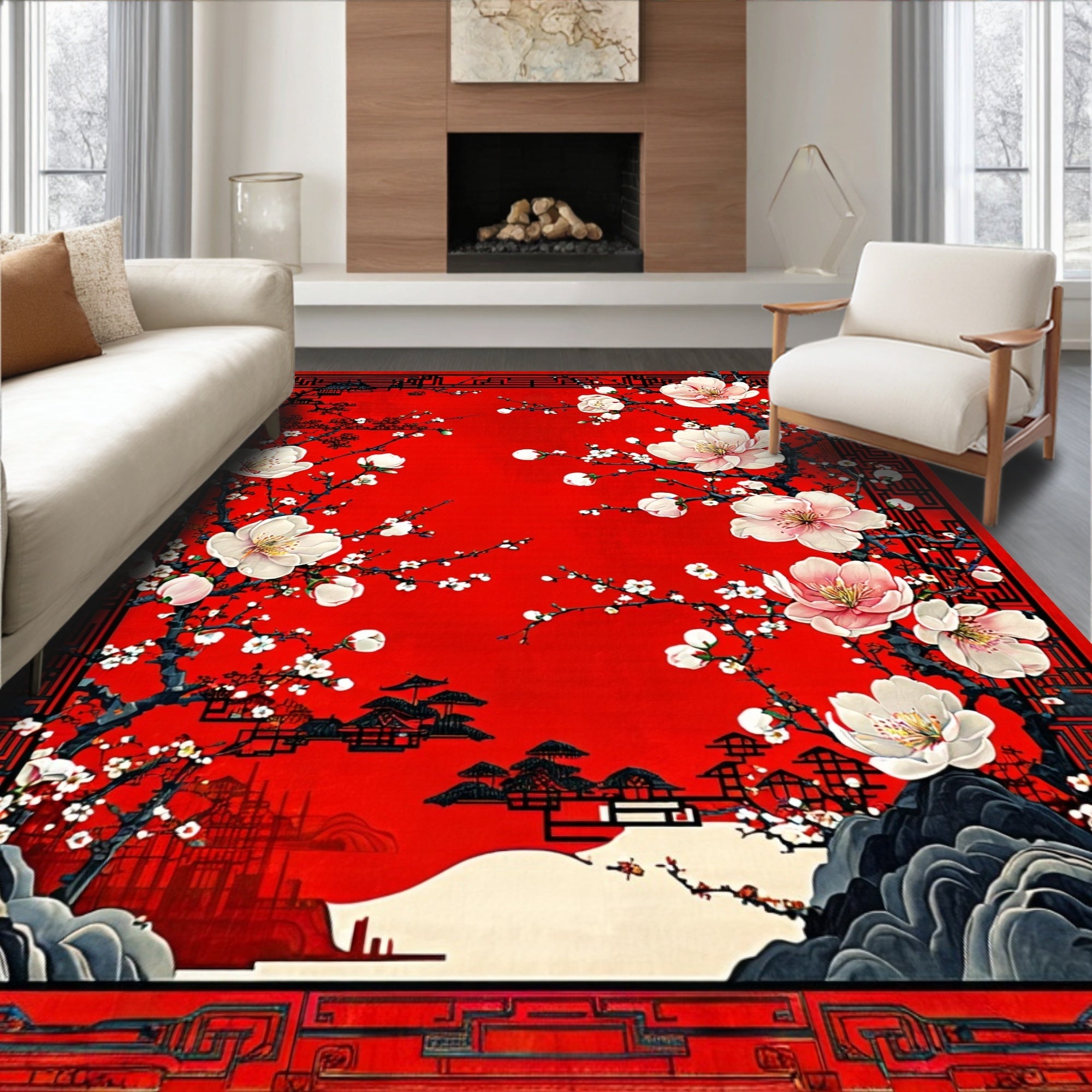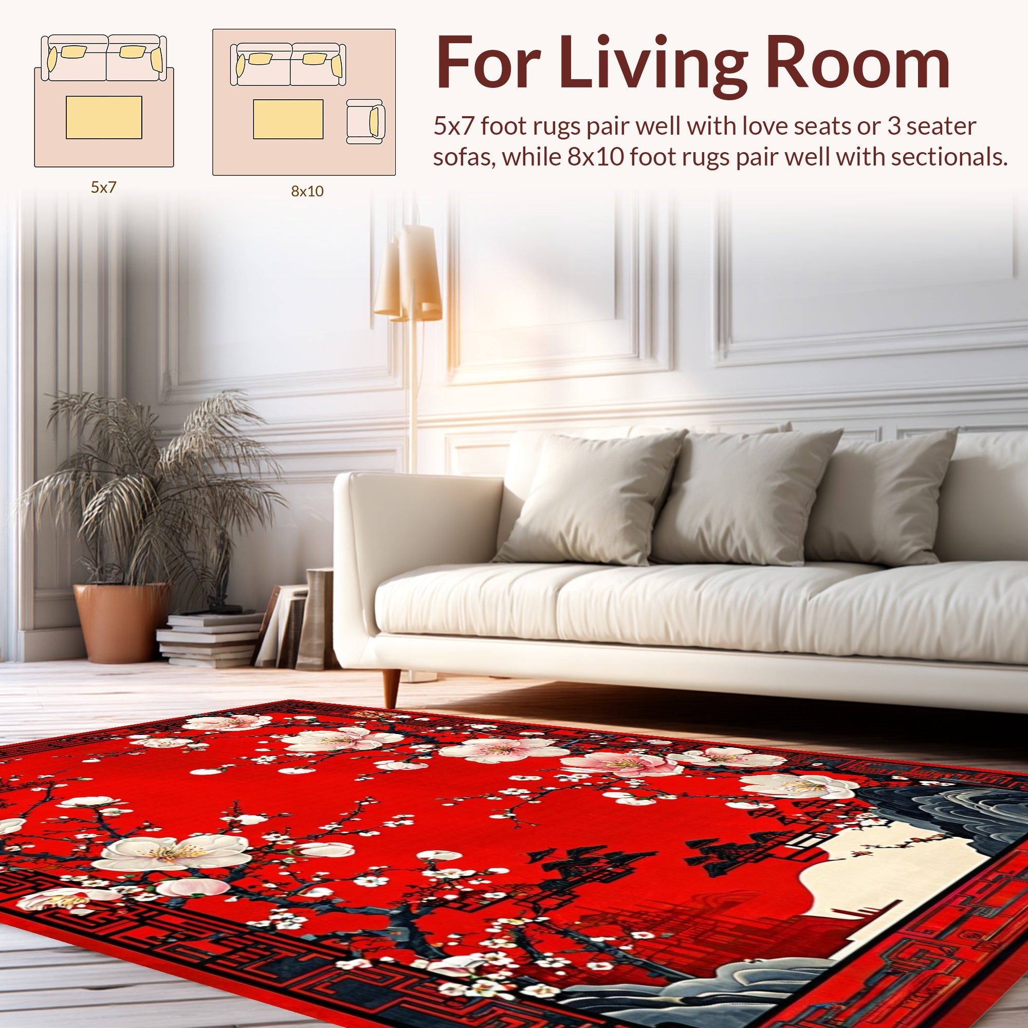 Flatwoven High Traffic Area Rug, Elegant Asian Floral Motif, Non Slip, Stain Resistant, Washable Area Rugs for Living Room, Bedroom (Red) Overview: