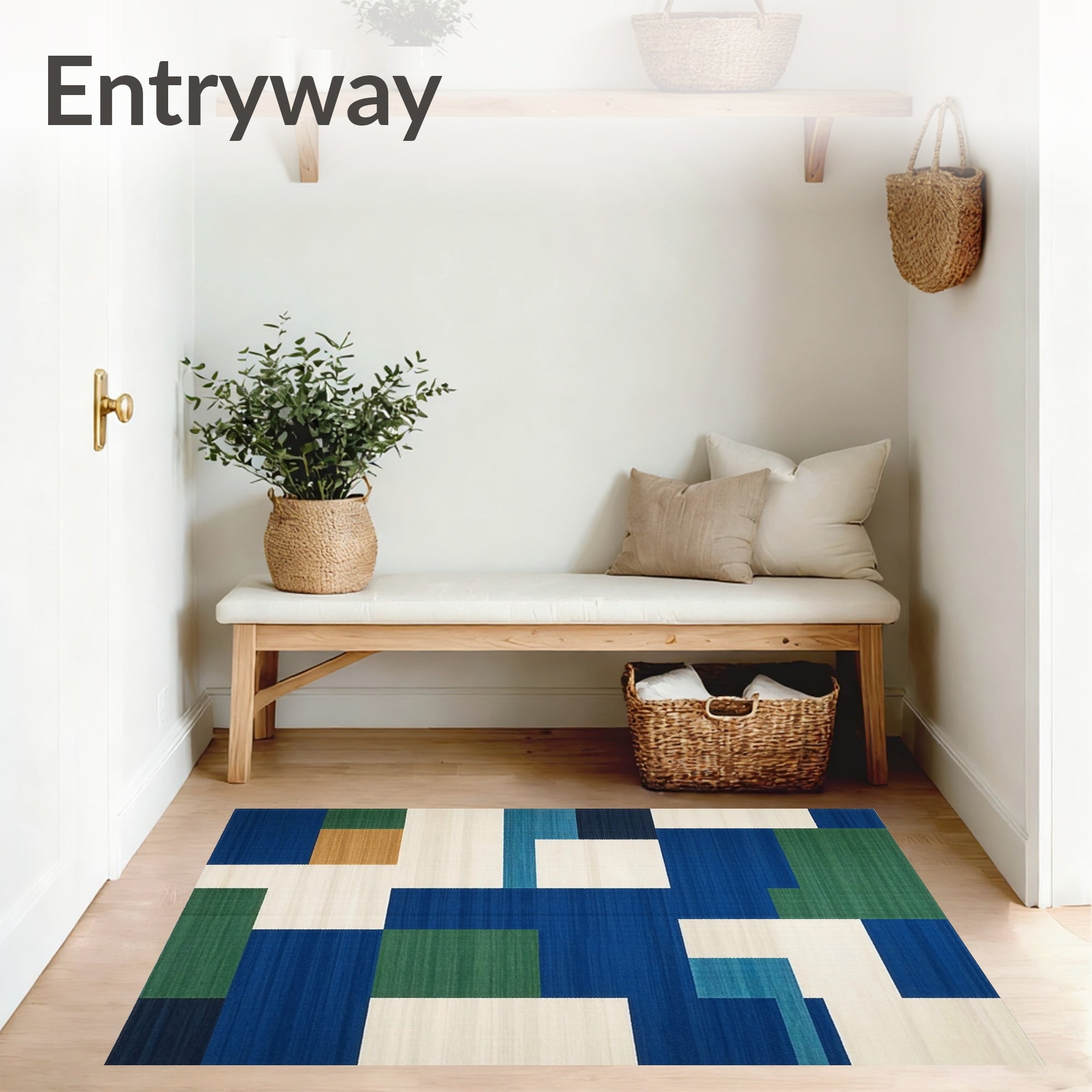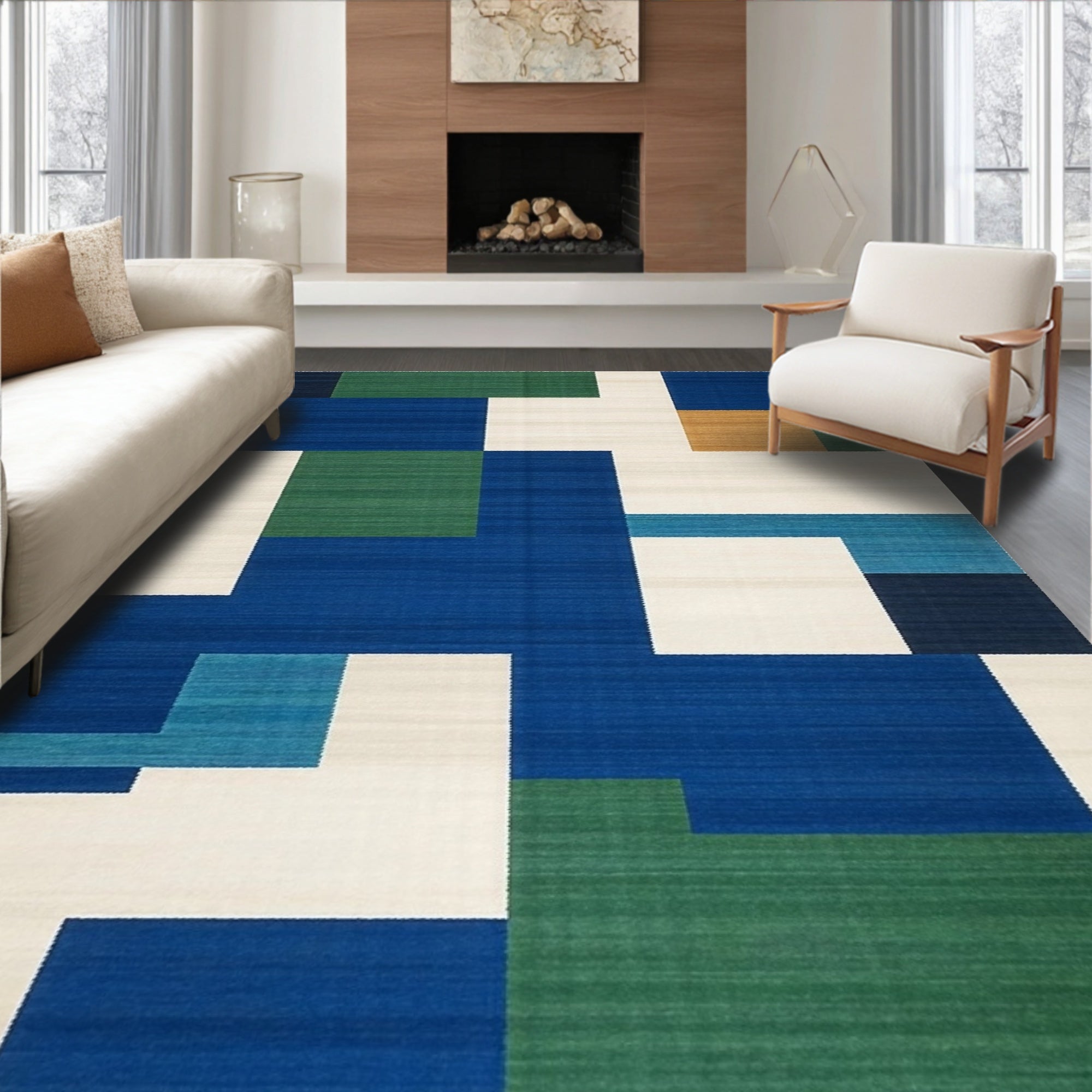 Ultra Soft Area Rug, Non Slip, Stain Resistant, Washable Area Rugs for Living Room, Bedroom, Elegant Blue Green and Beige Abstract Plaid with Irregular Grid Lines(Blue) Overview: